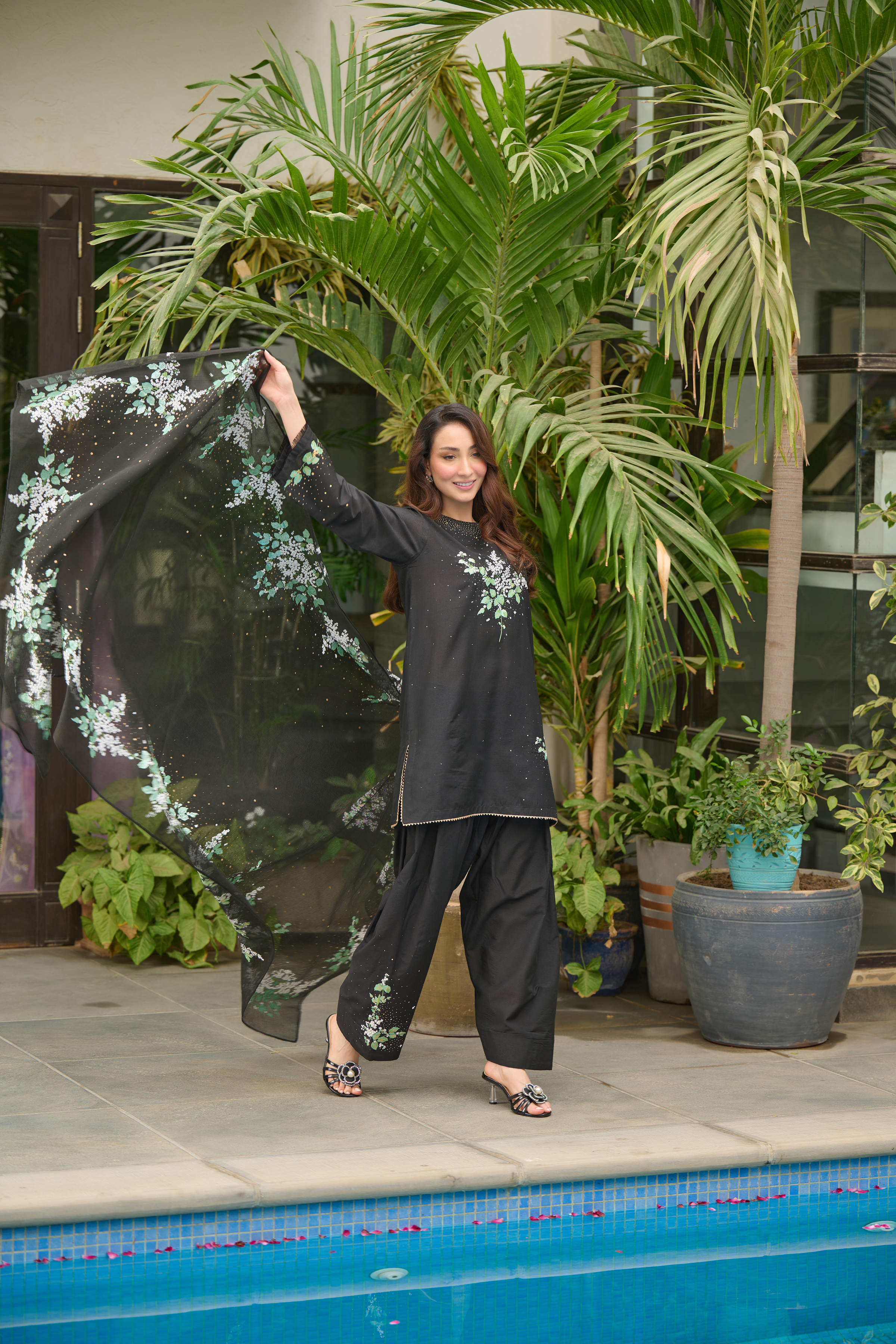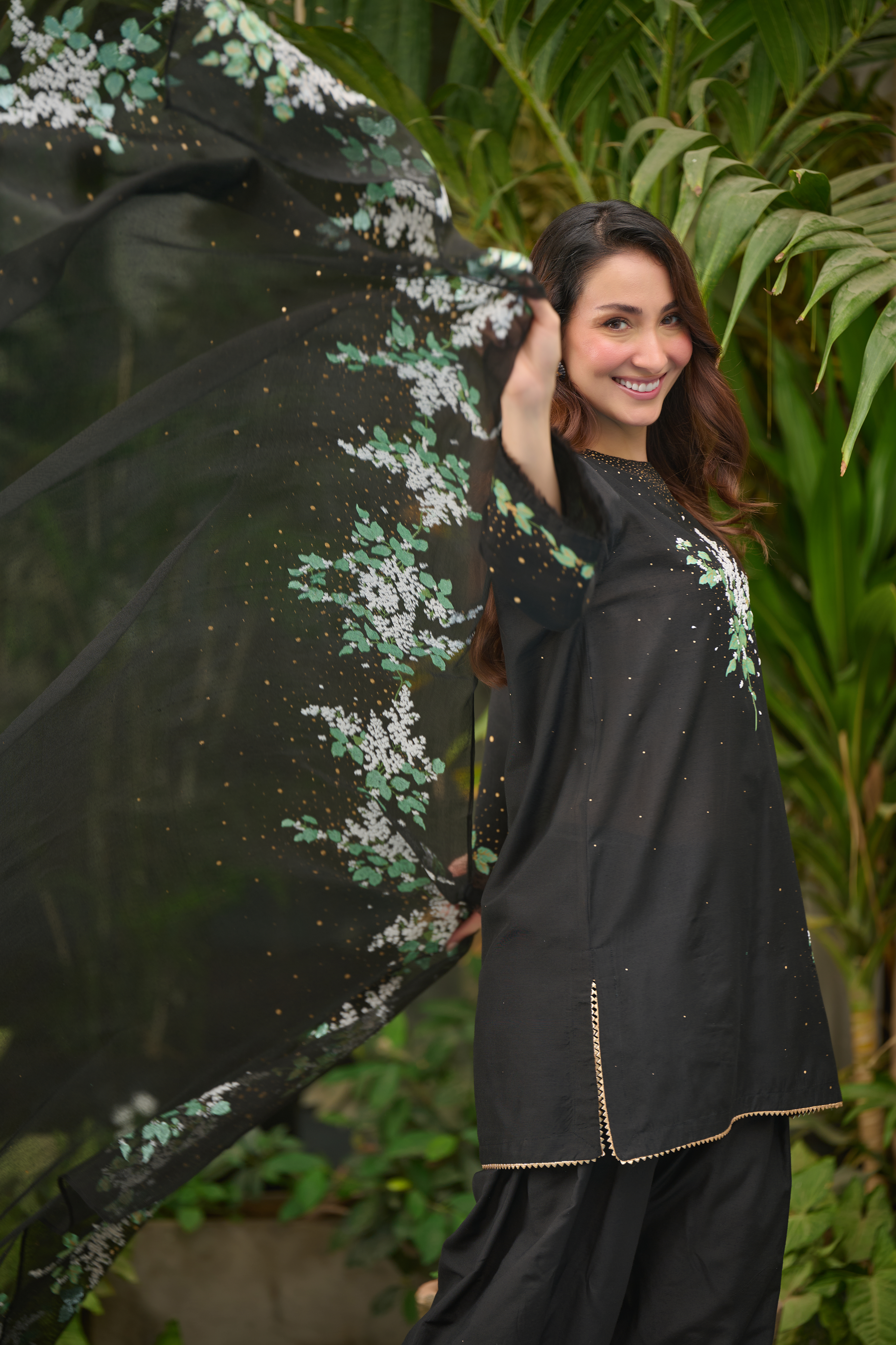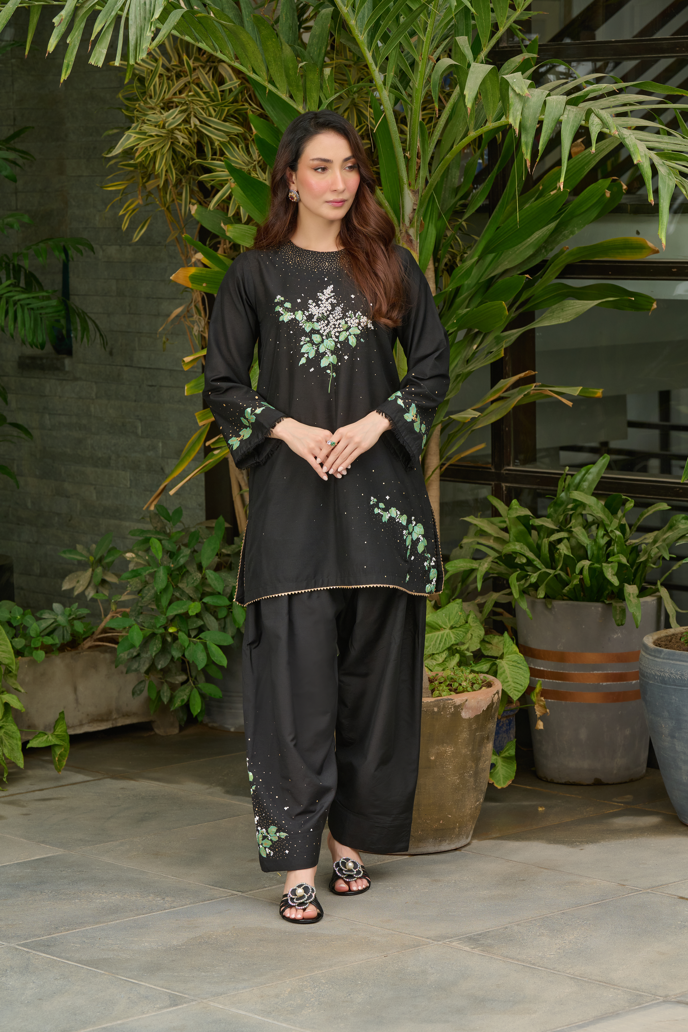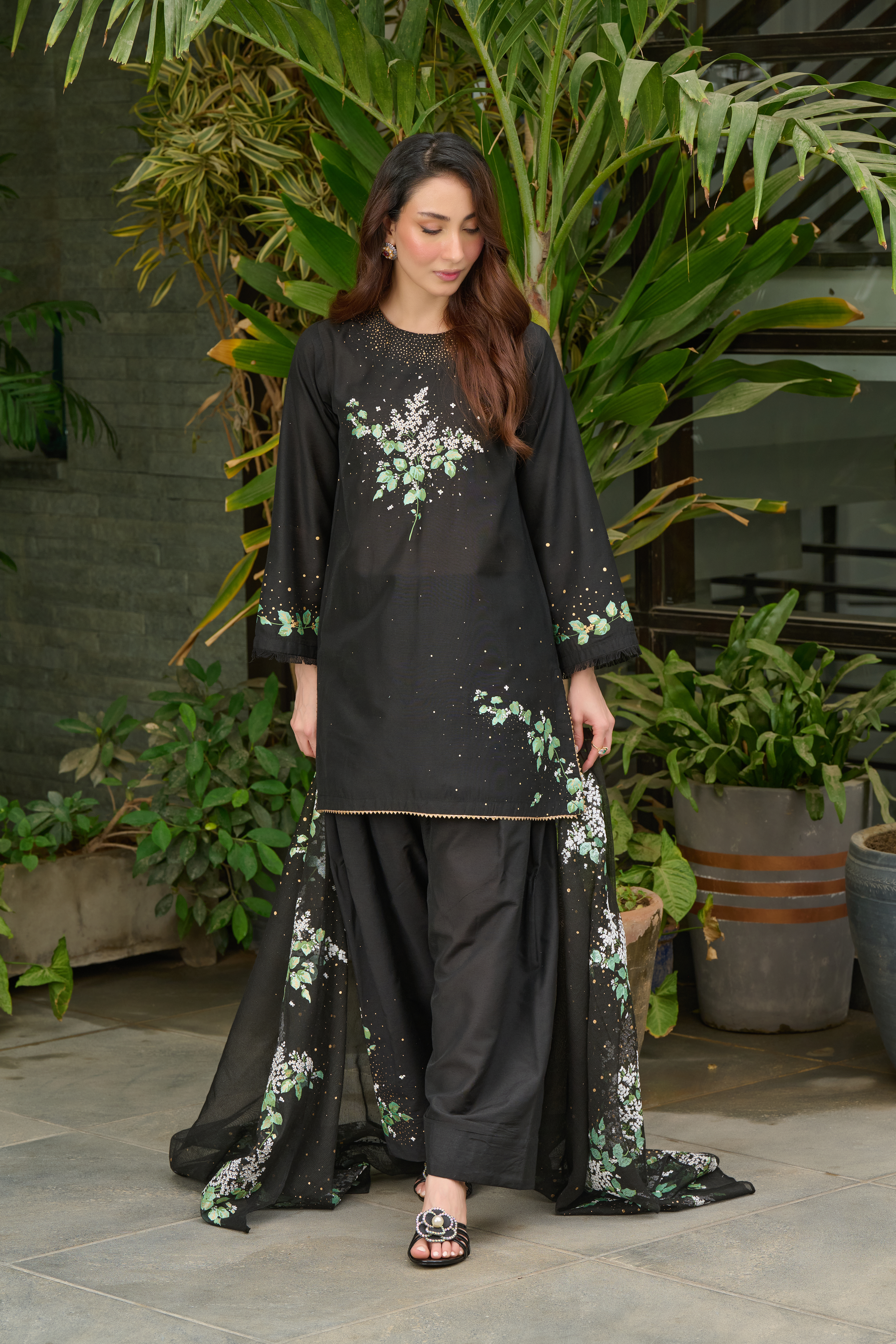 Description: Drape yourself in Black set–this luxurious black piece is adorned with intricate hand-screen prints in white and green hues. The delicate detailing adds a touch of timeless sophistication, making it perfect for both daytime grace and evening allure. Crafted from premium fabric, it ensures effortless comfort while exuding modern ethnic charm. Pair it with statement accessories for a refined look or keep it minimal for understated elegance.
