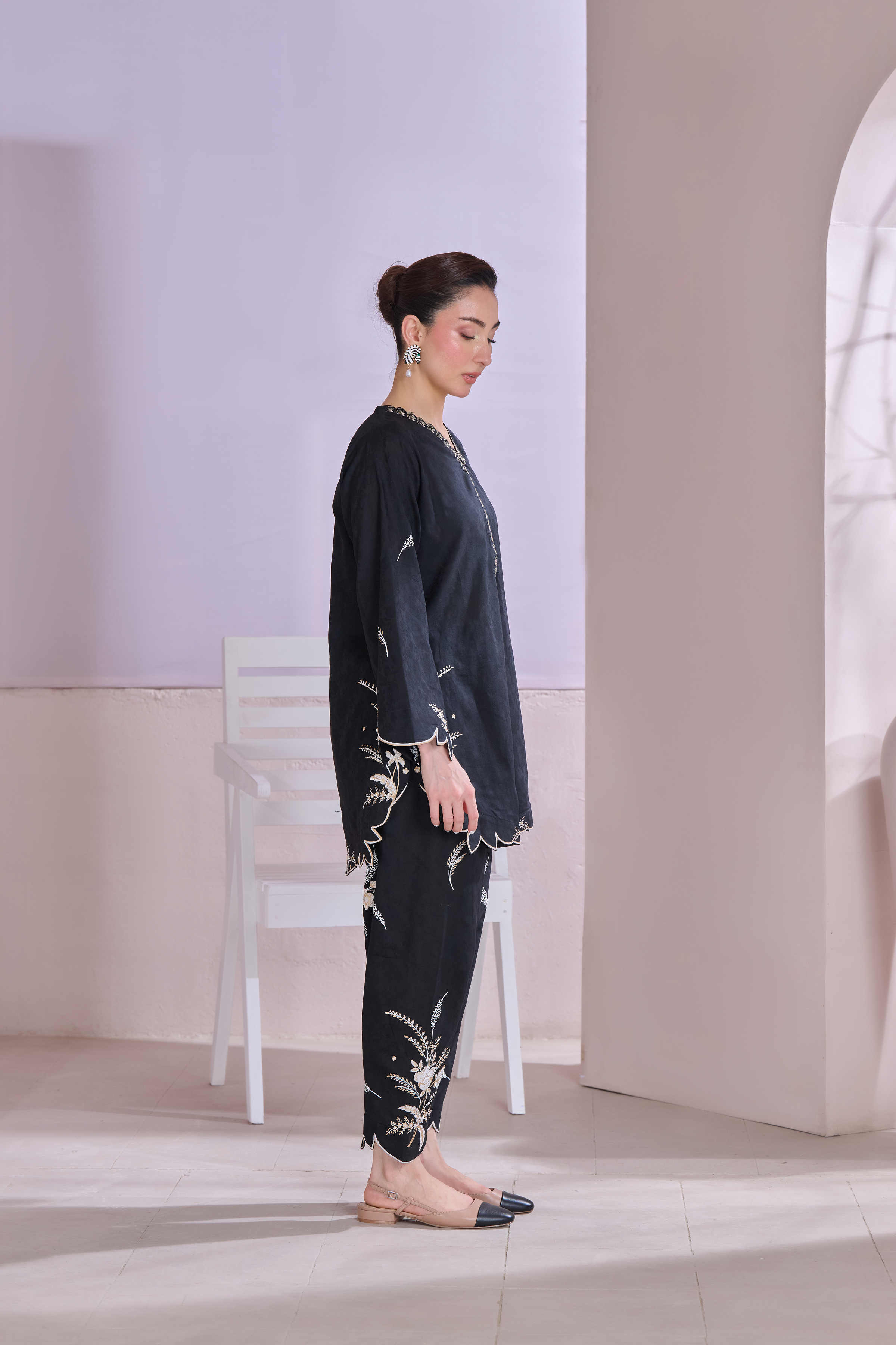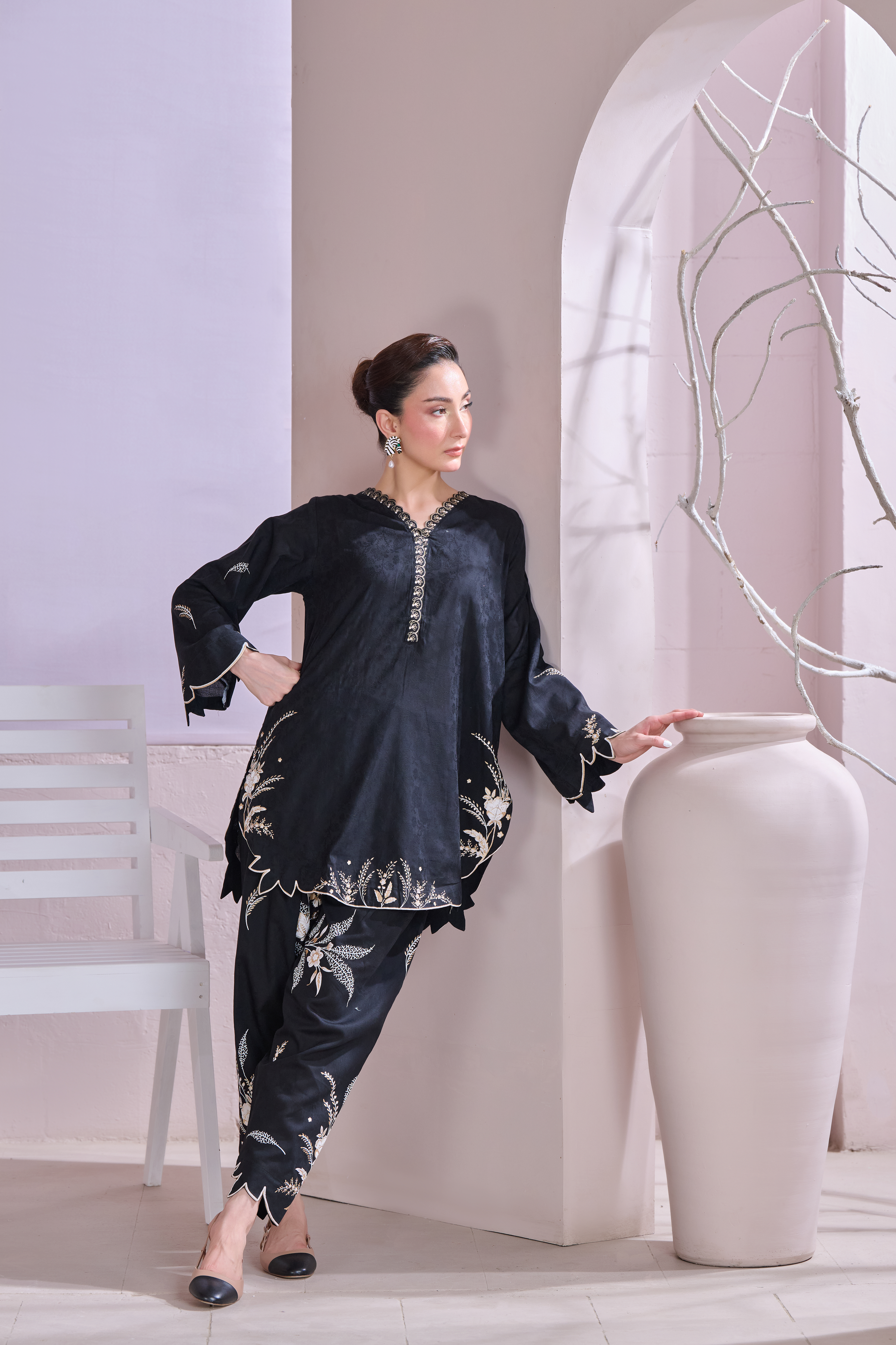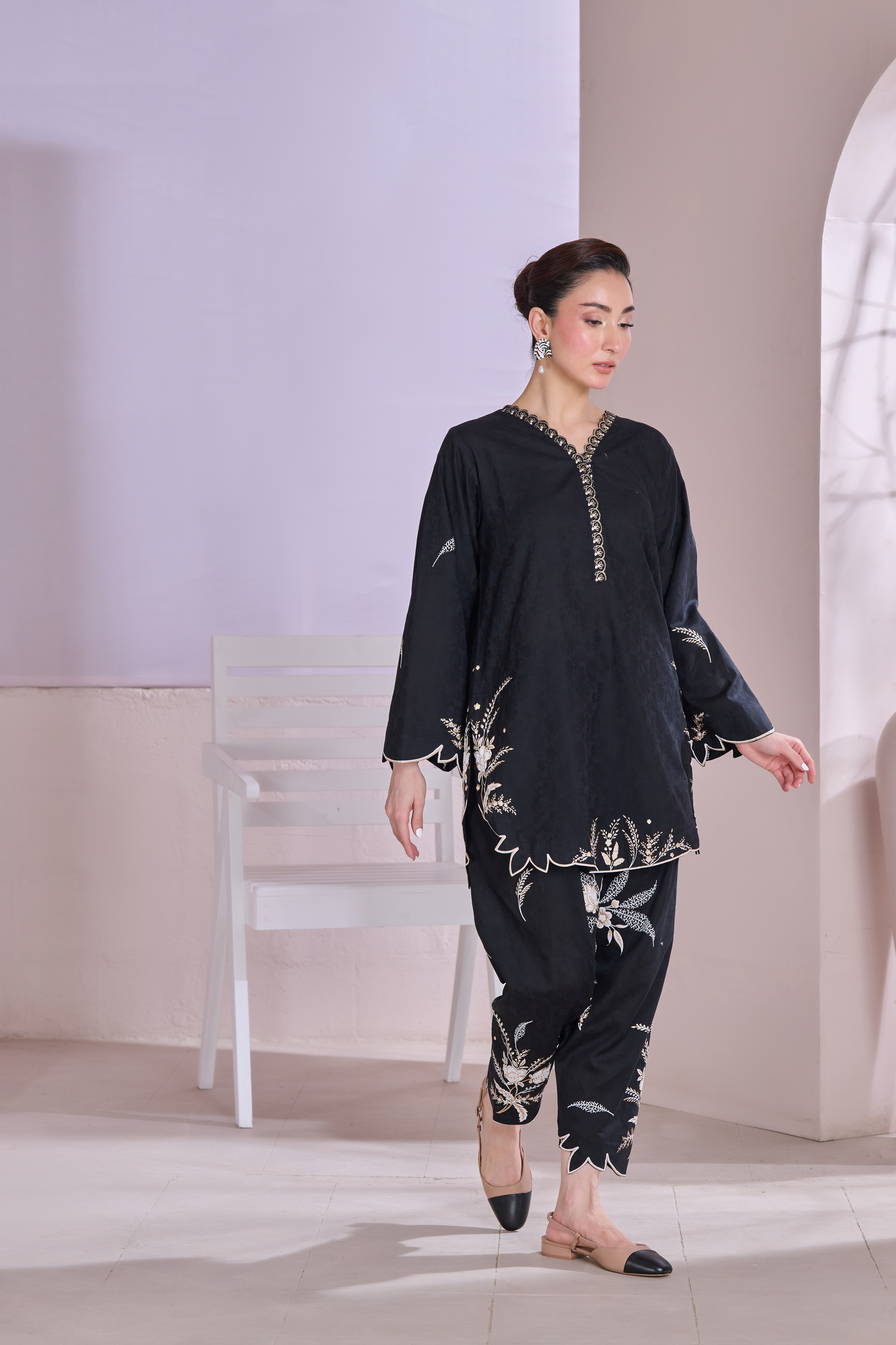 Description: This outfit features a rich black jacquard fabric with contemporary floral patterns screen printed in shades of off-white and gold, adding a refined contrast to the dark base. The scalloped edges on the sleeves, hem, and pant cuffs add a stylish touch. Off White is embossed while the gold detailing around the neckline brings in a bit of shine without being too bold. It's a balanced look—modern, elegant, and perfect for both day or evening wear.
