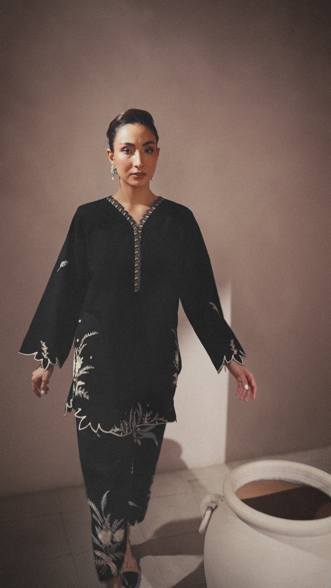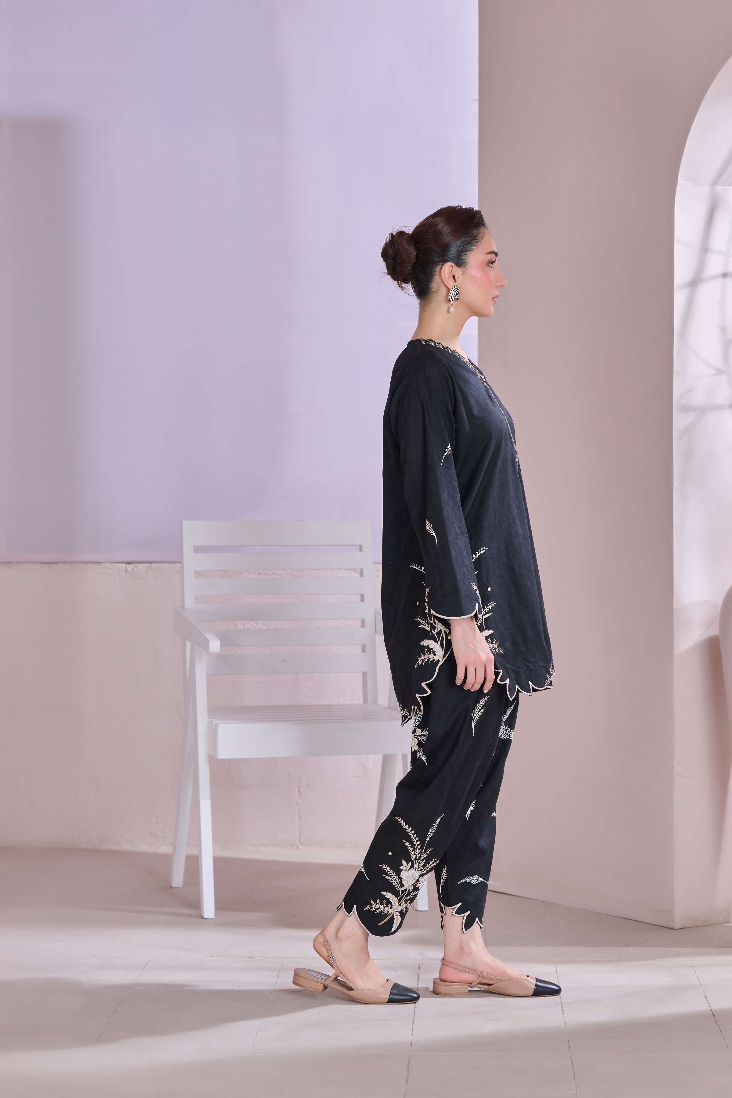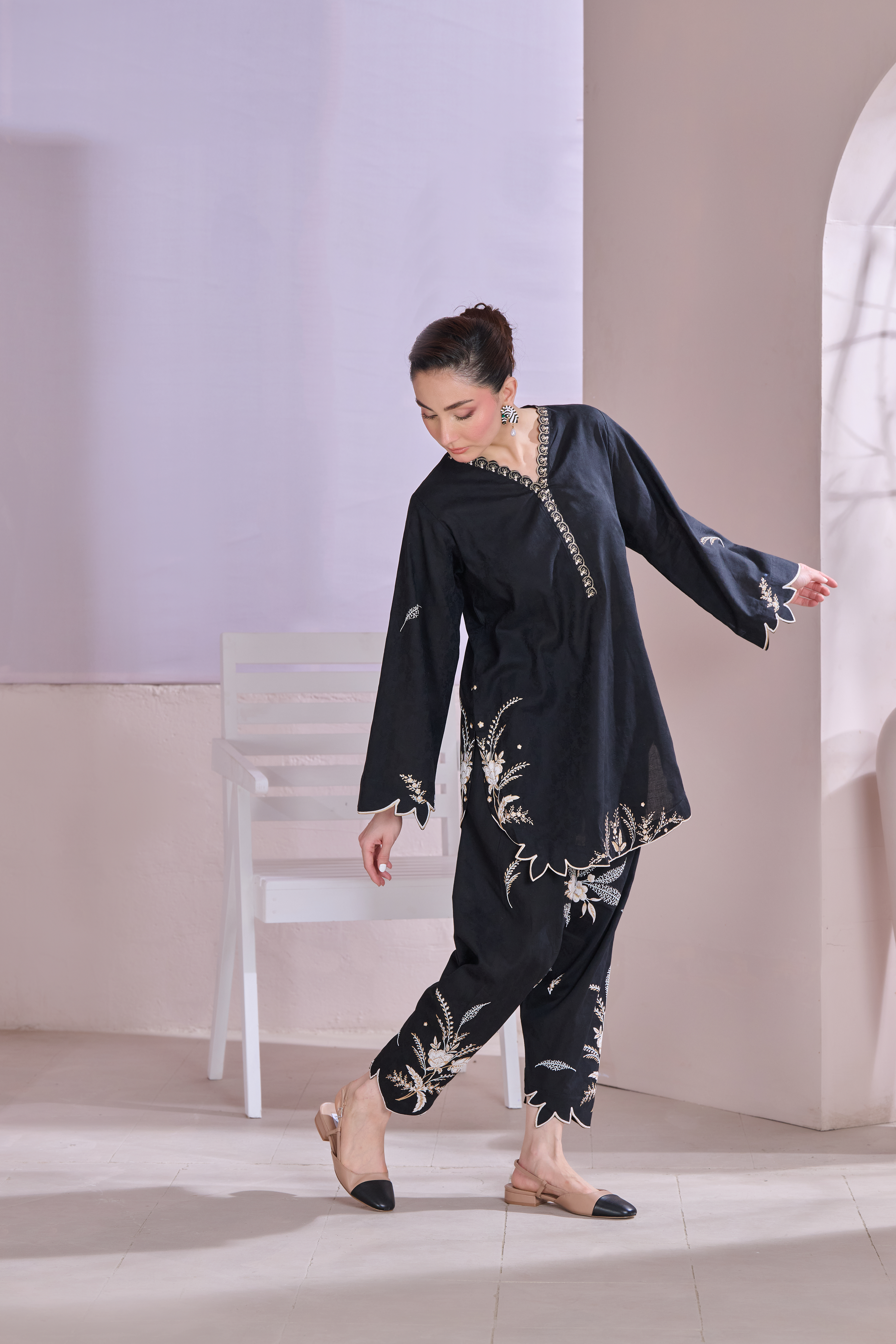 Description: This outfit features a rich black jacquard fabric with contemporary floral patterns screen printed in shades of off-white and gold, adding a refined contrast to the dark base. The scalloped edges on the sleeves, hem, and pant cuffs add a stylish touch. Off White is embossed while the gold detailing around the neckline brings in a bit of shine without being too bold. It's a balanced look—modern, elegant, and perfect for both day or evening wear.