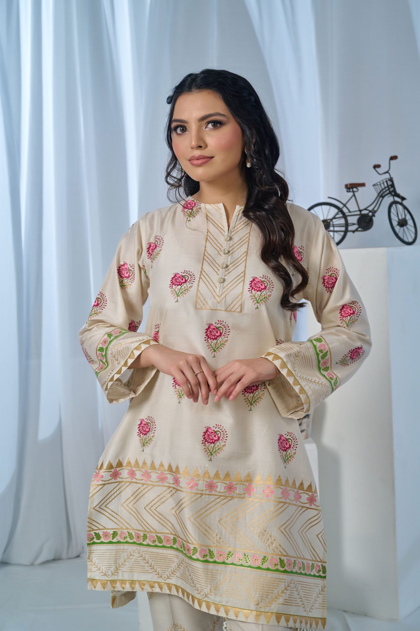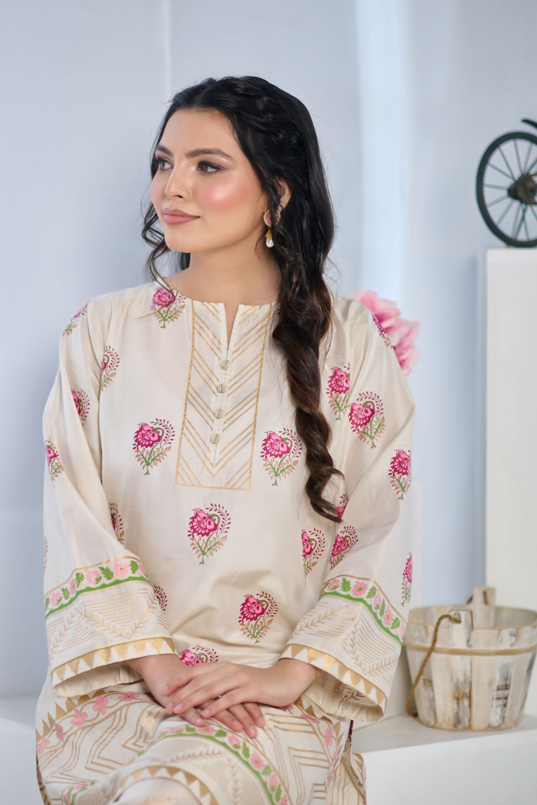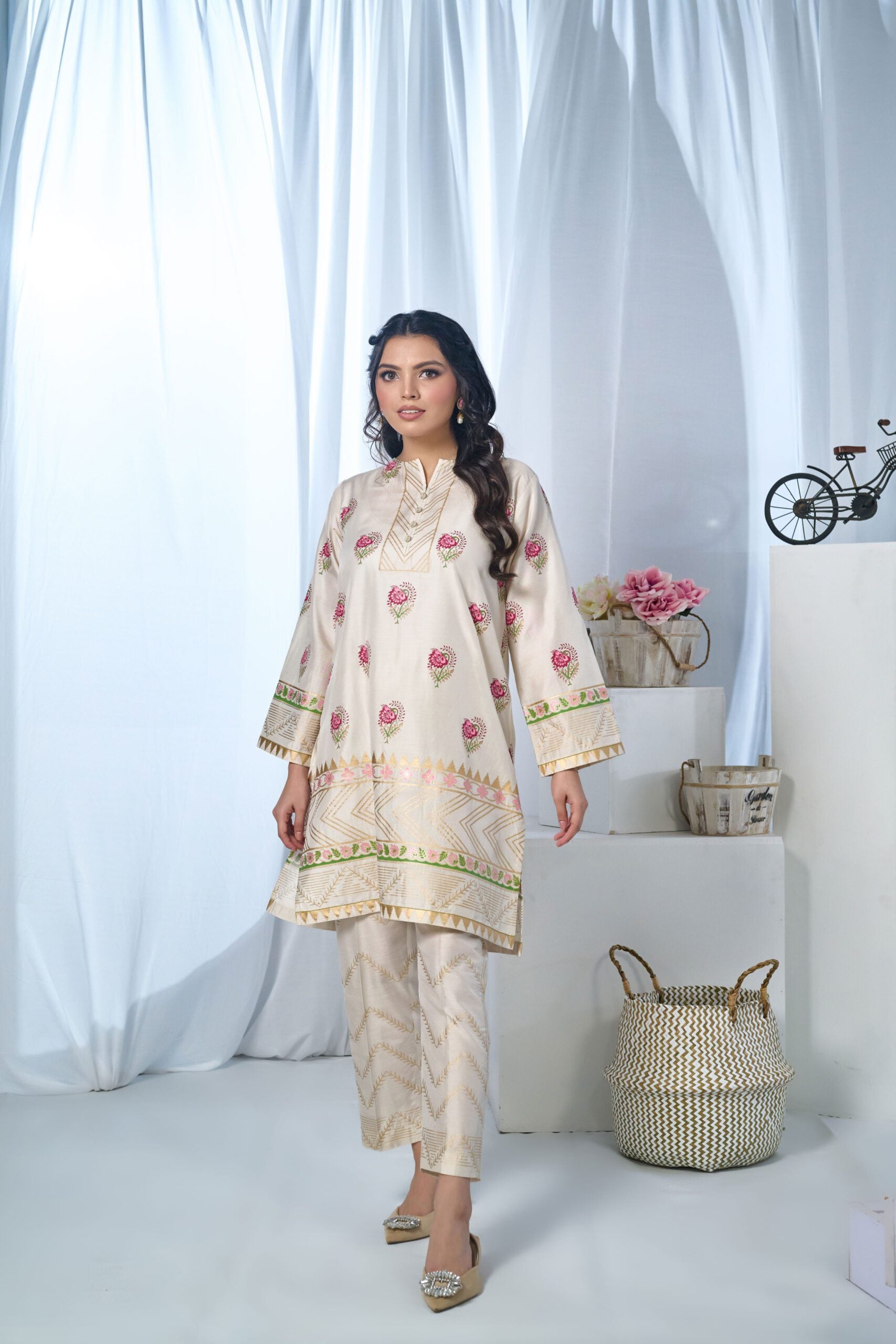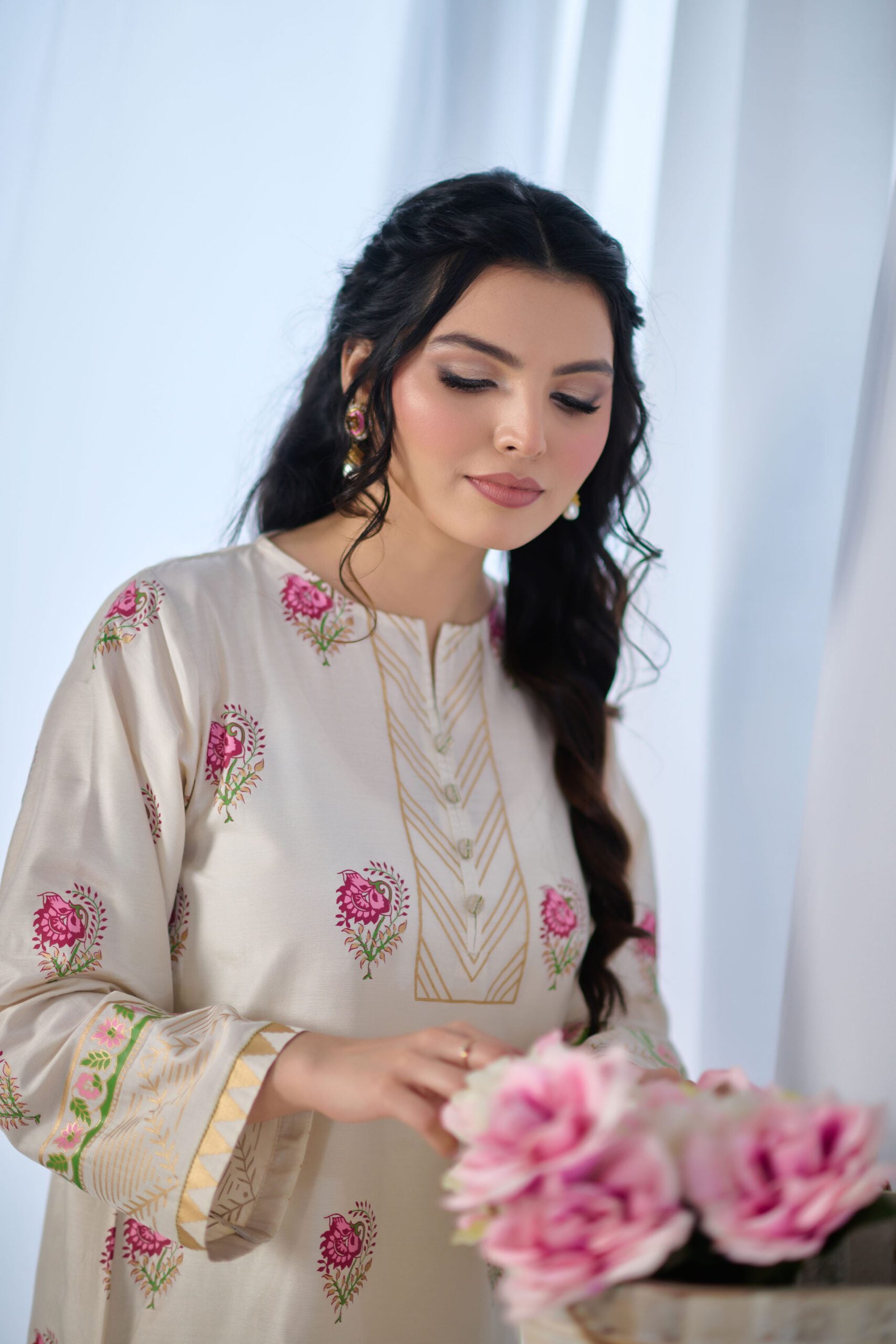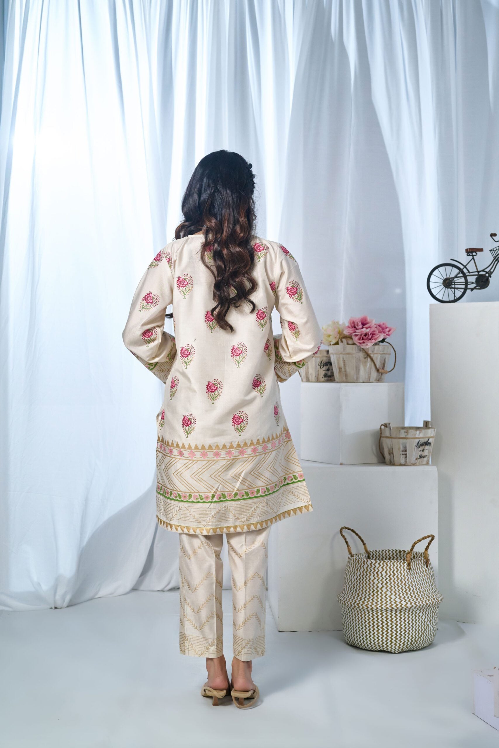 Pearl white shirt and pant enhanced with soothing floral hand screen printed for classic look.