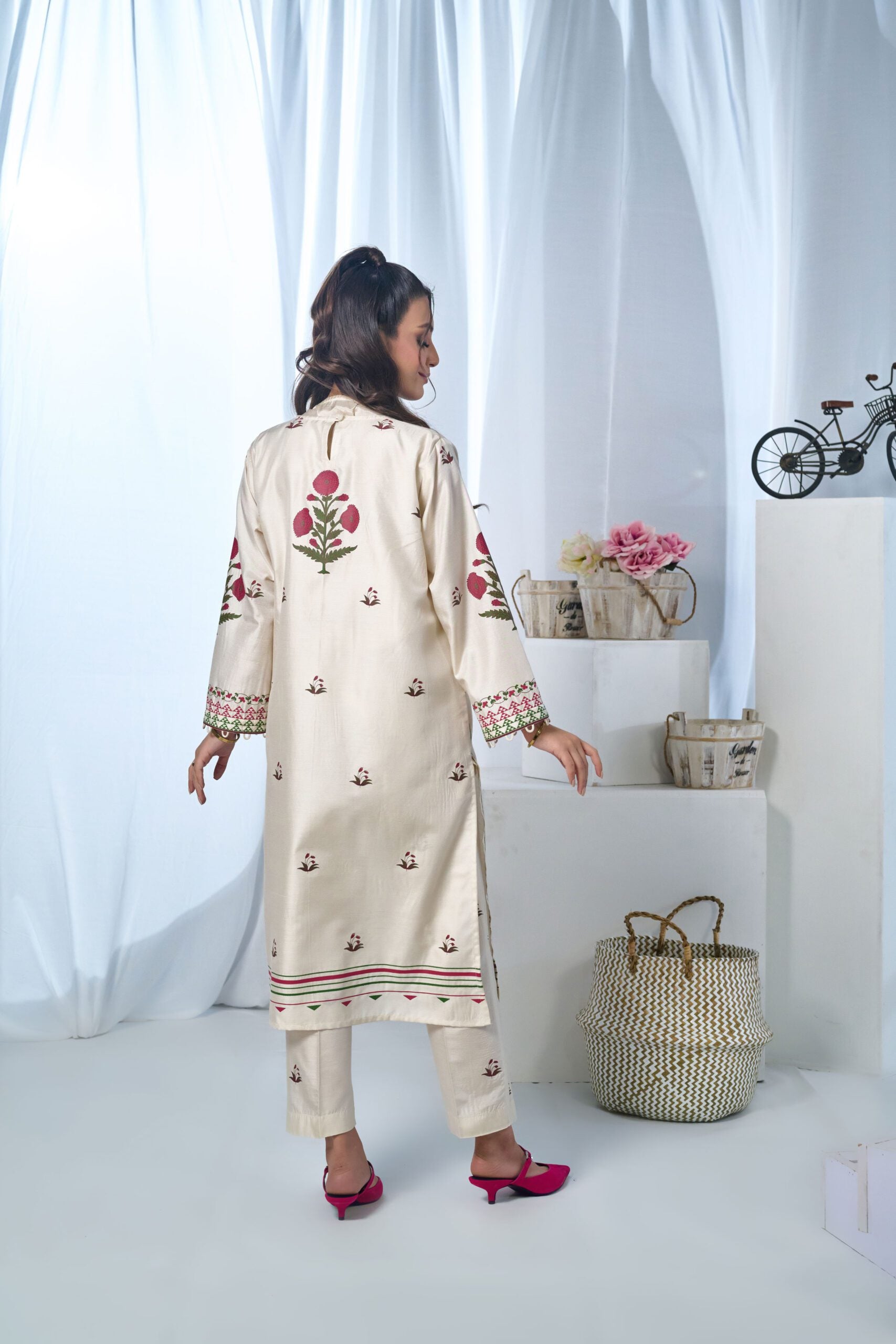 Pearl white shirt enhanced with soothing floral hand screen printed for classic look.