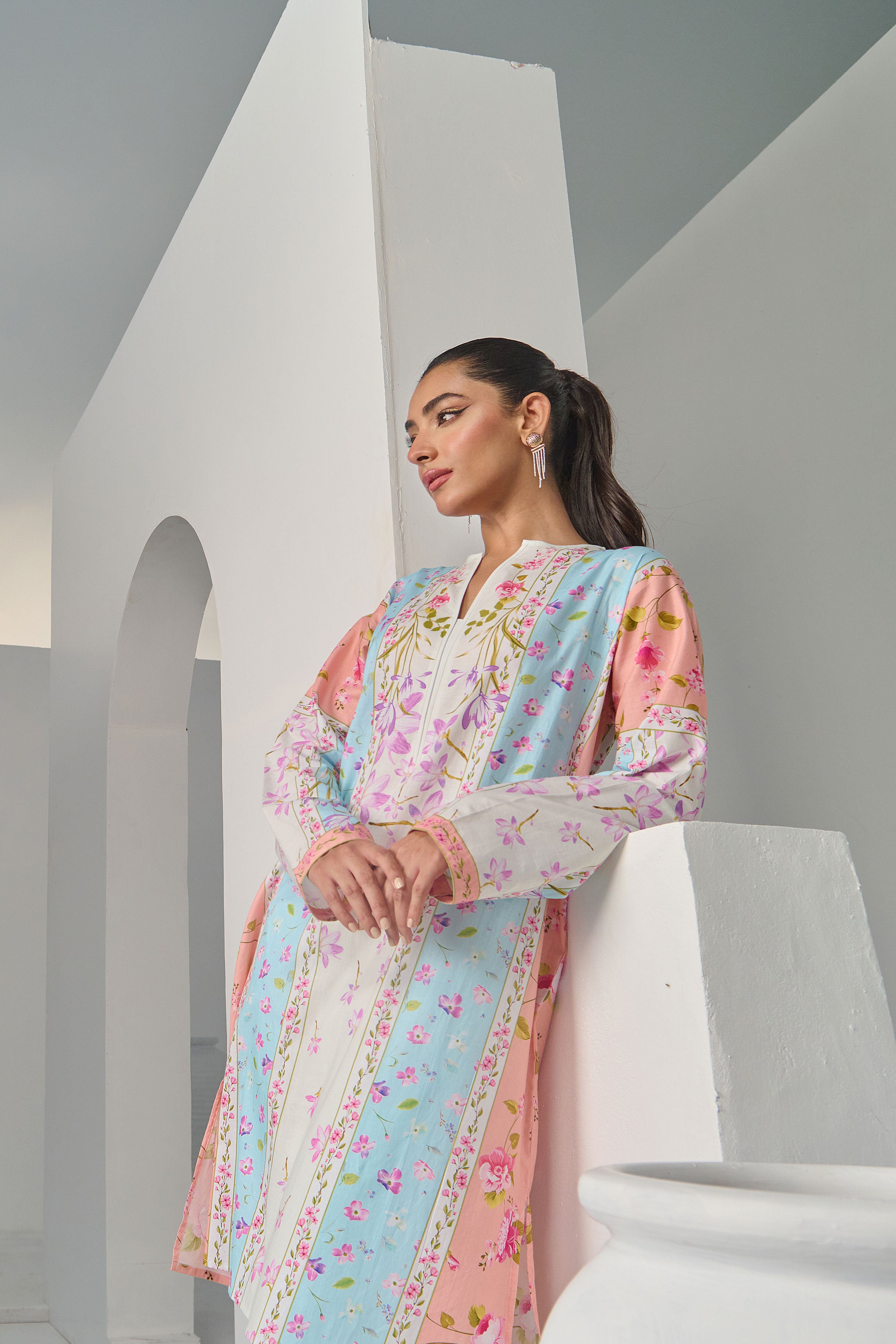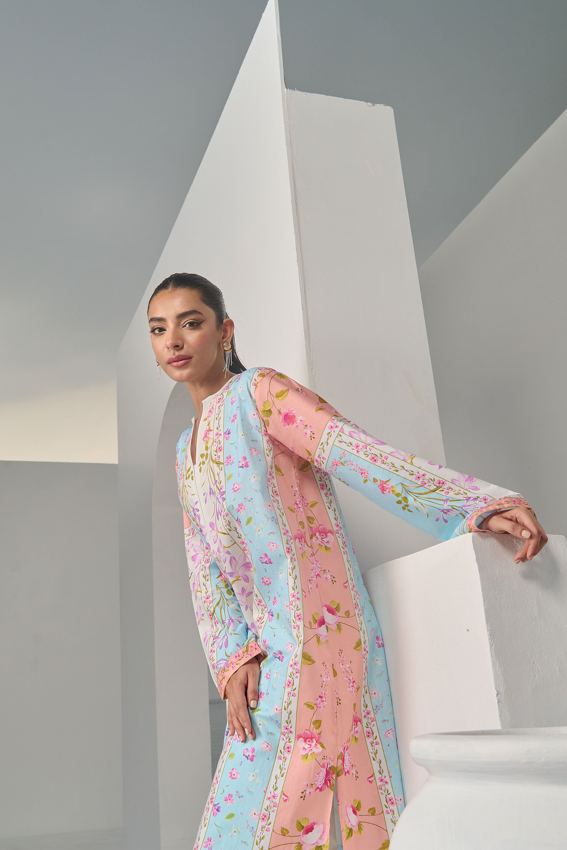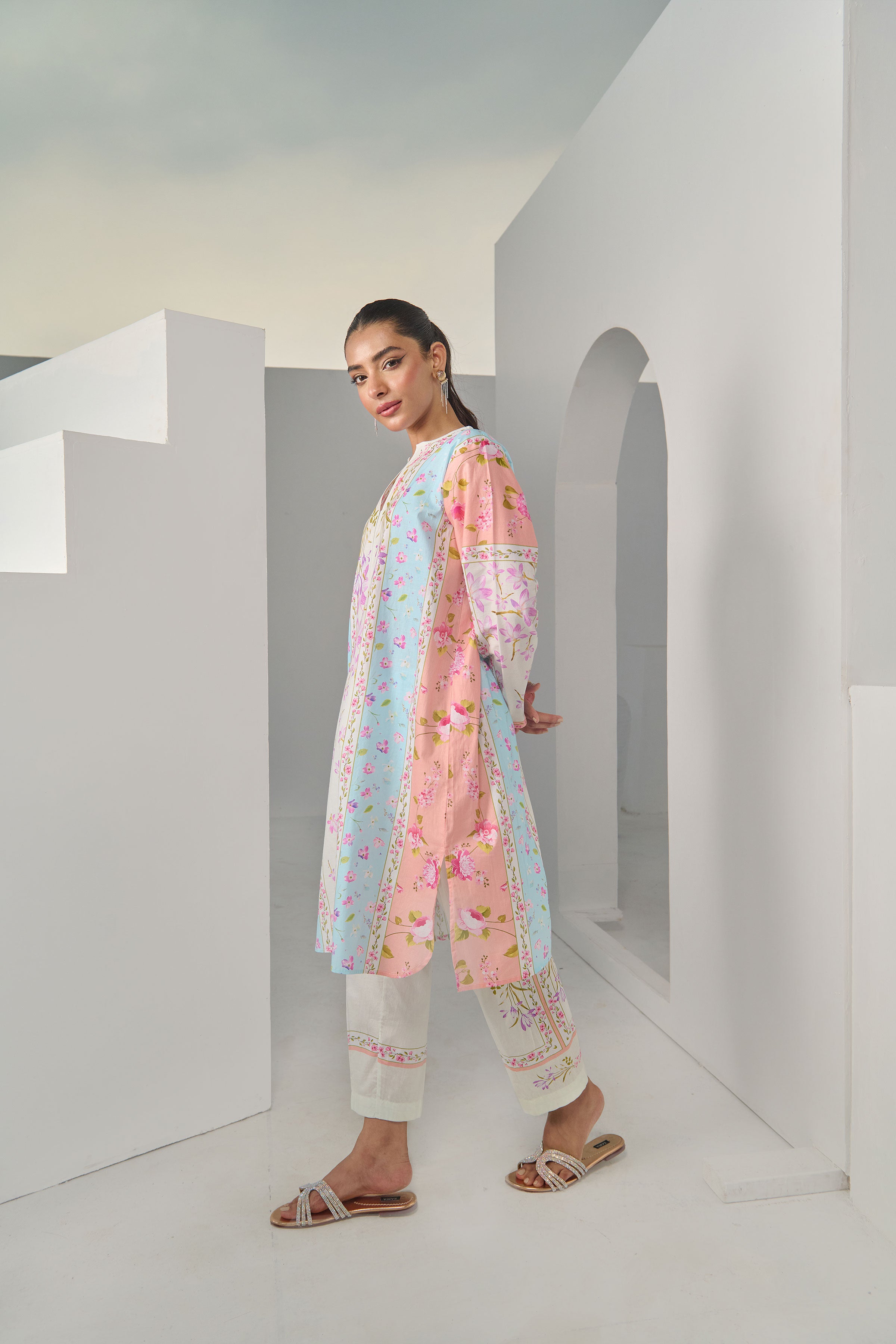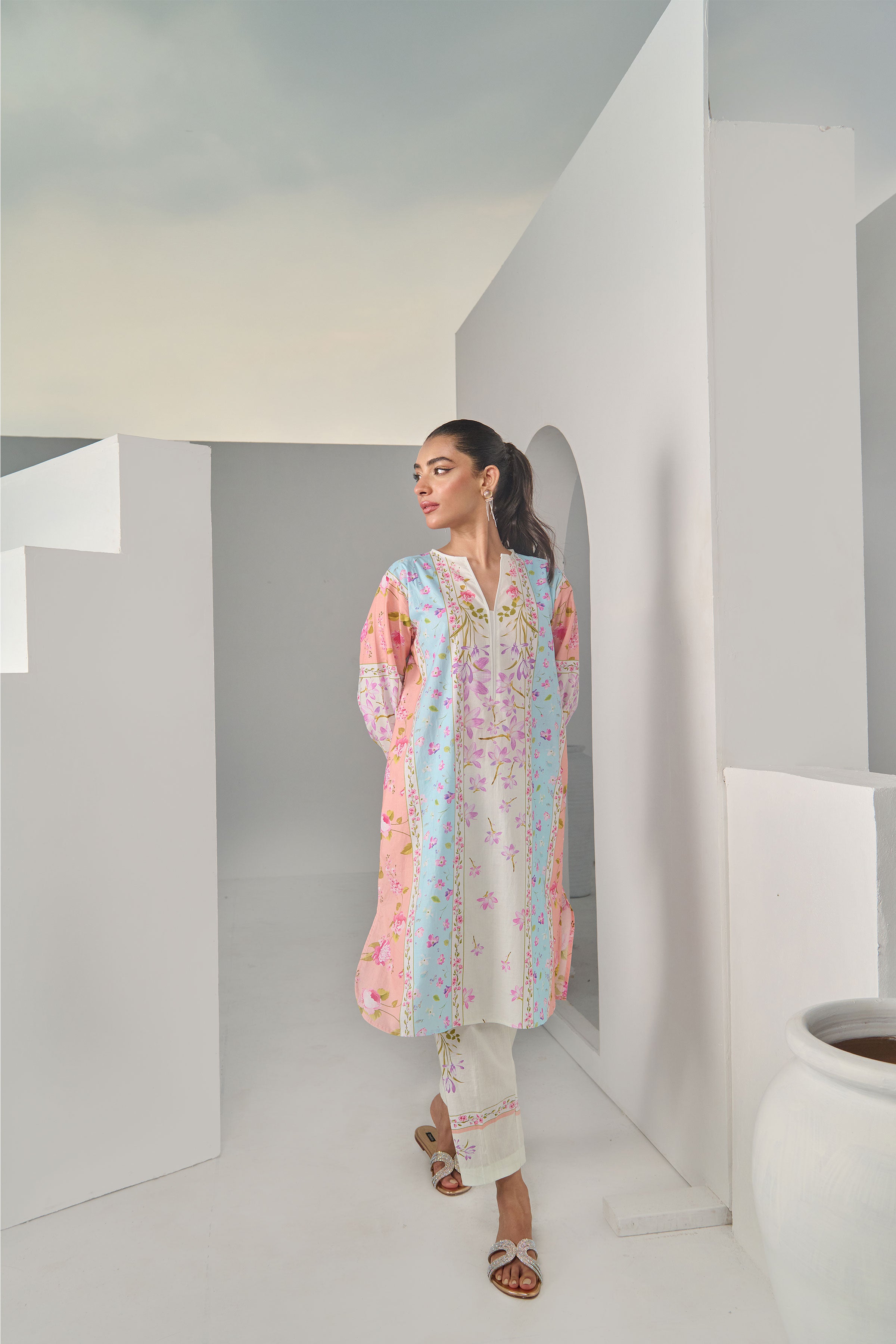 Color: Peach and Offwhite with multi colour Flowers
