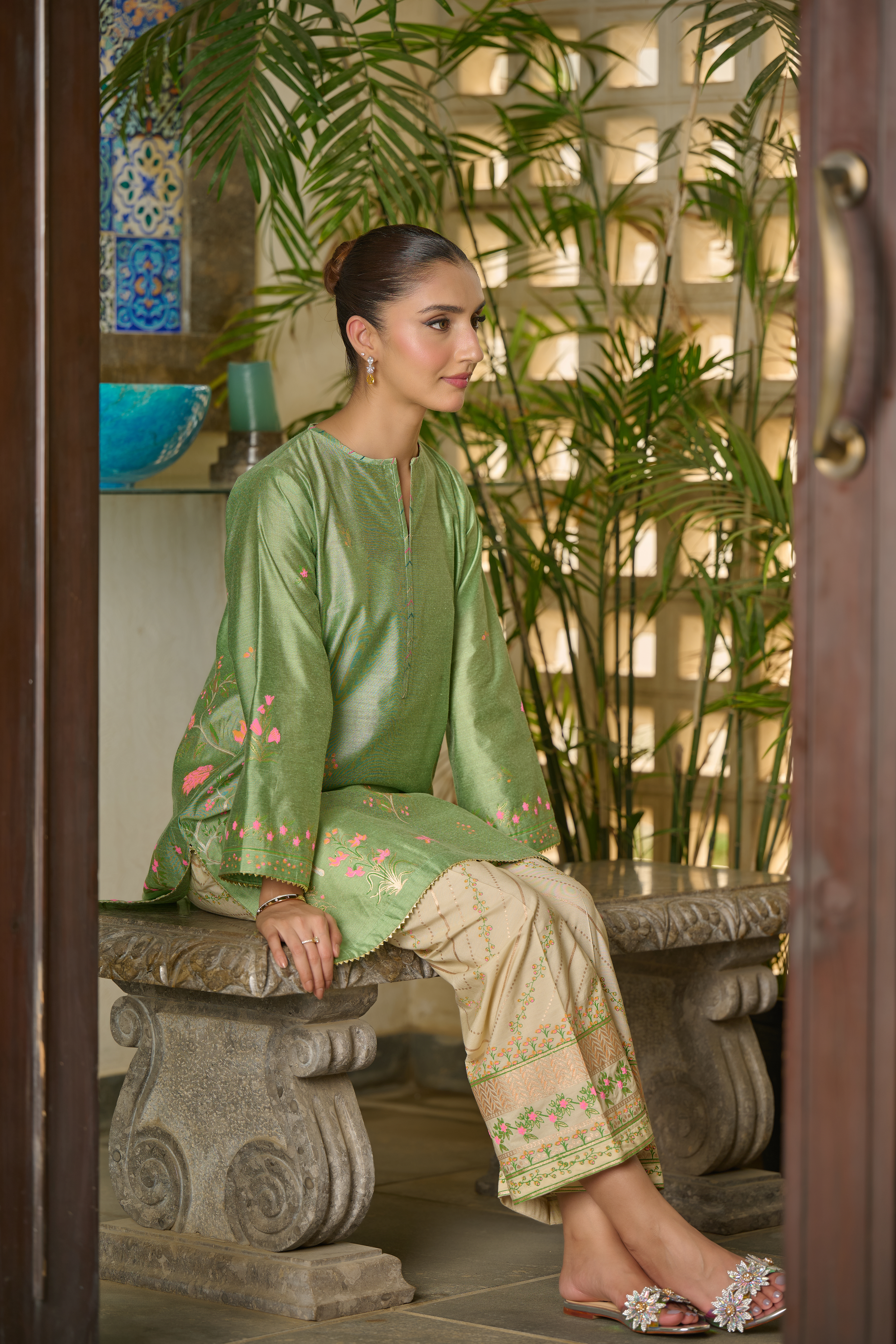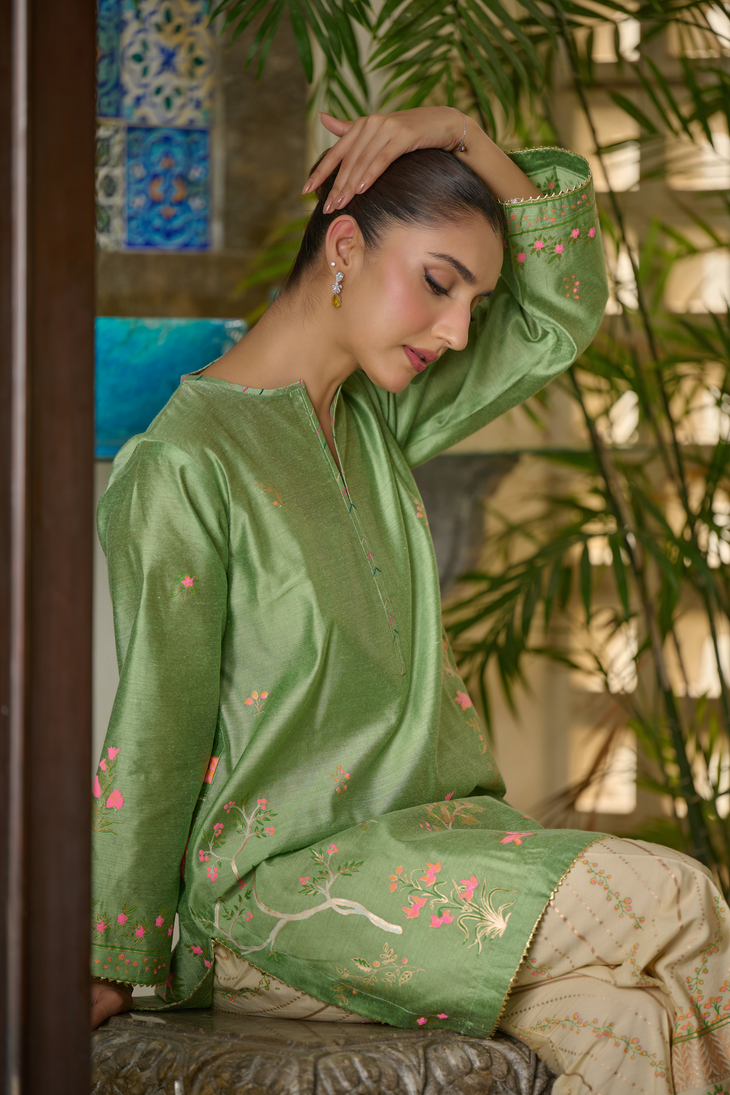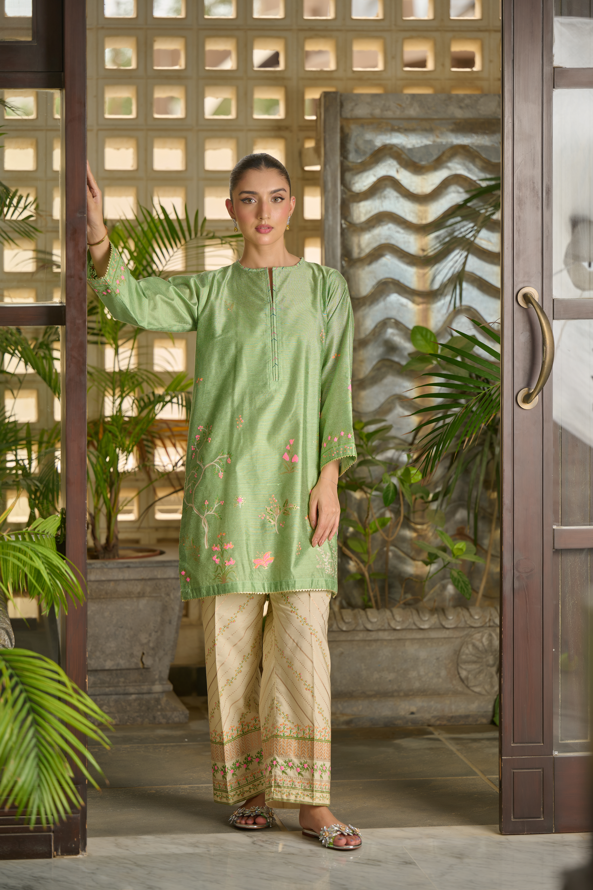 Description: Drape yourself in Green and Beige set– Drape yourself in green and Off-white set– this luxurious green piece is adorned with intricated pearl hand screen print. The details make it perfect for daytime grace and evening allure. Crafted from premium fabric, it ensure effortless comfort while exuding modern ethnic charm.