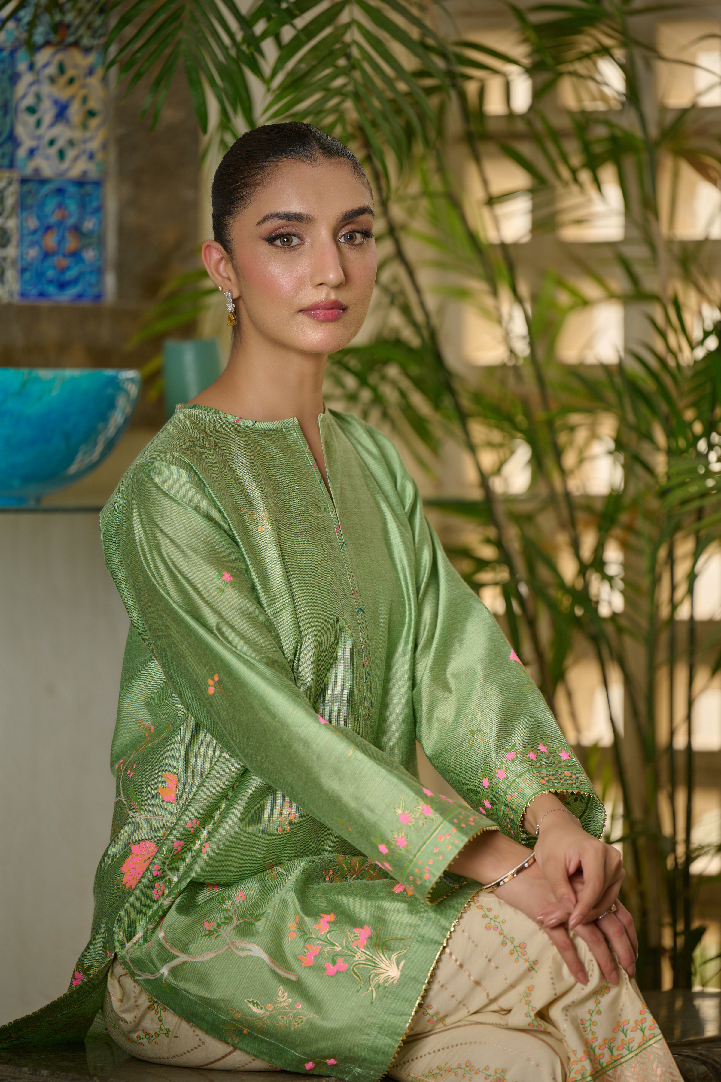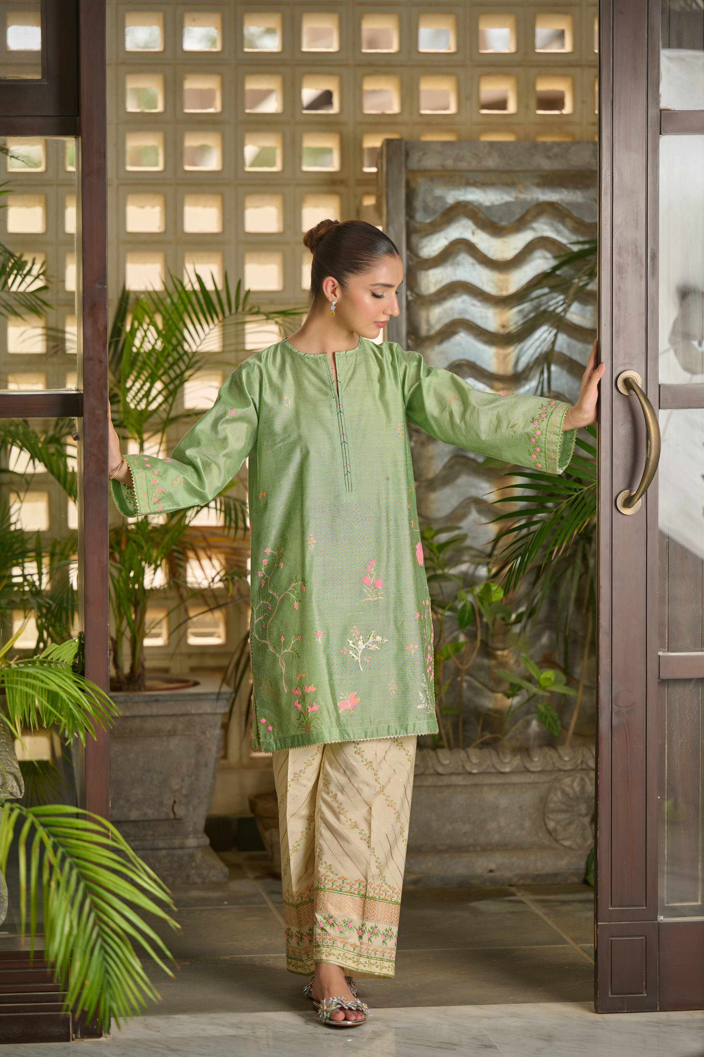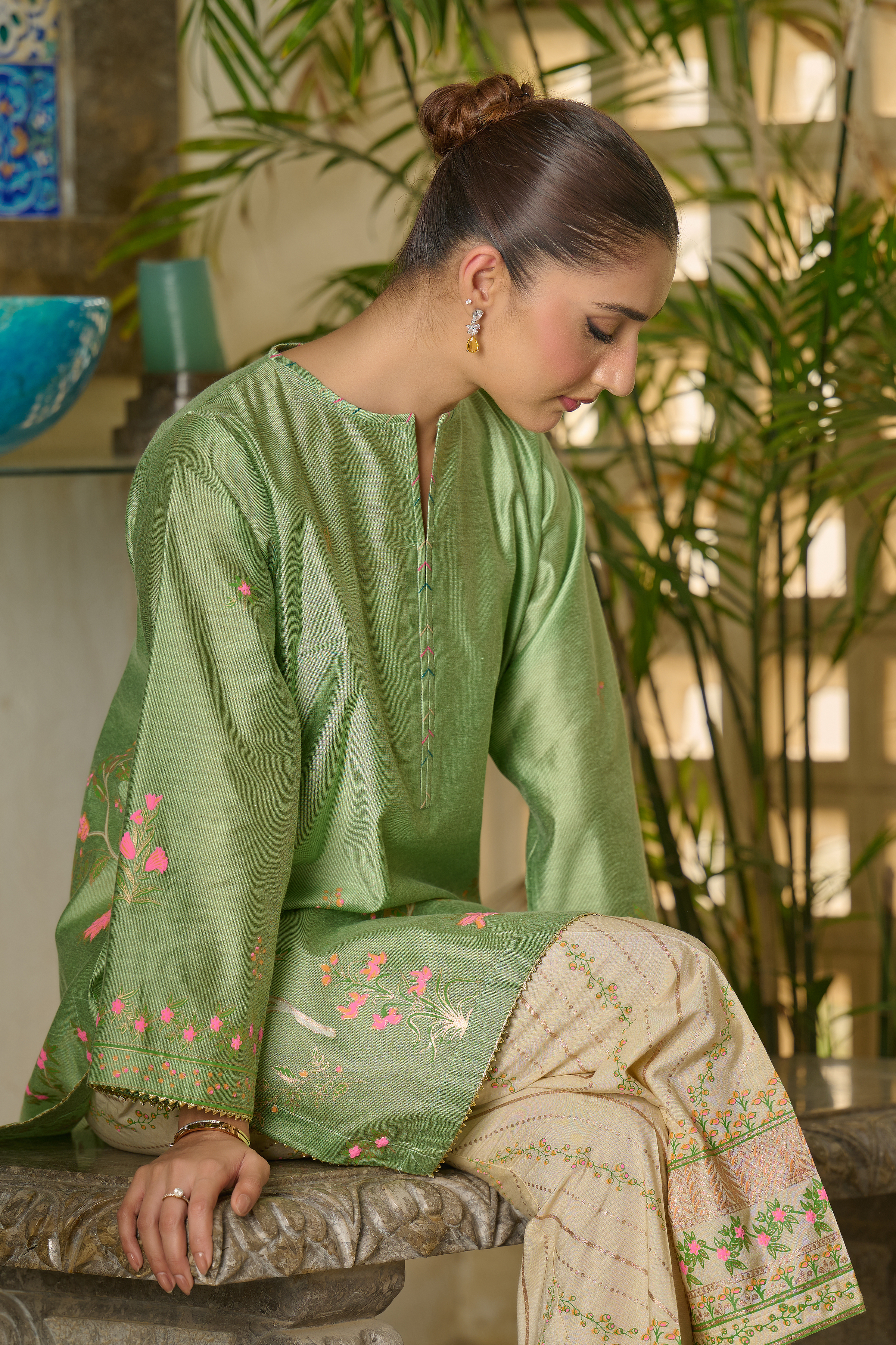 Description: Drape yourself in Green and Beige set– Drape yourself in green and Off-white set– this luxurious green piece is adorned with intricated pearl hand screen print. The details make it perfect for daytime grace and evening allure. Crafted from premium fabric, it ensure effortless comfort while exuding modern ethnic charm.