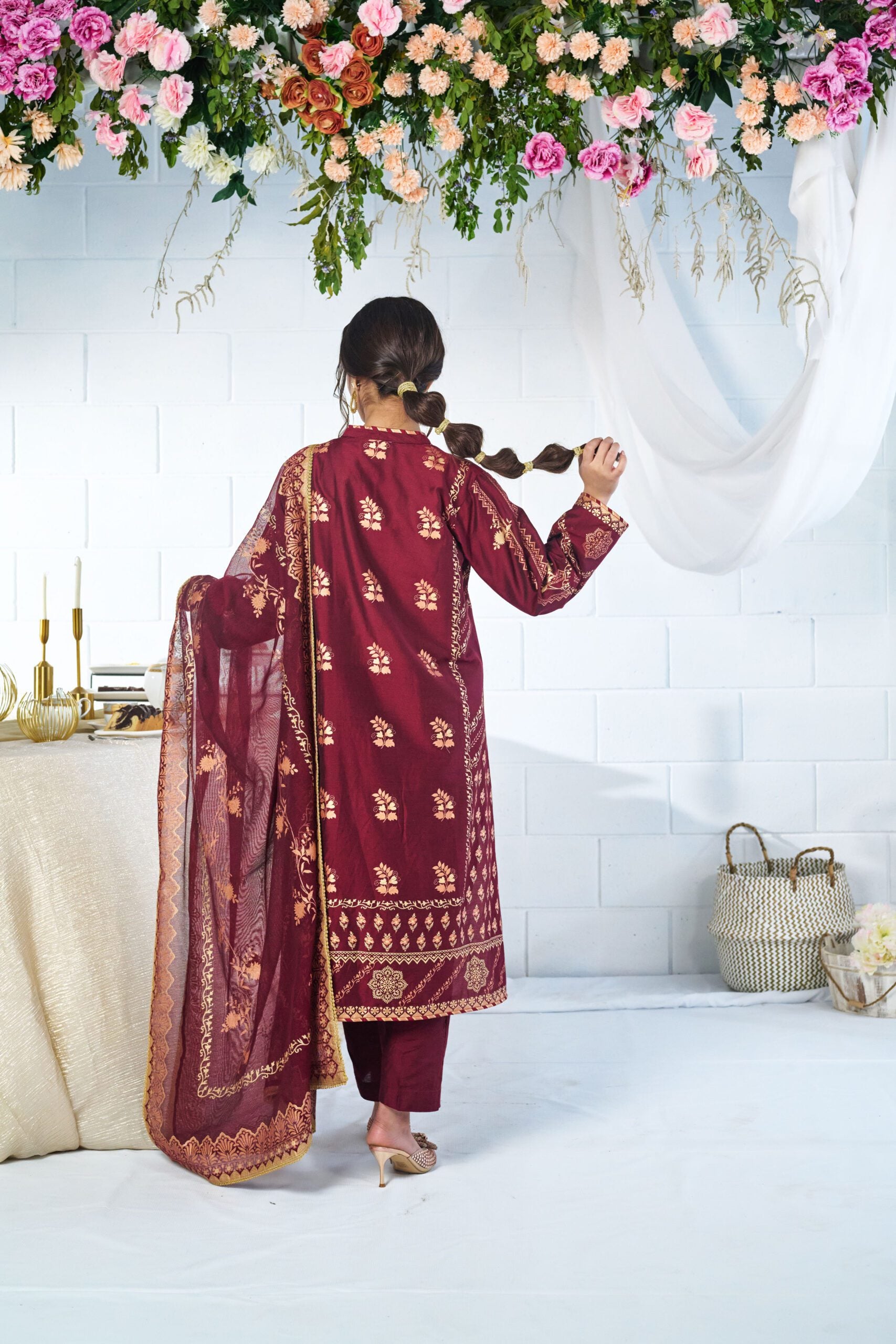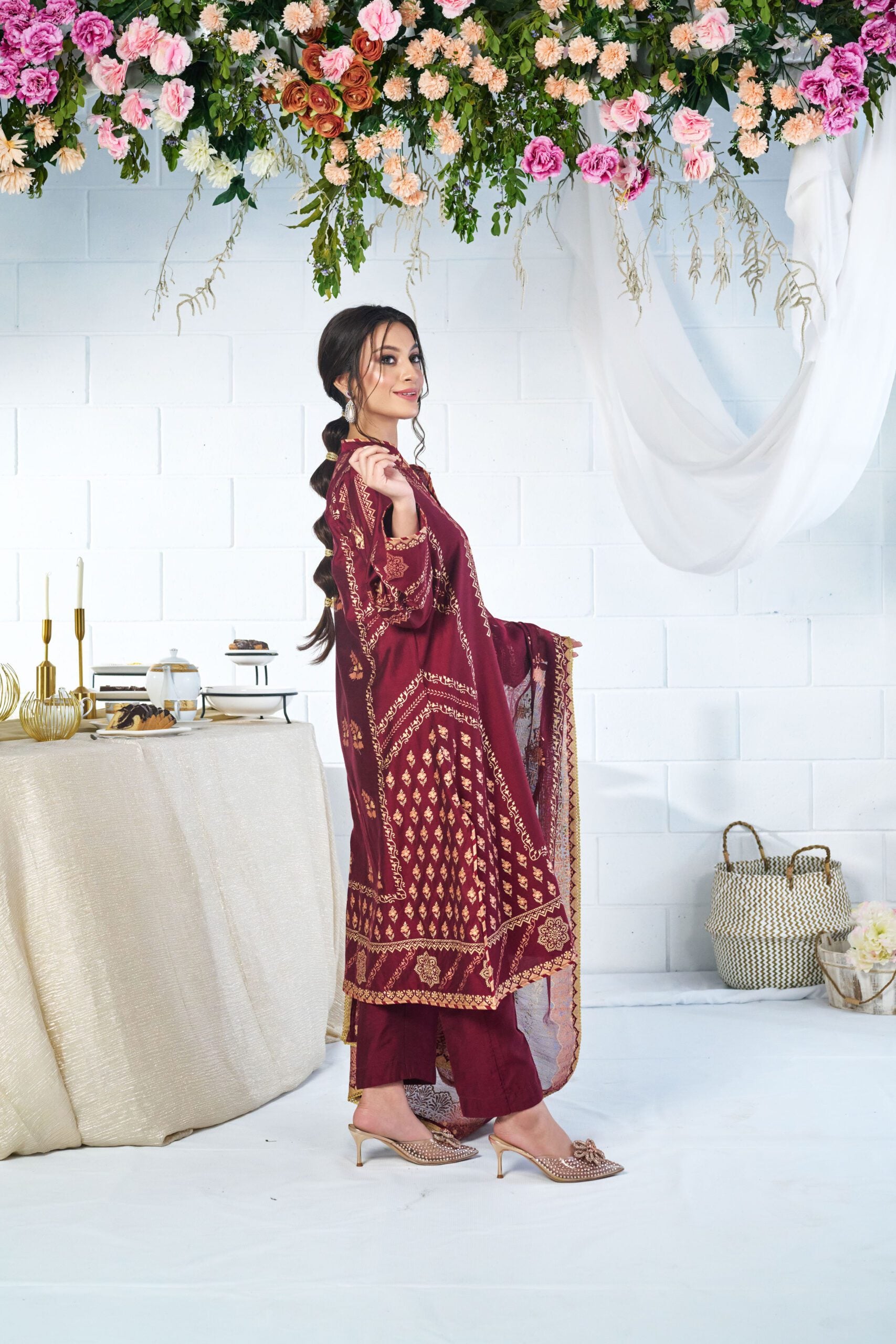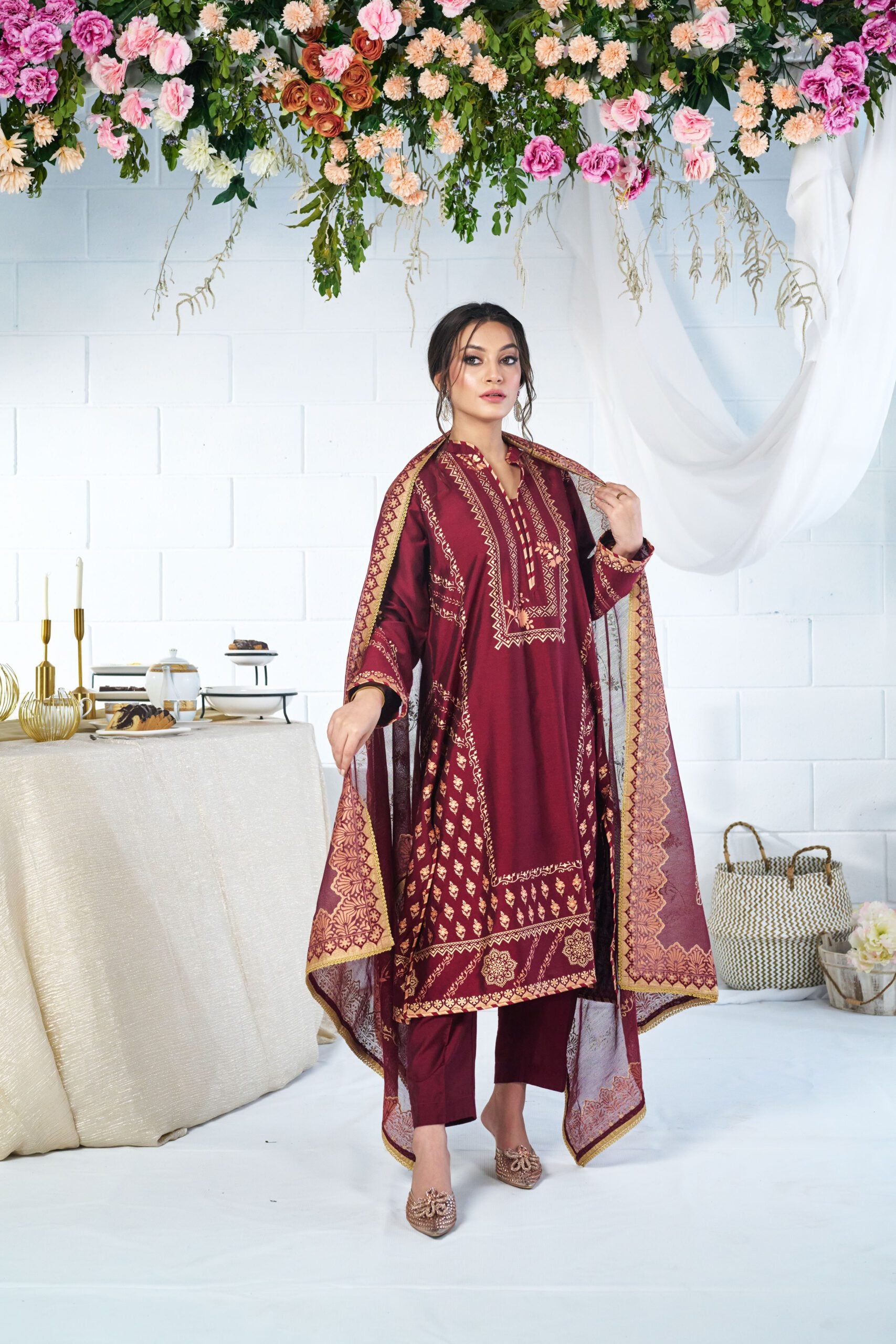 deep red shirt, dupatta and pant enhanced with soothing floral hand screen print for classic look.
