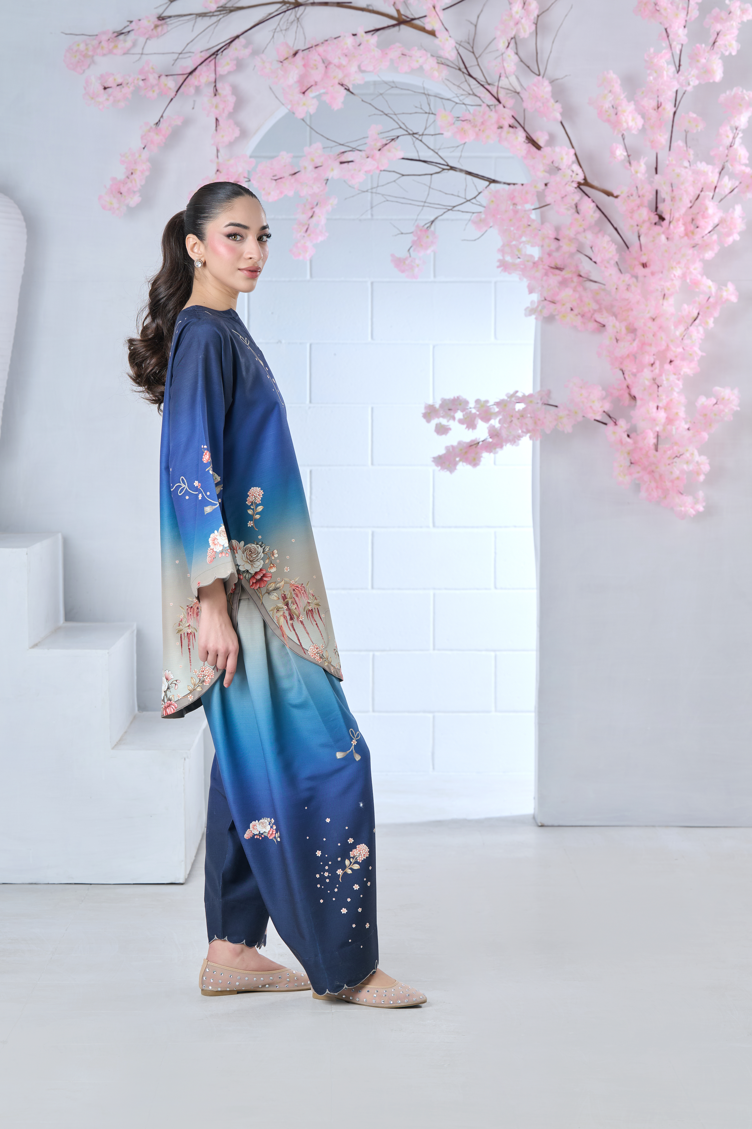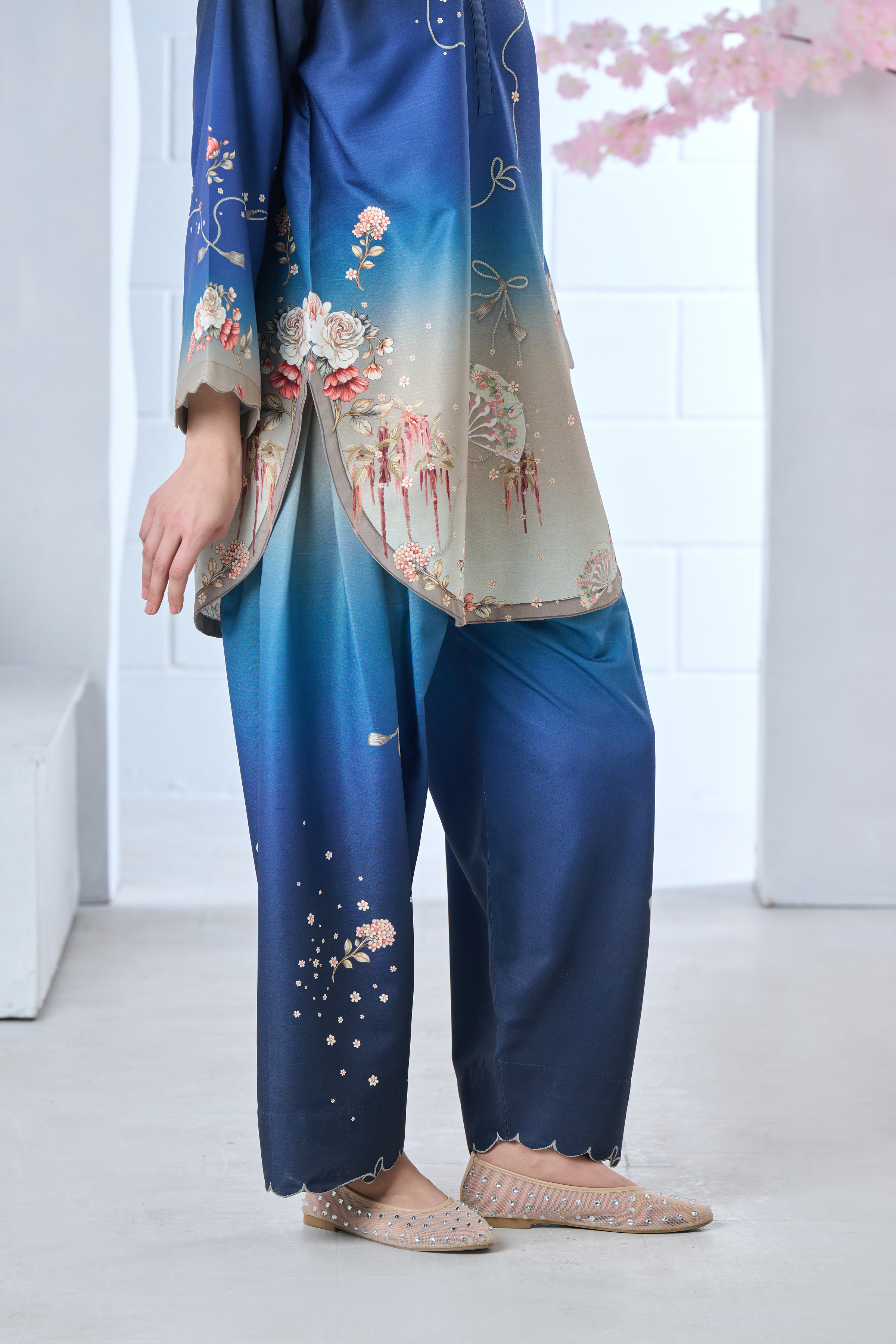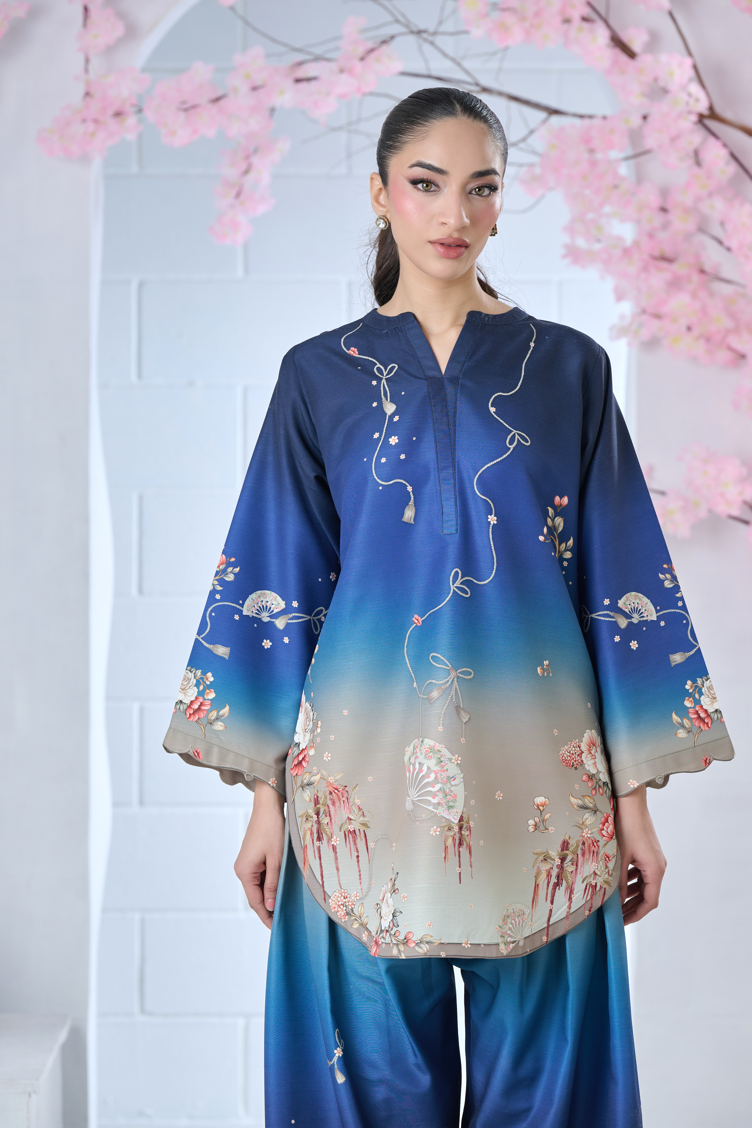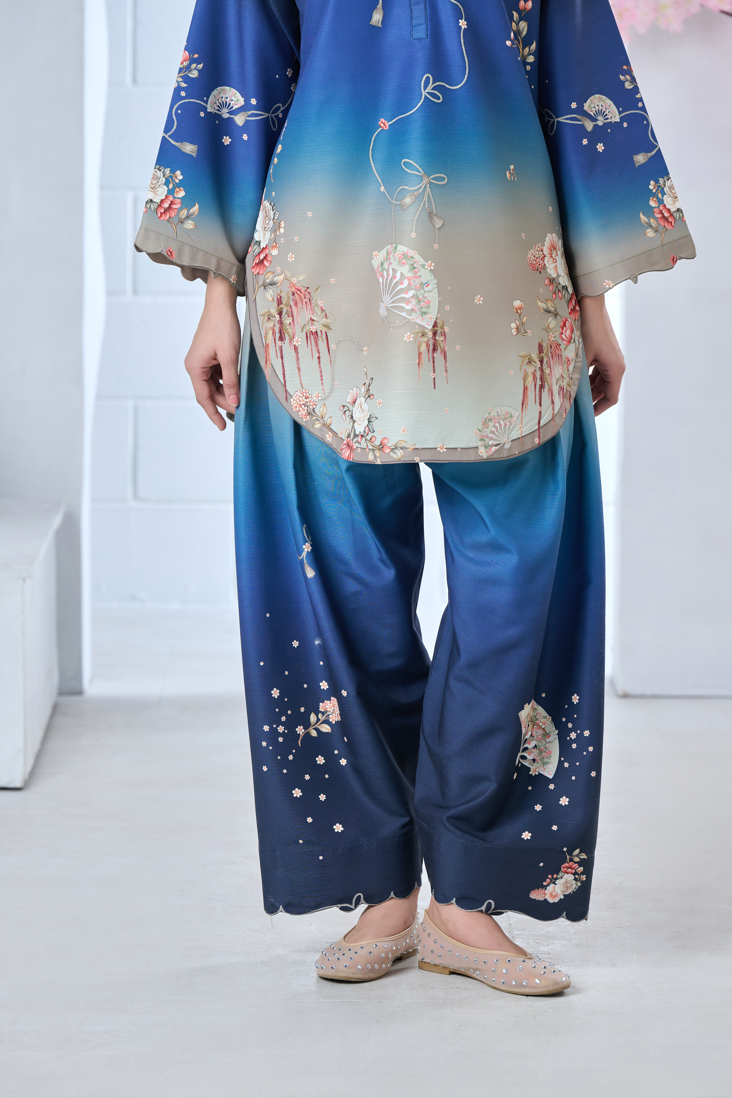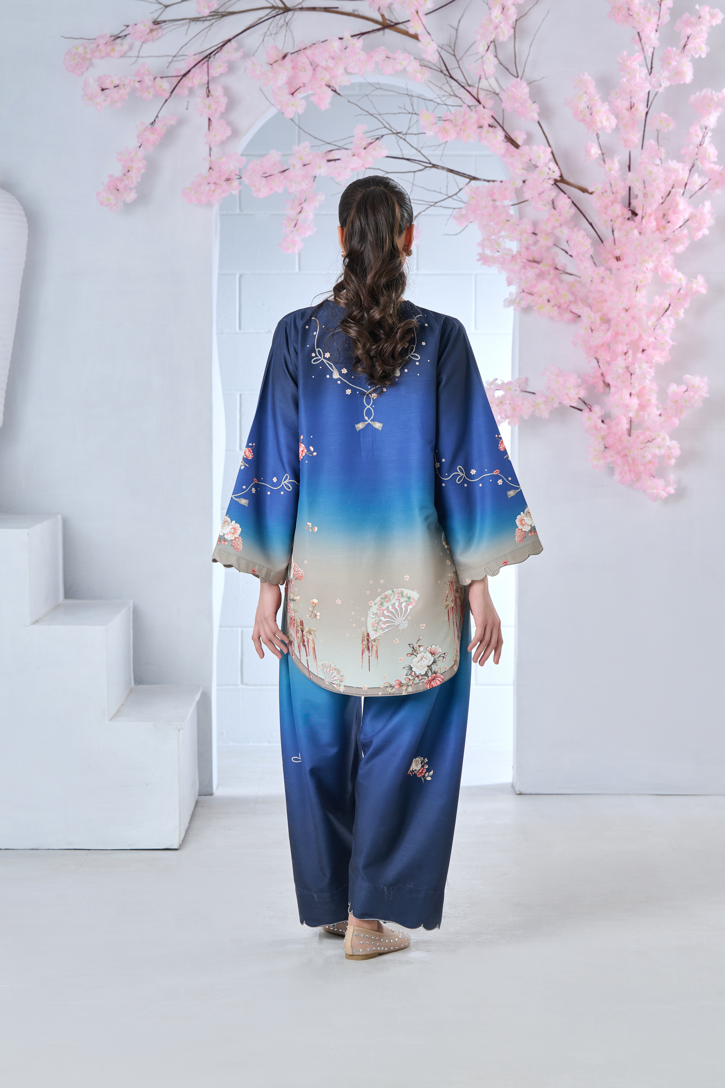 Elegant and unique, this blue-to-beige ombre cordset features a one-of-a-kind placement print that seamlessly blends delicate floral patterns with traditional Chinese fan motifs. The soft gradient creates a serene, sophisticated look, while the intricate design adds depth and cultural charm. Perfect for elevating any outfit with subtle artistry and refined style.