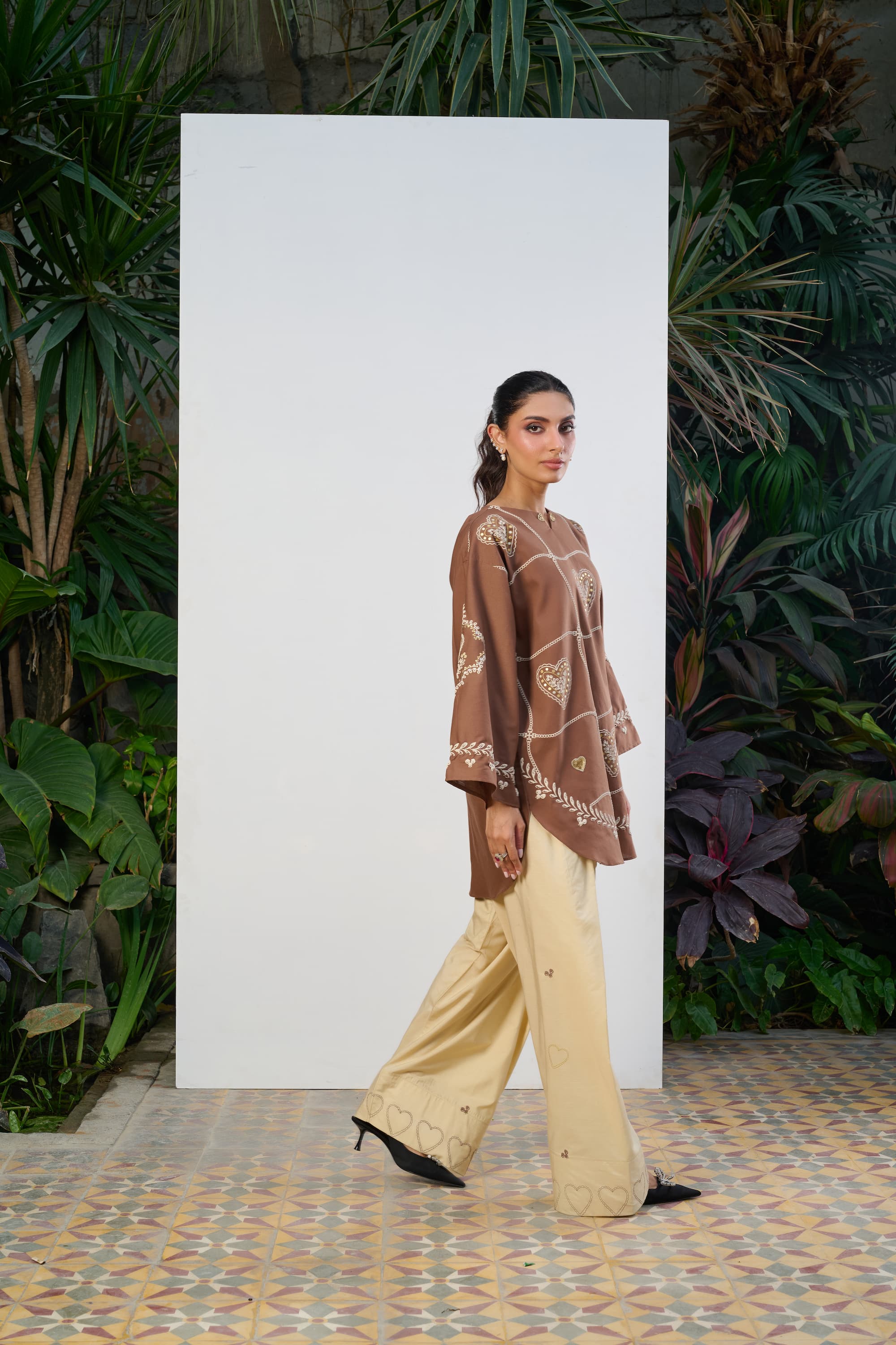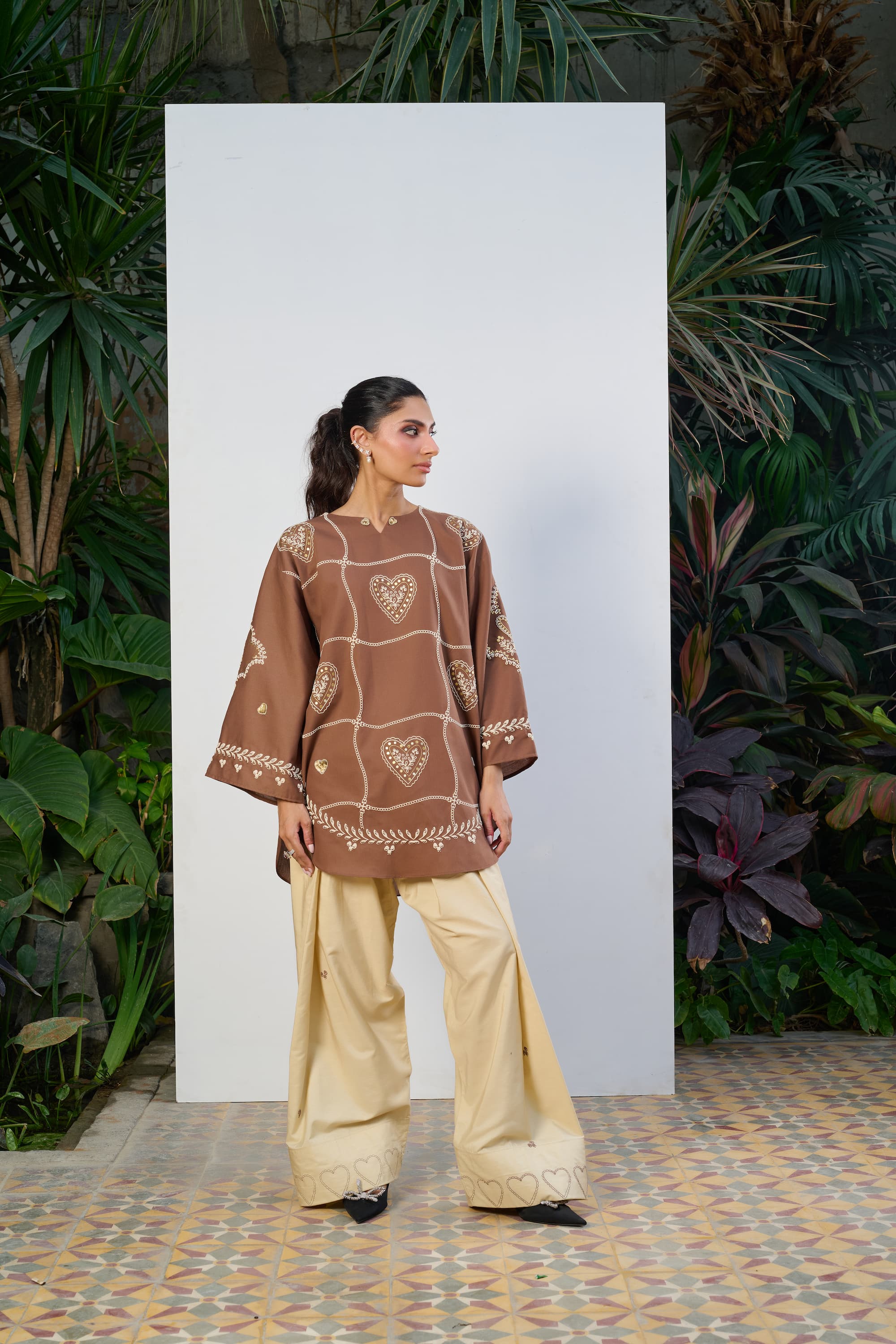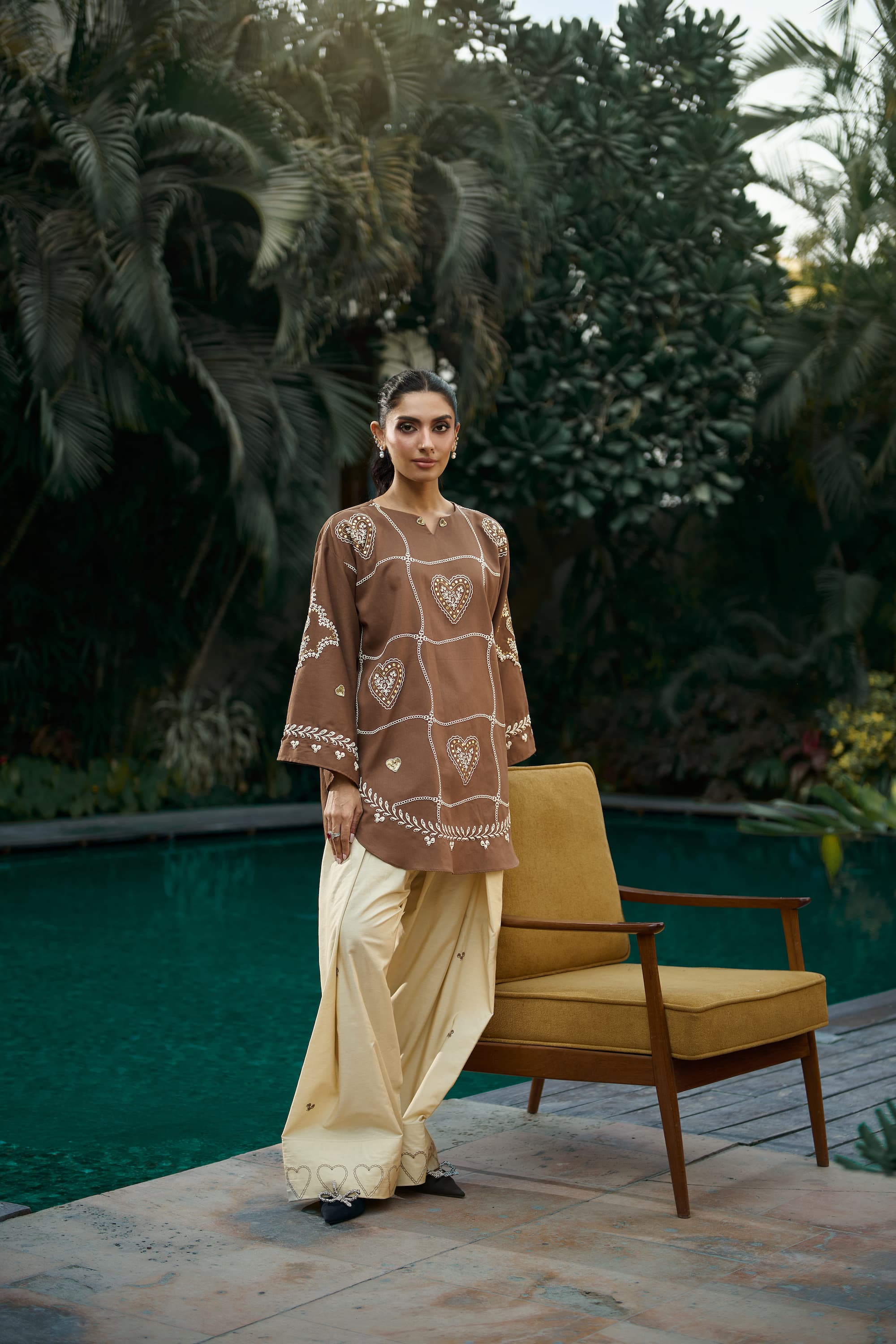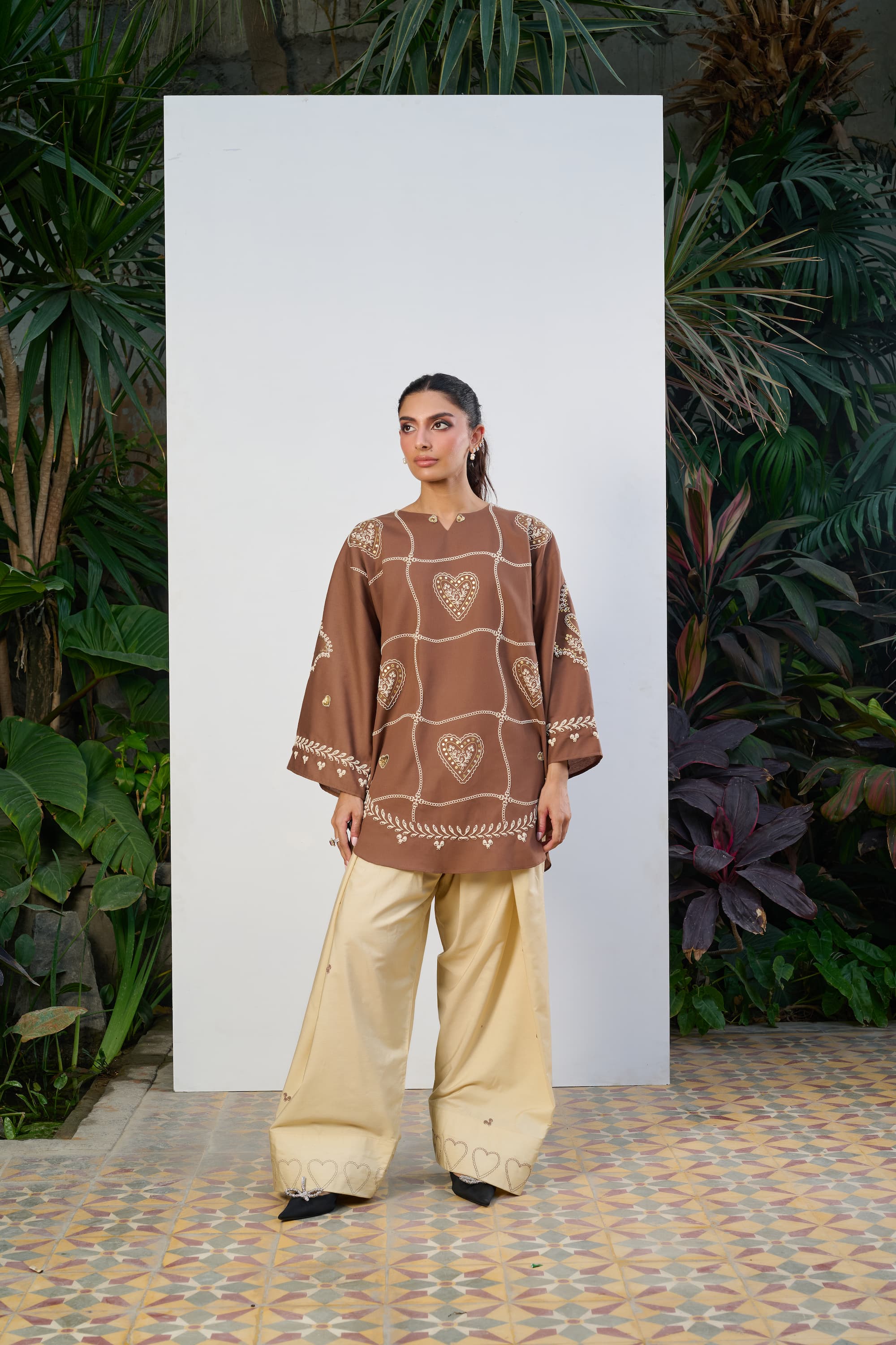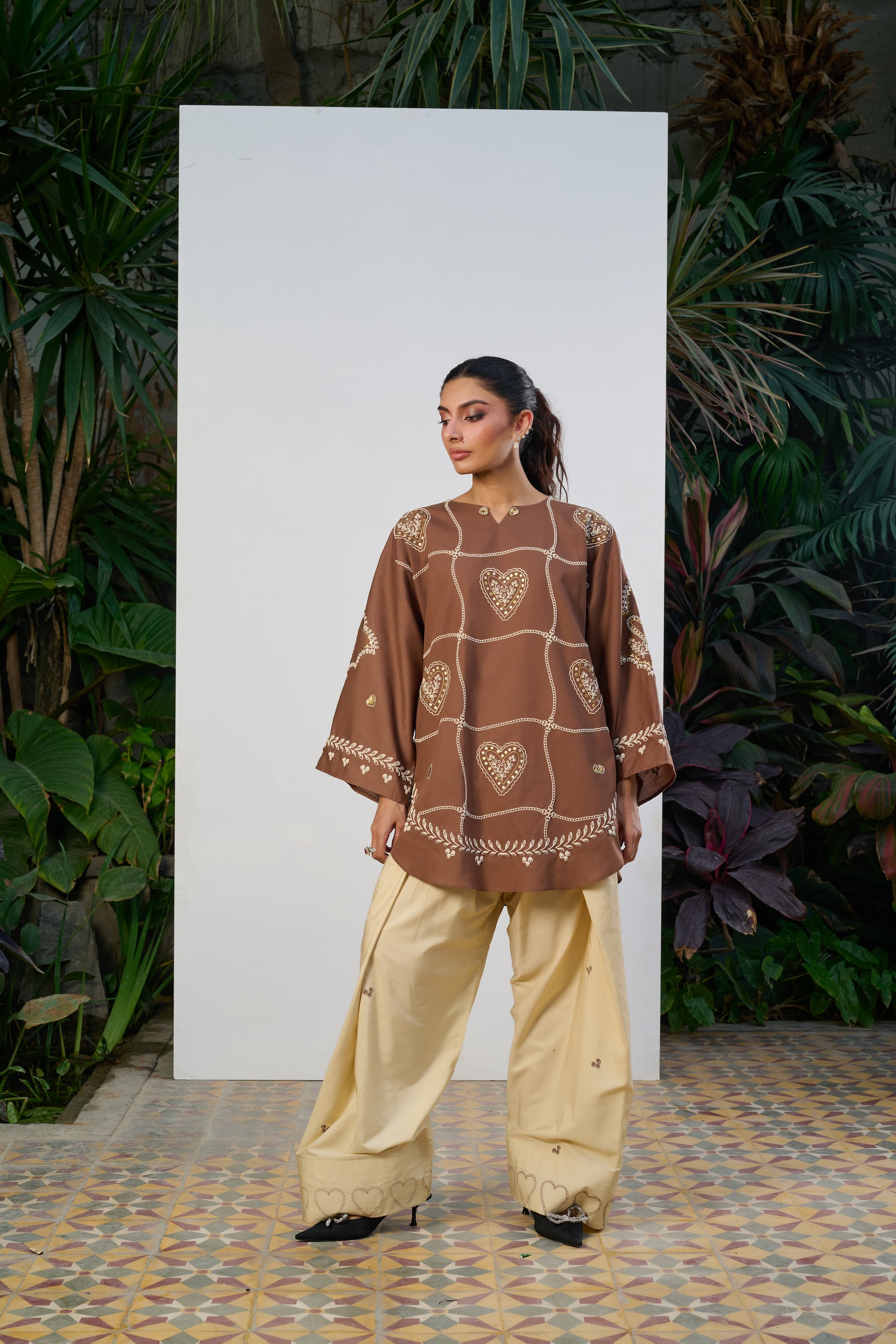The standout feature of this ensemble is its statement heart-shaped patterns, thoughtfully placed to create a striking visual rhythm across the silhouette. Adding depth and dimension, 3D embroidered hearts are carefully hand-stitched across the shirt, bringing texture, artistry, and a unique handcrafted appeal to the design.