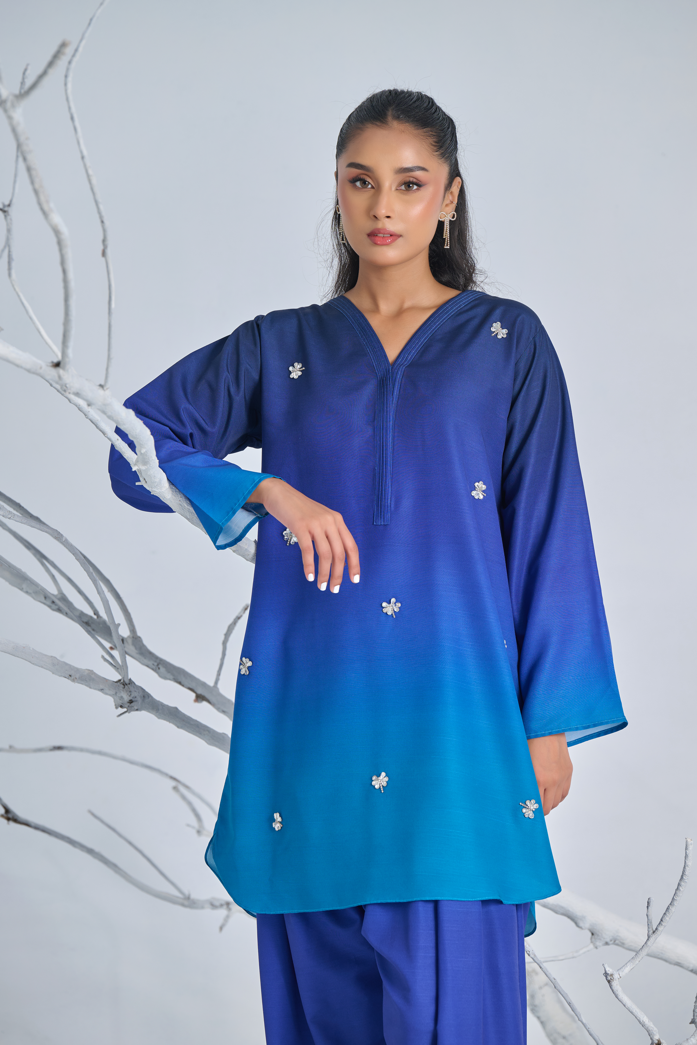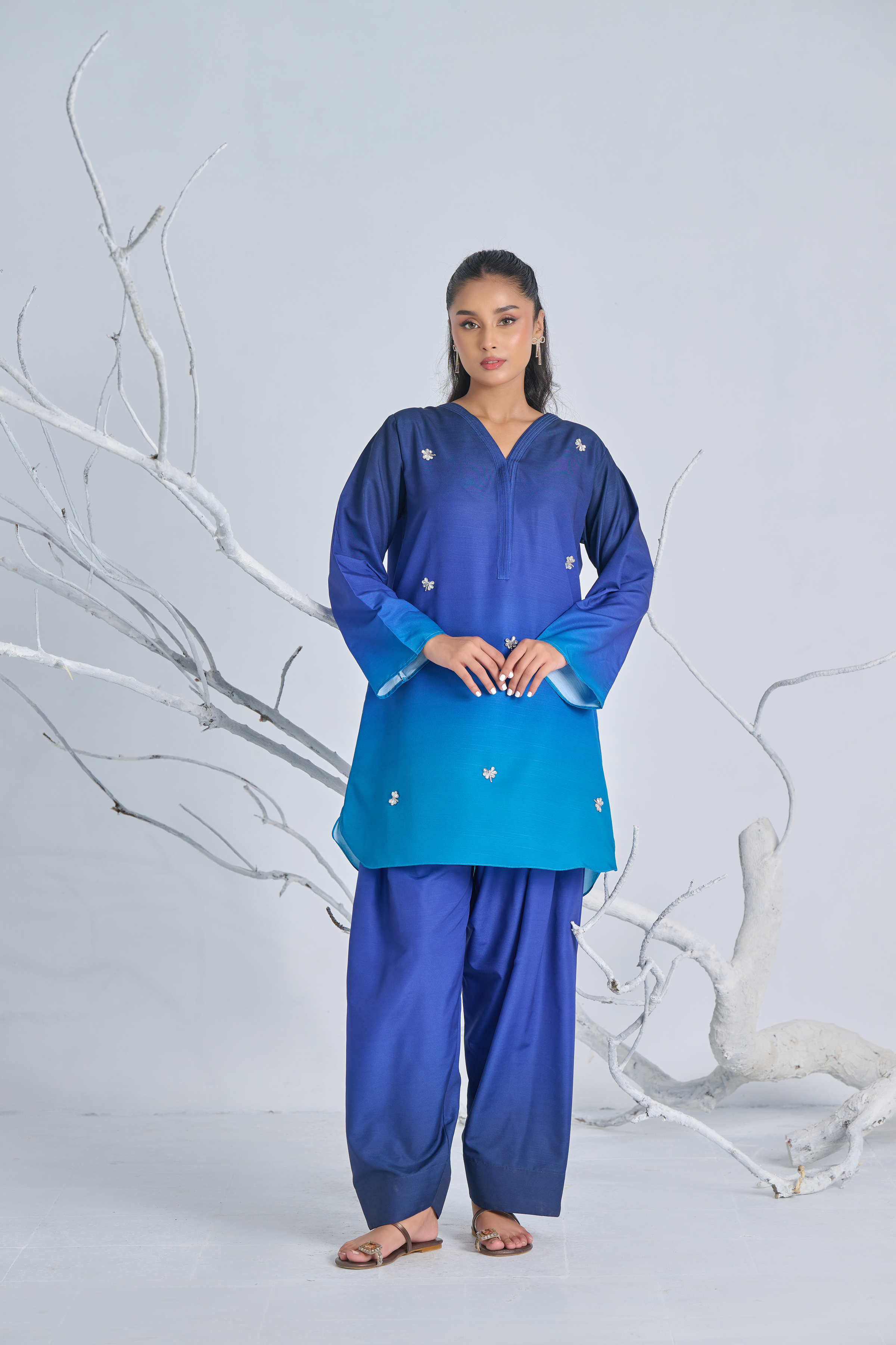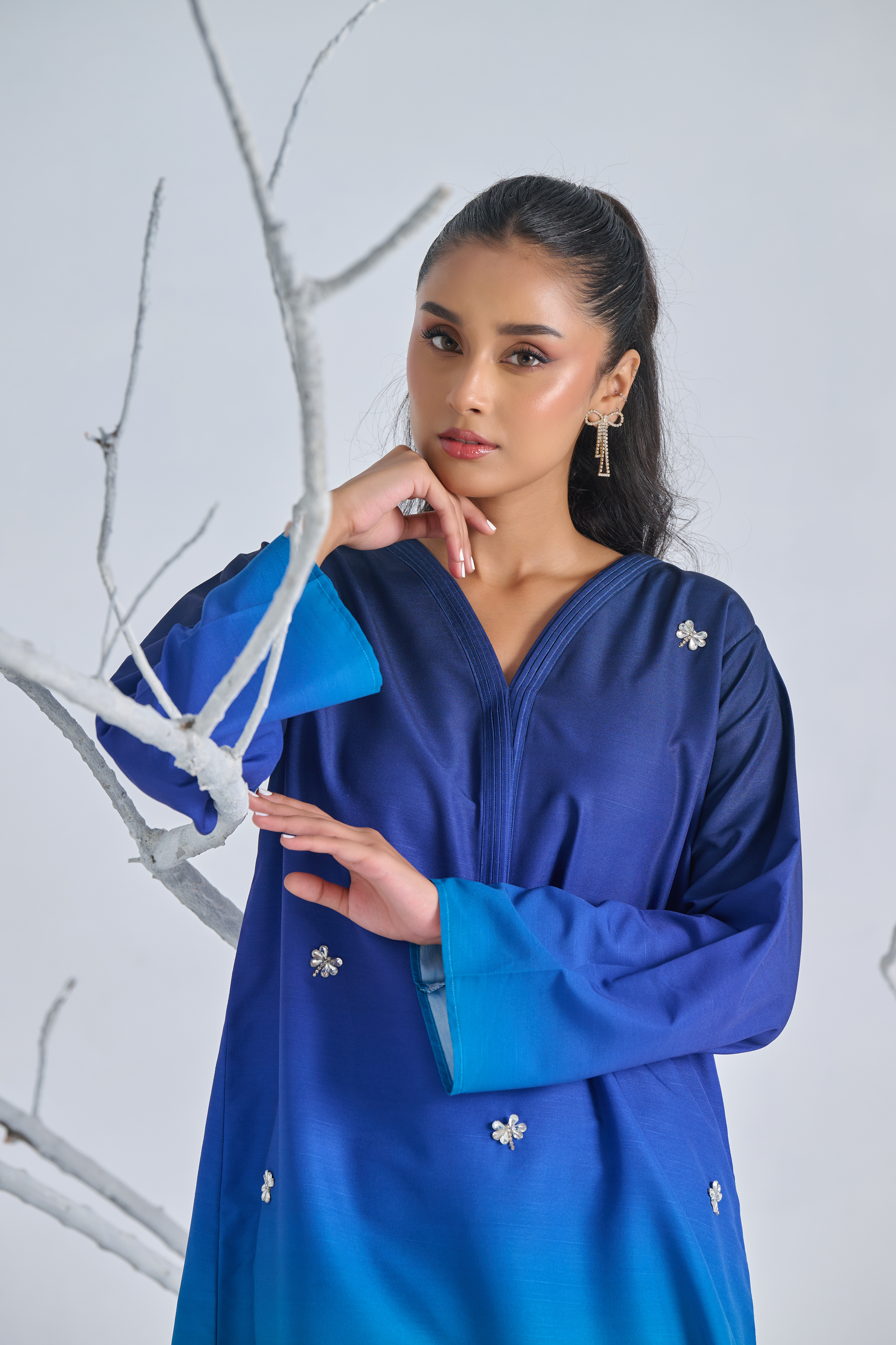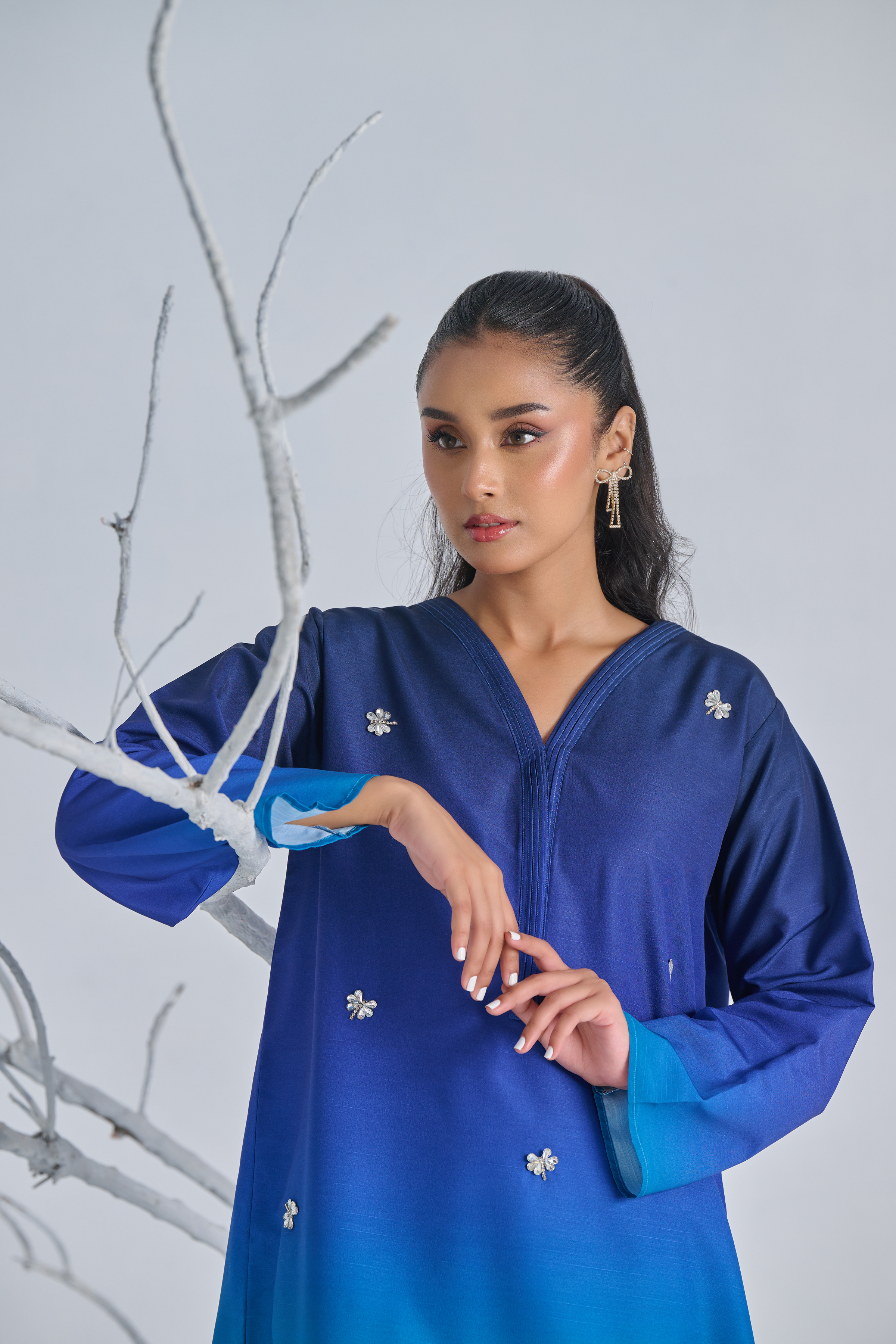 Description: Drape yourself in Blue and Turquoise Ombre set– a classic outfit that speaks volumes in style.