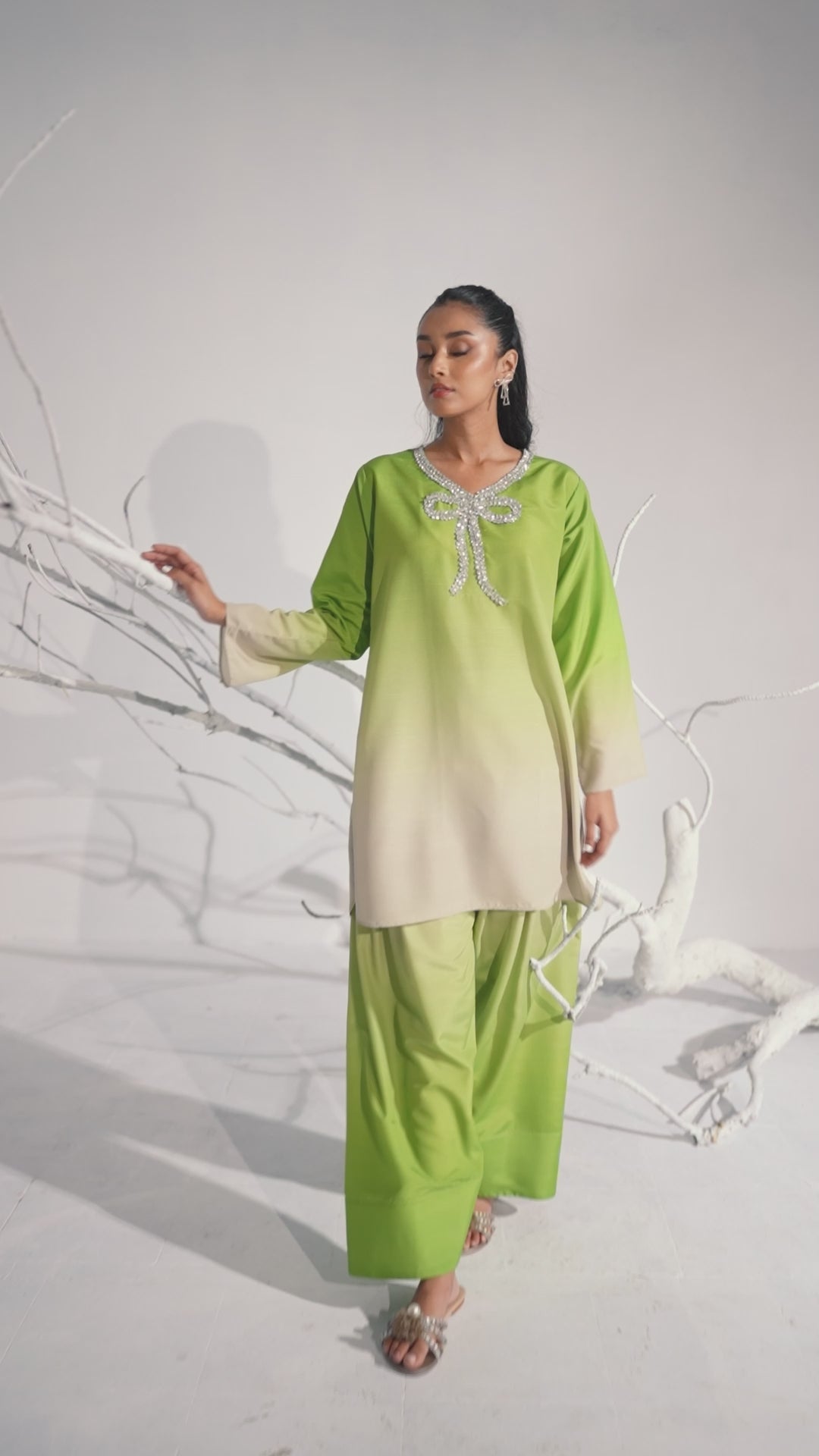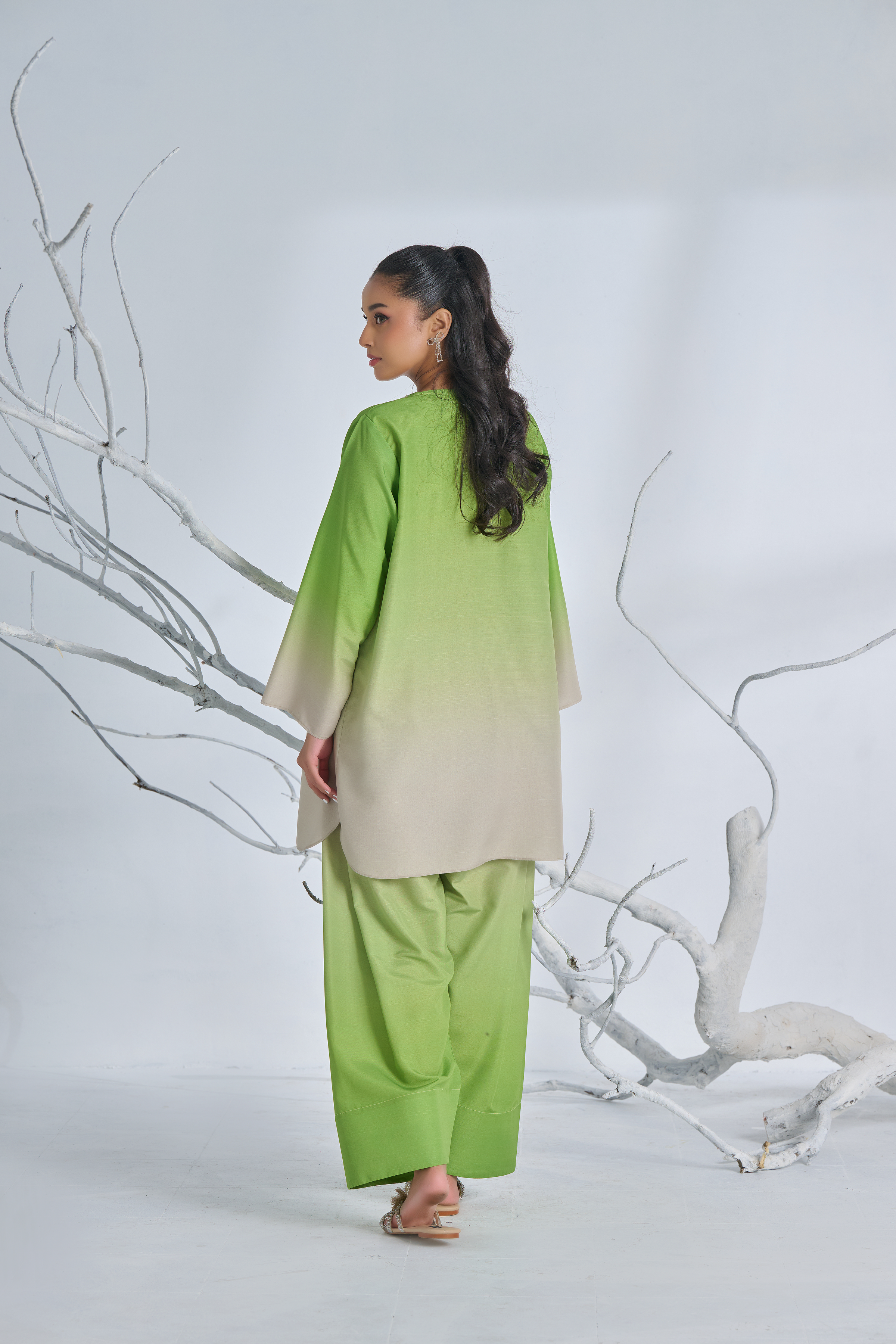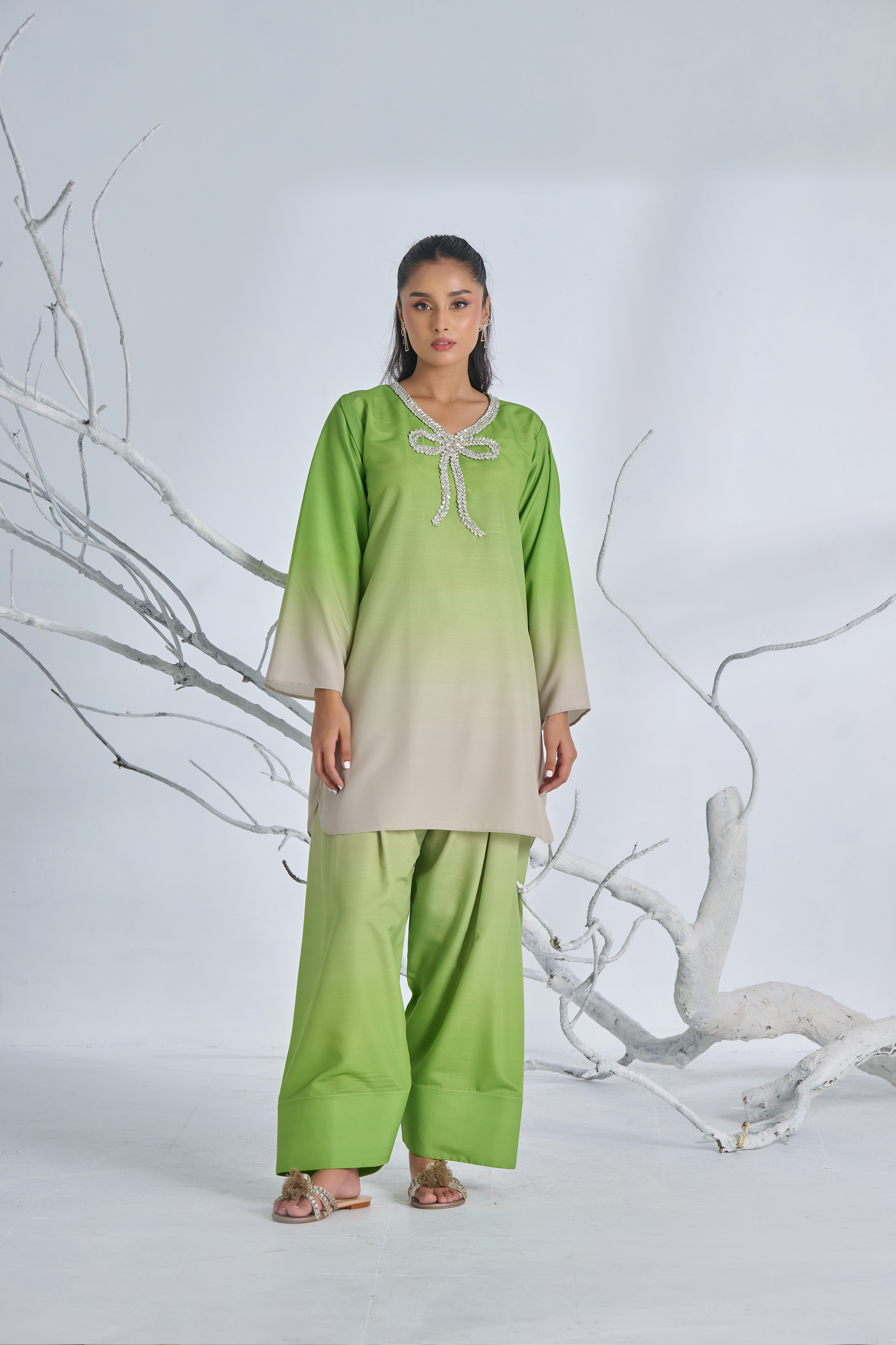 Description: Drape yourself in Pear Green Ombre set– a classic outfit that speaks volumes in style.