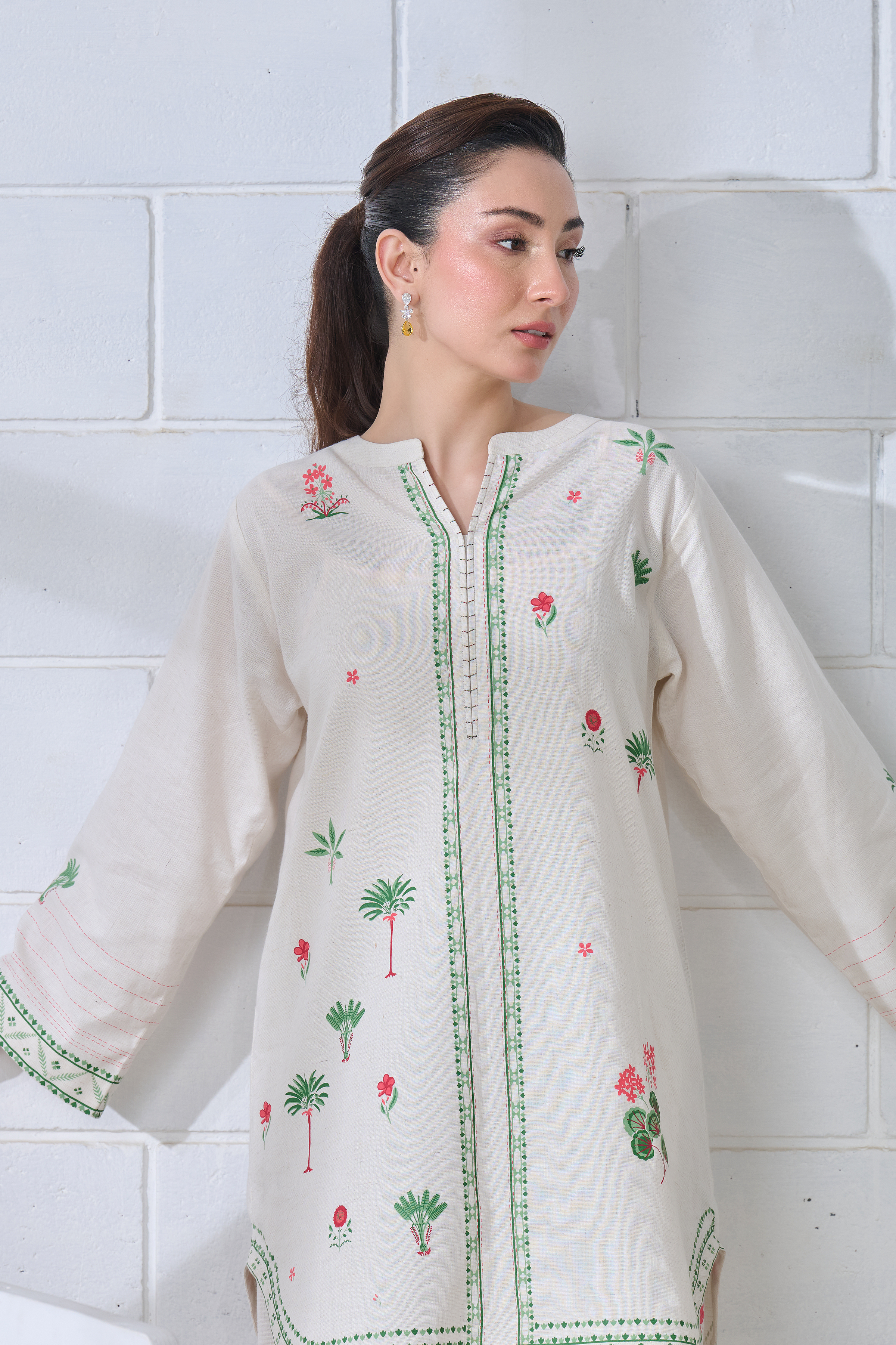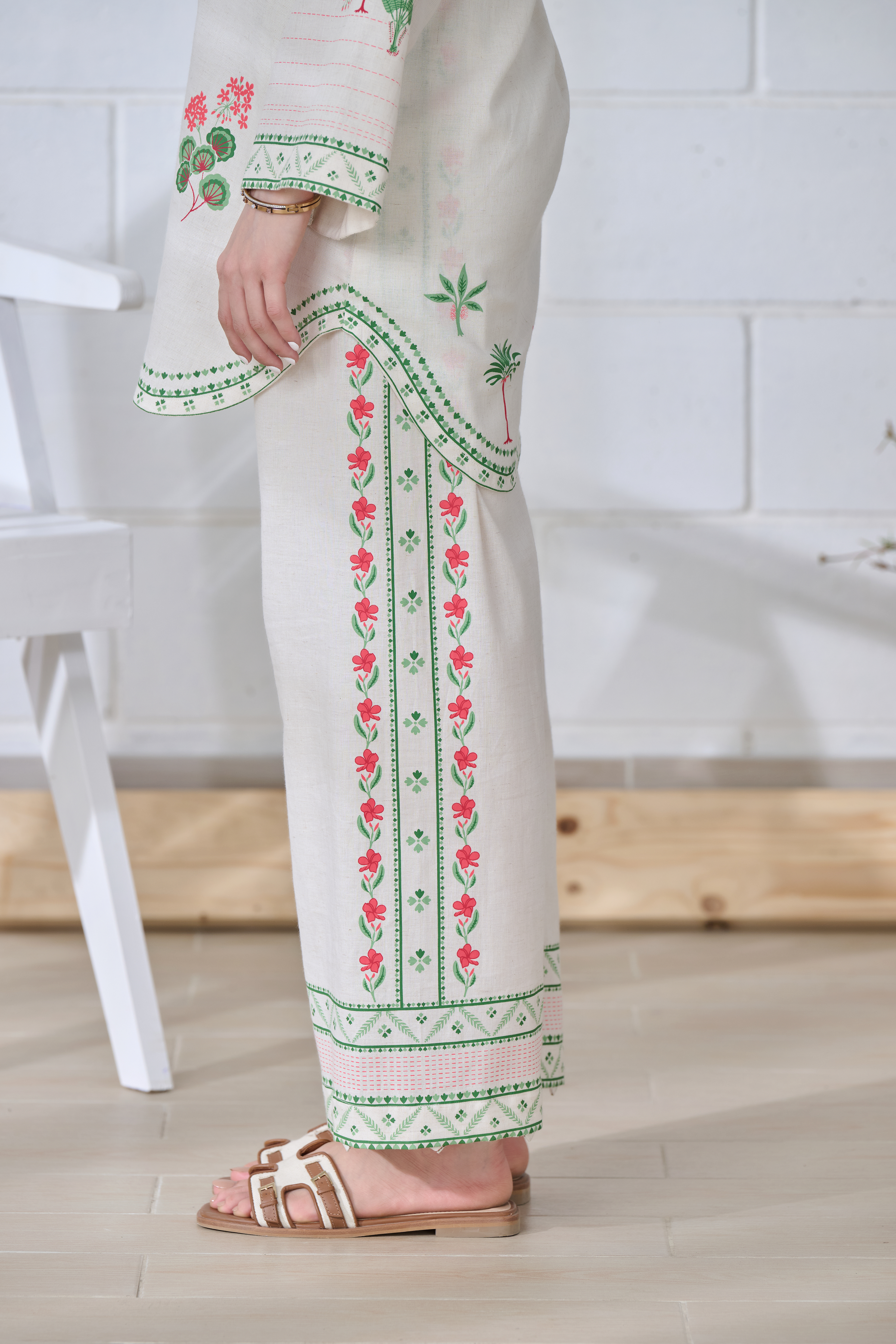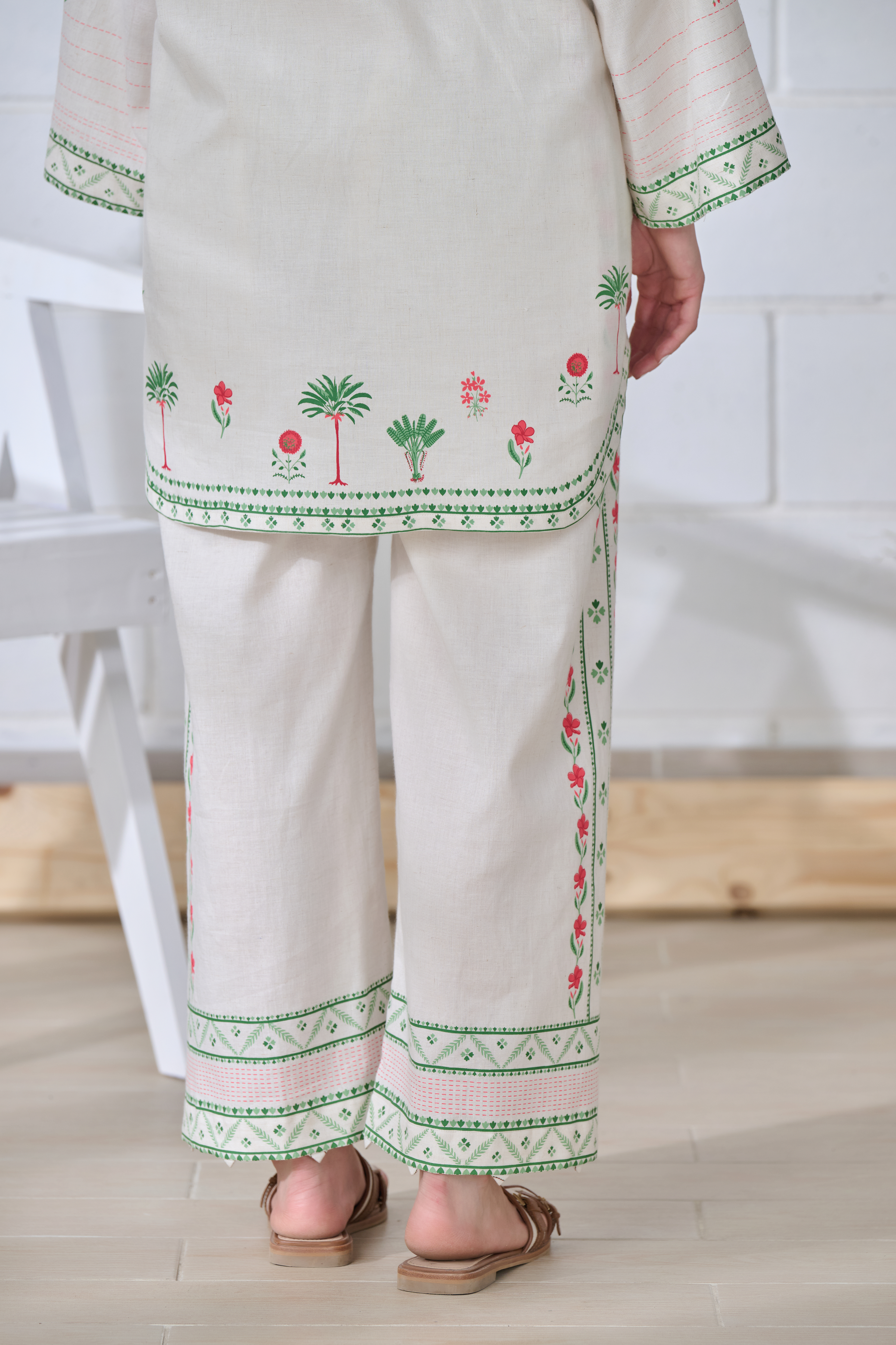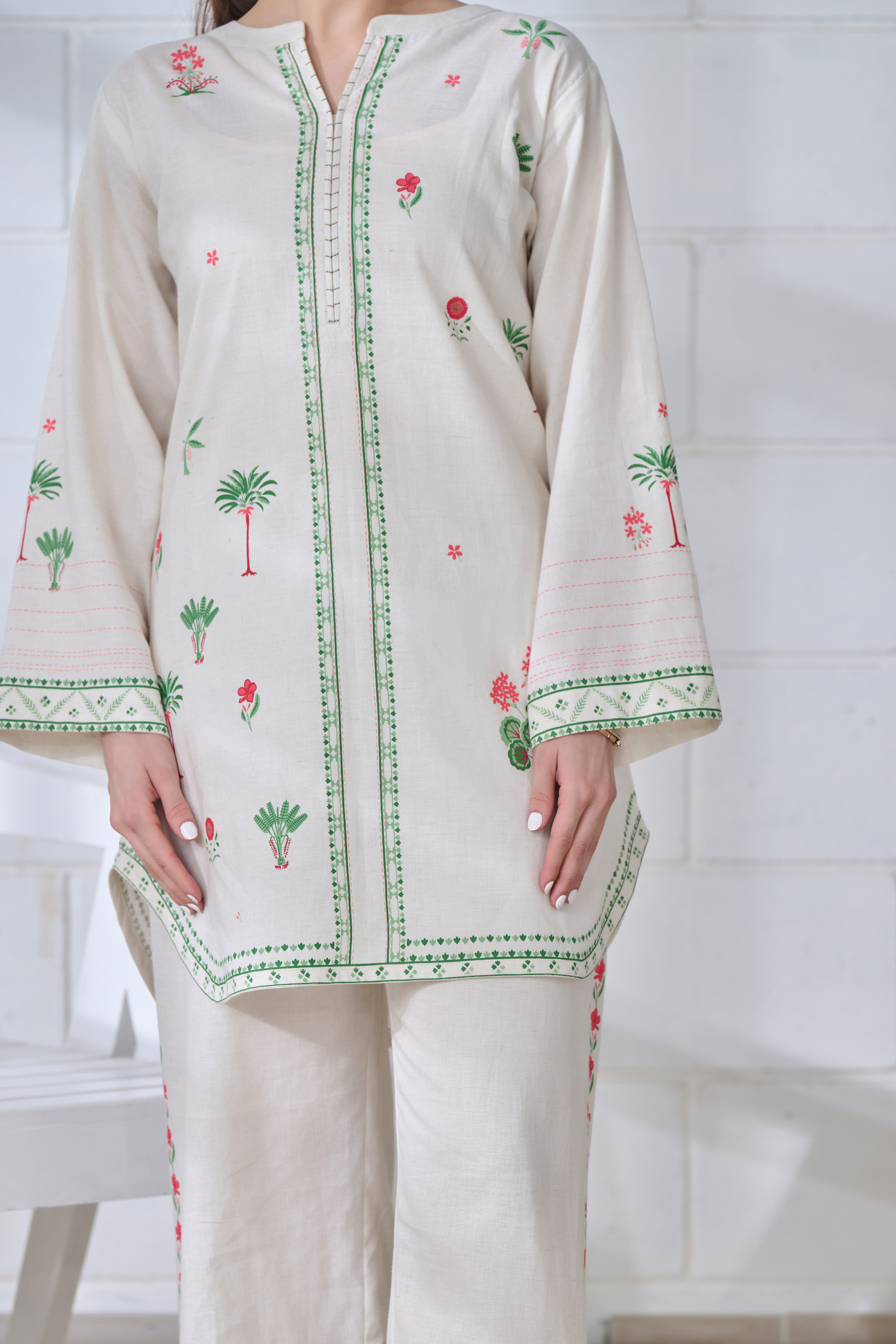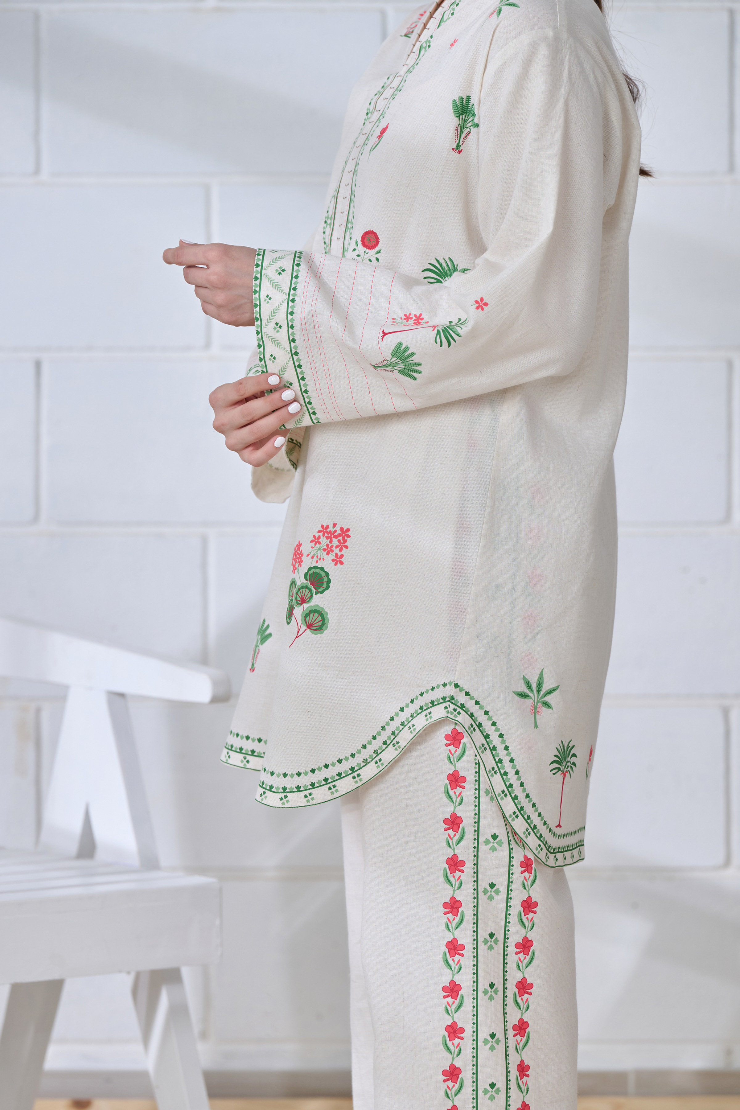 Description: Effortlessly elegant, this off-white linen co-ord set features multi-colored traditional block prints on a modern, relaxed silhouette. With delicate detailing on the kurta and trousers, it’s perfect for a resort day, workwear, or after-hours plans. A fresh, youthful take on everyday ethnic style.