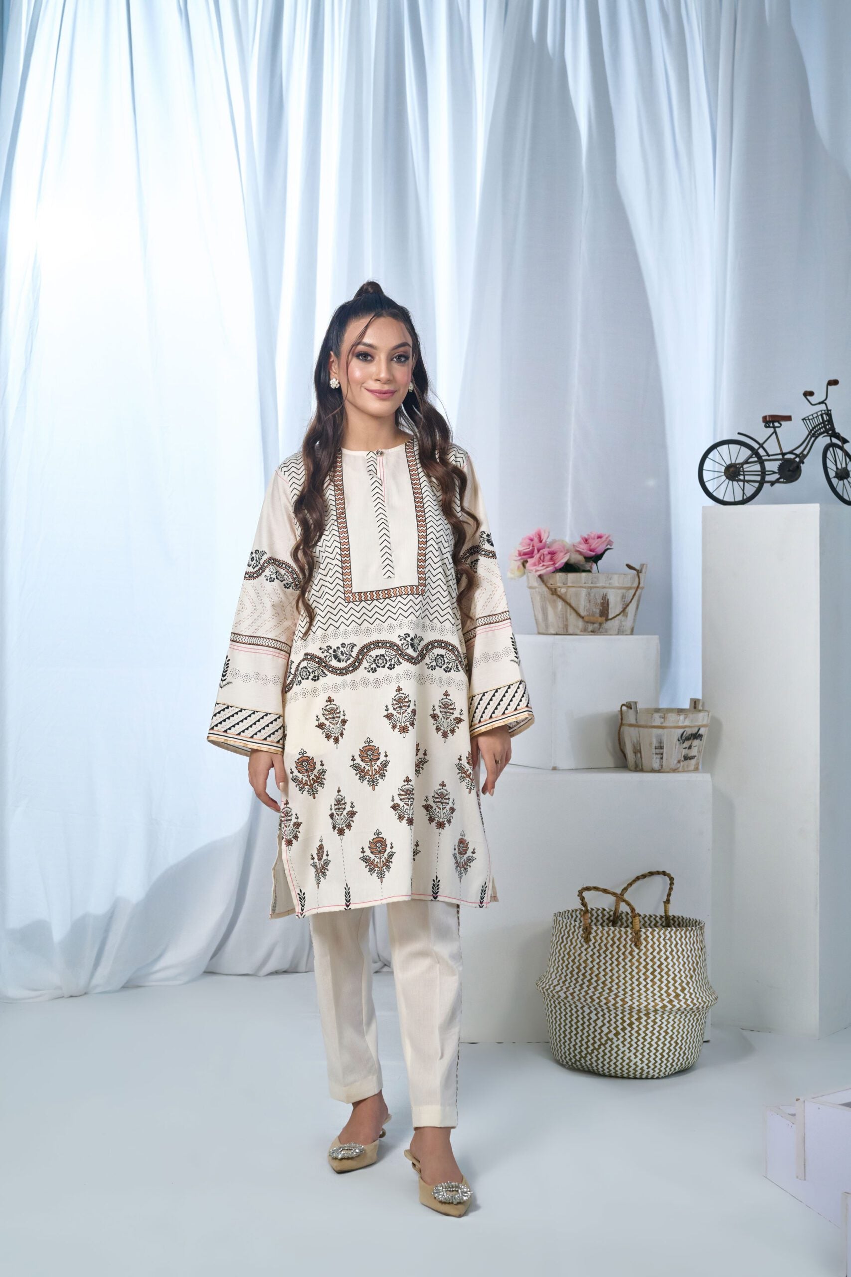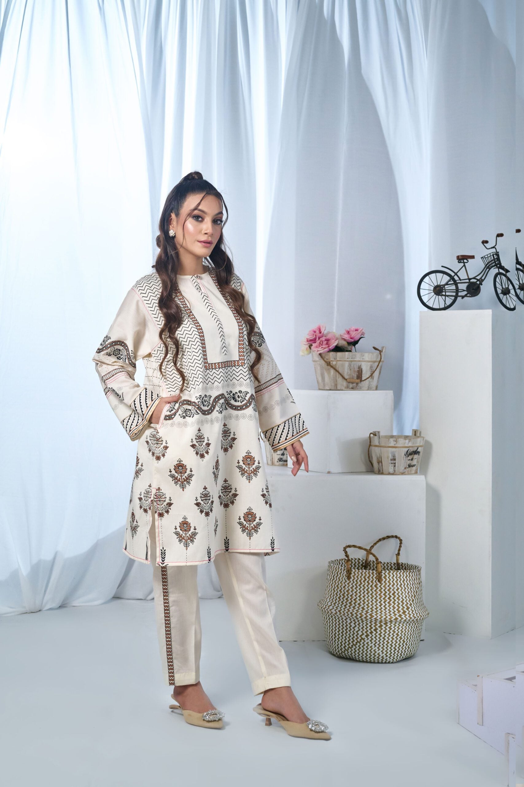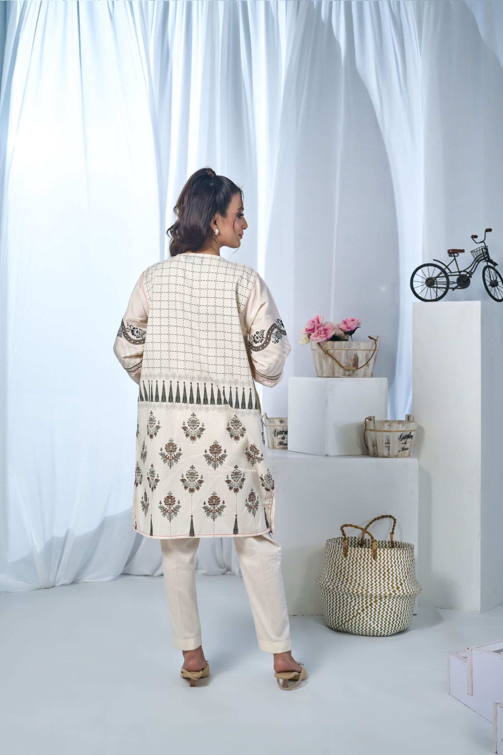 Off-white shirt and pant enhanced with soothing floral hand screen printed for classic look. Color: Black and Gold.