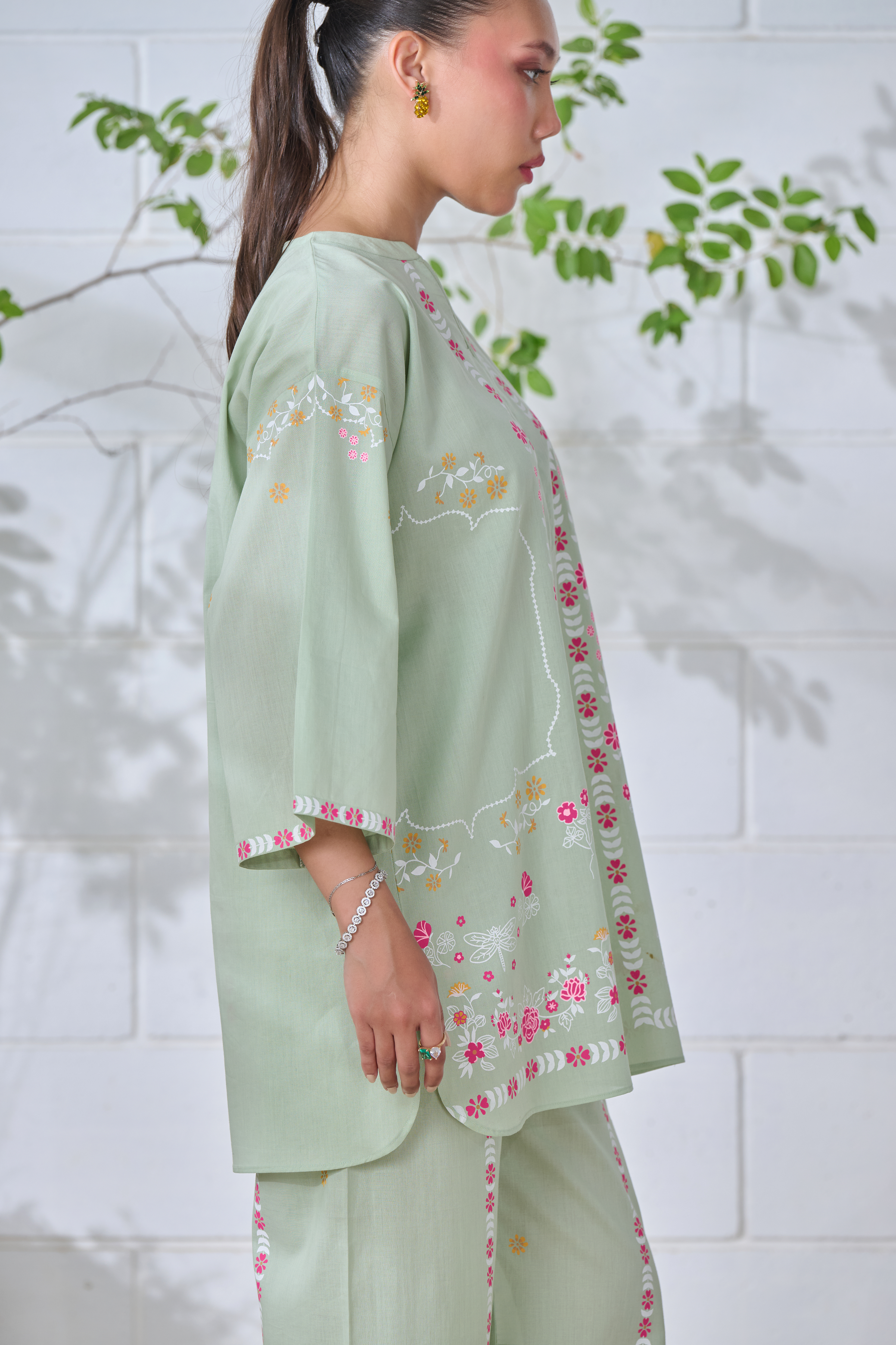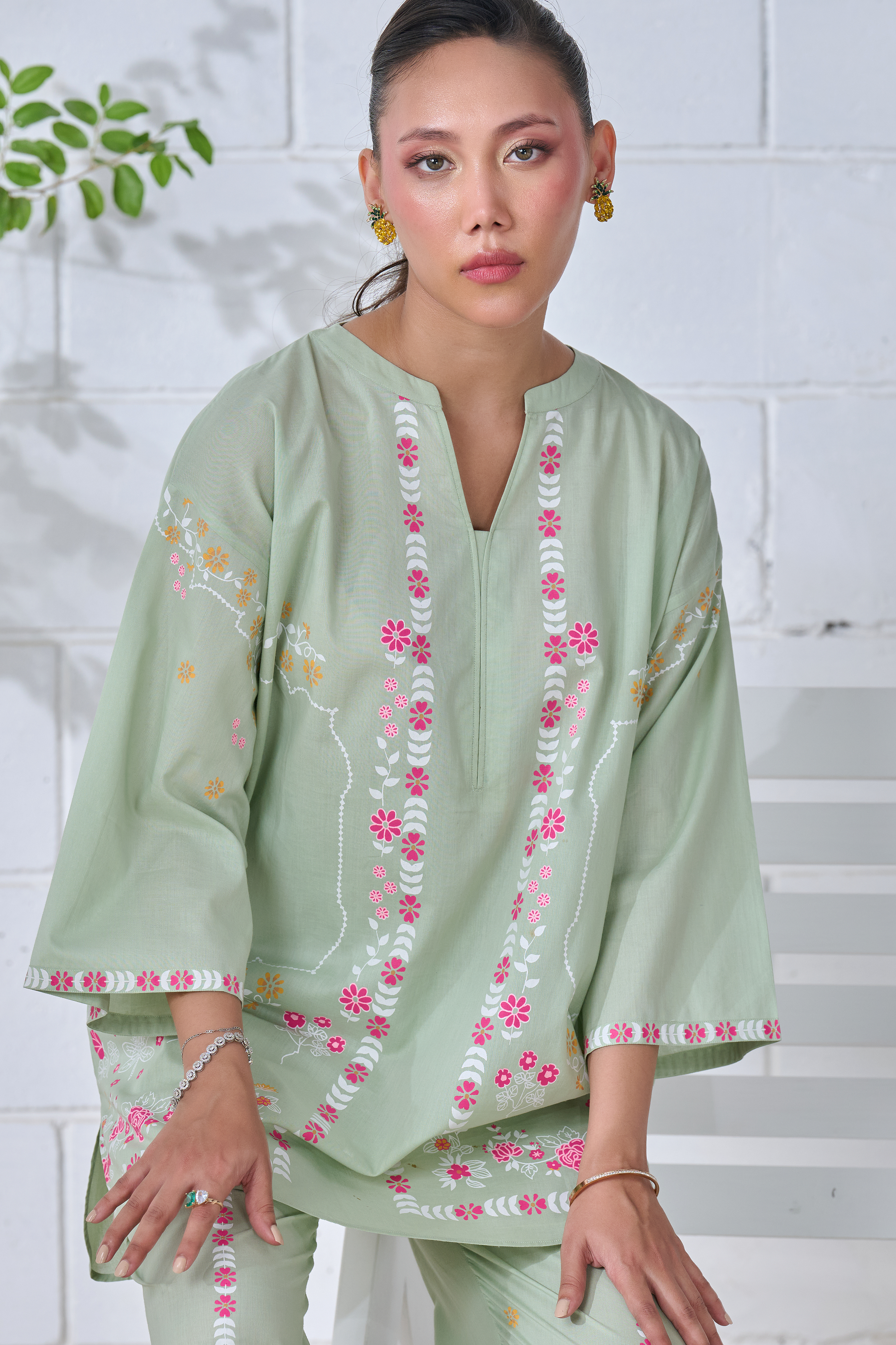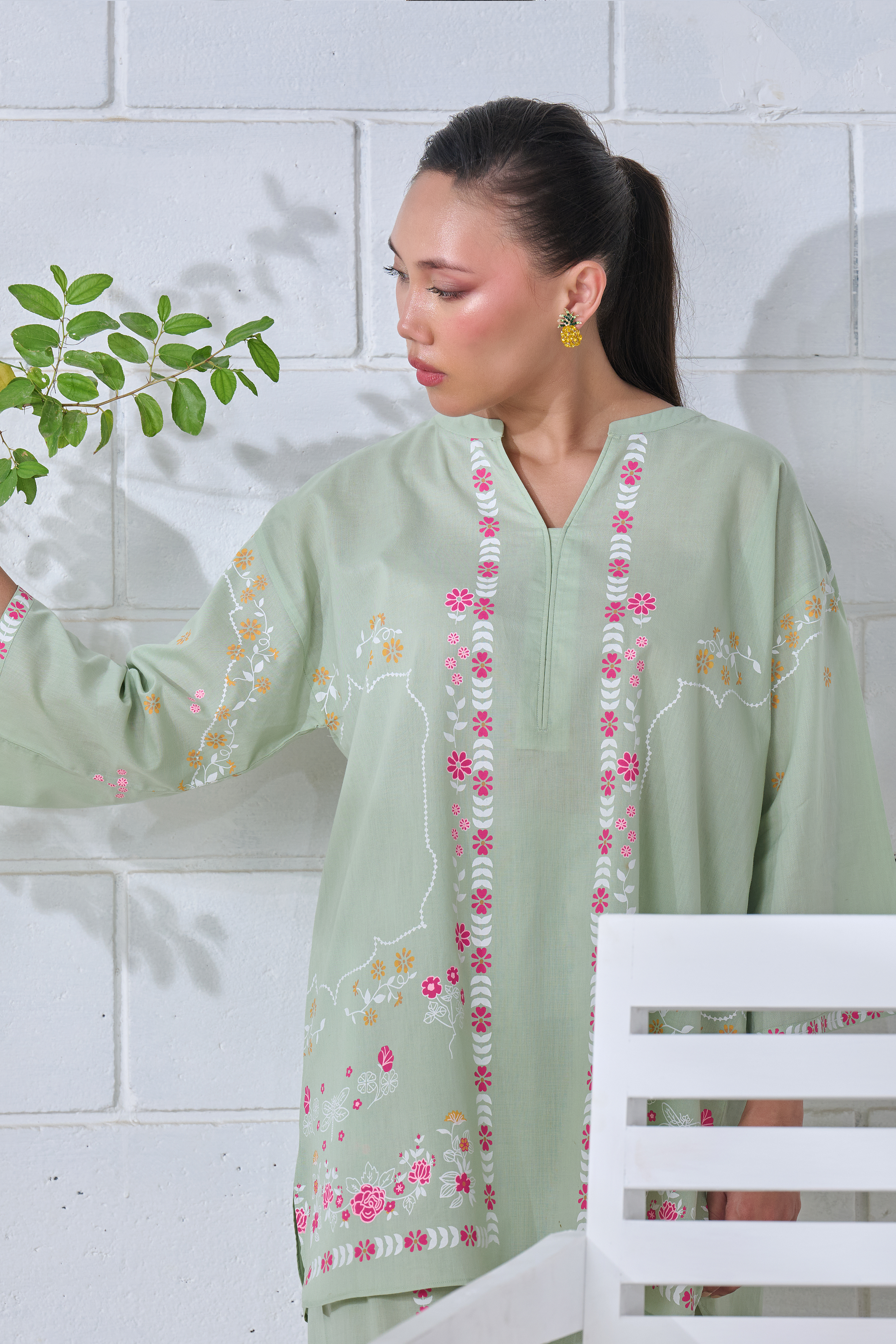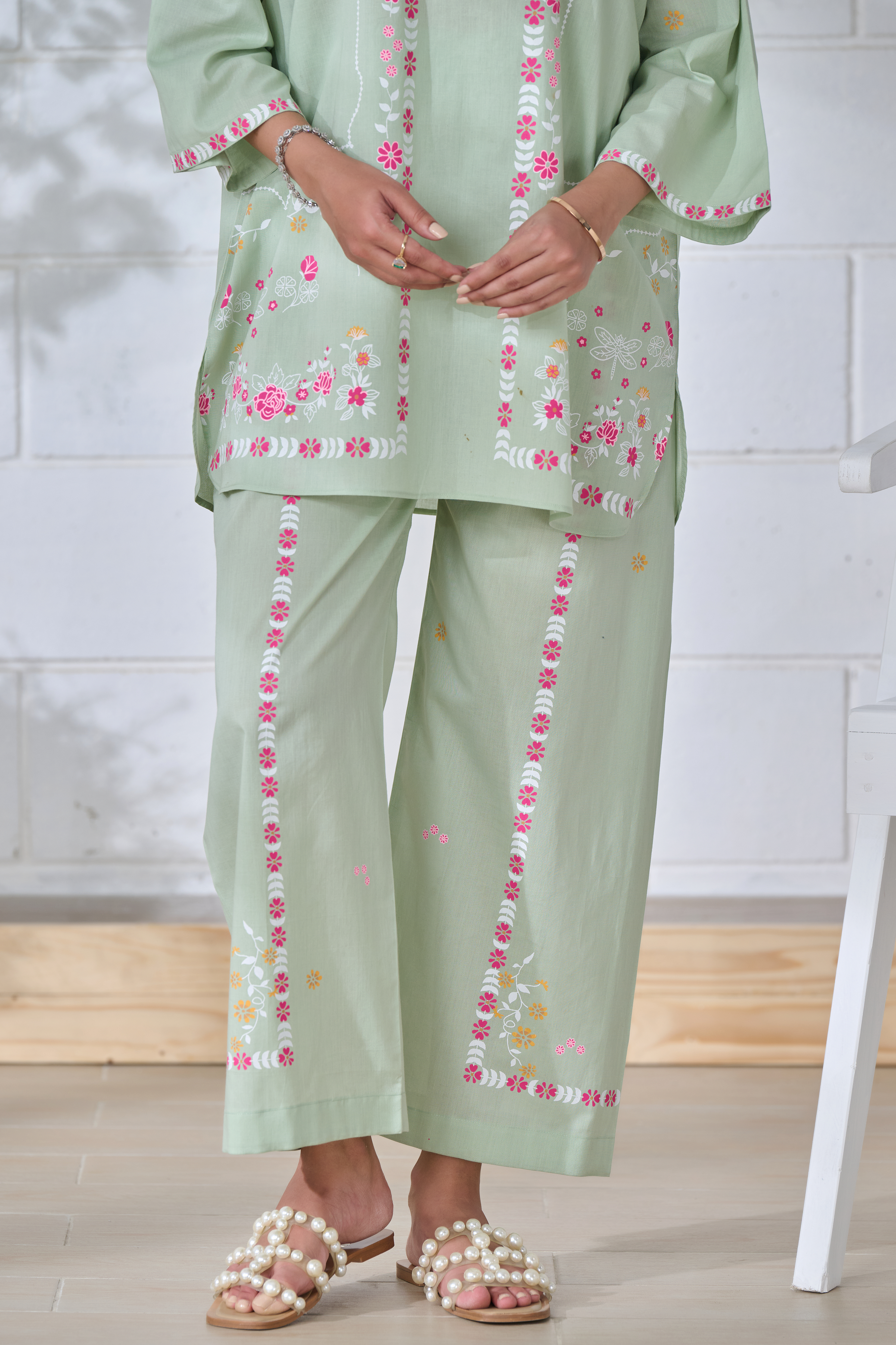 Description: This pistachio green co-ord set, crafted from breathable cotton for ultimate comfort. Designed in a modern silhouette, it features screen printed motifs in shades of pink, off-white, and chrome, offering a perfect blend of contemporary flair. The kurta showcases a relaxed, boxy fit with three-quarter sleeves and intricate floral detailing that cascades along the front and hemline. Complementing the top, the straight-cut pants are adorned with matching vertical prints.