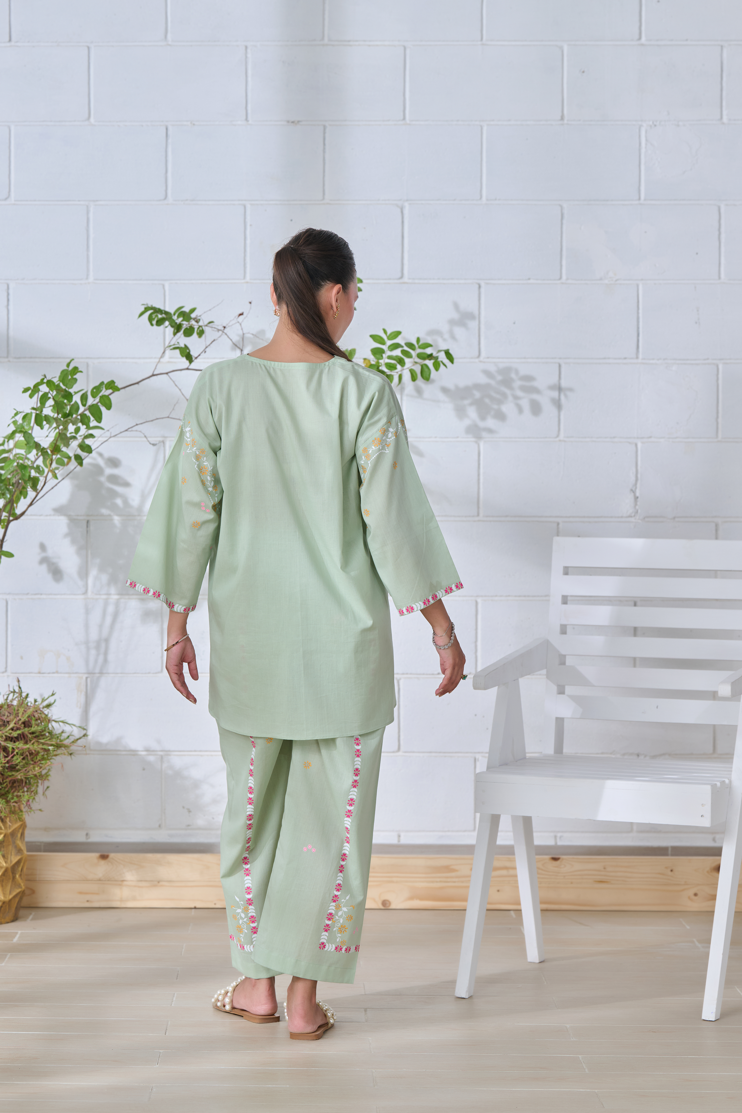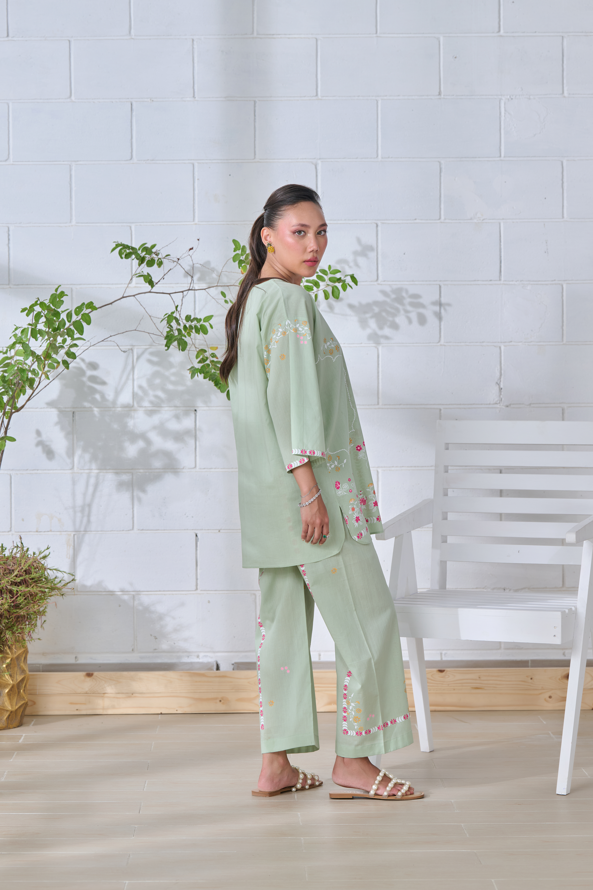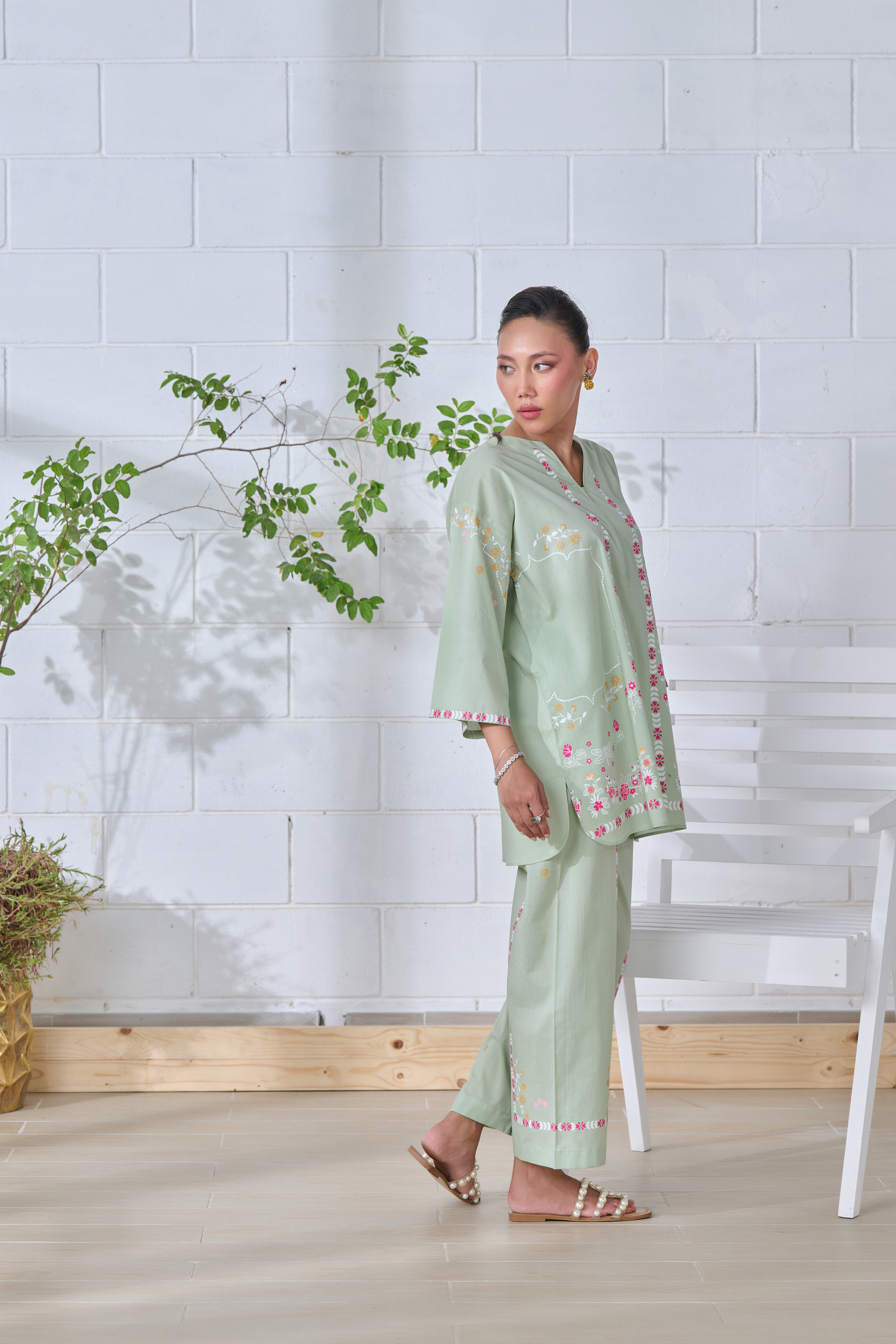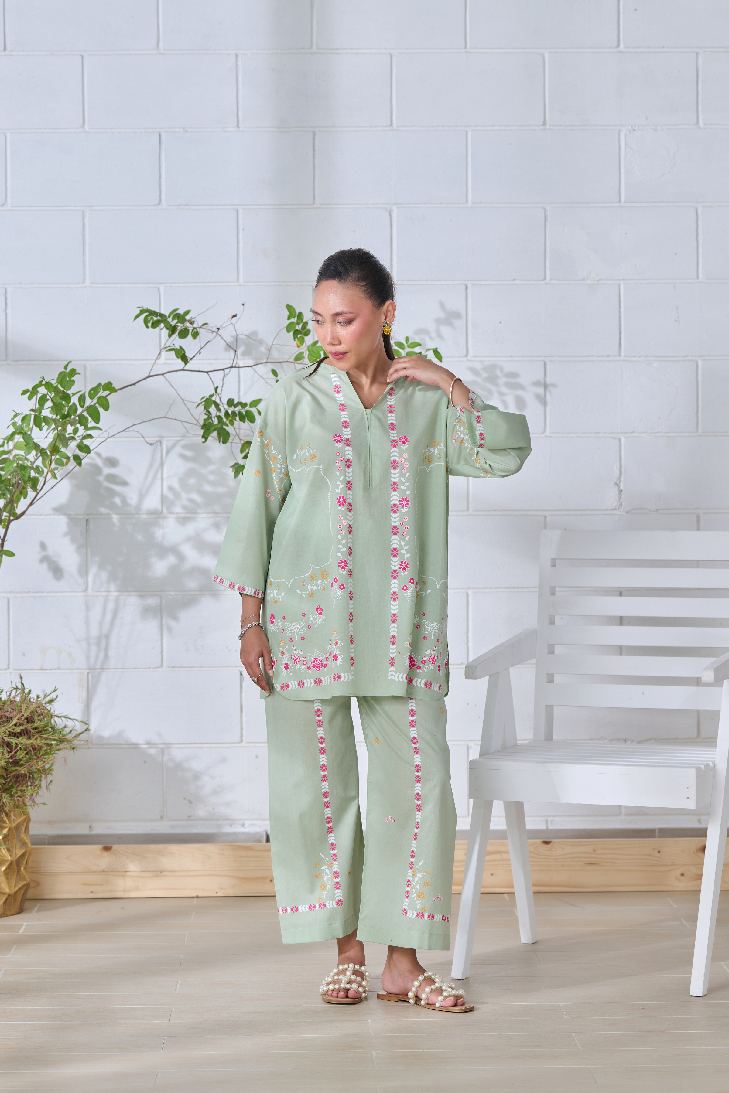Description: This pistachio green co-ord set, crafted from breathable cotton for ultimate comfort. Designed in a modern silhouette, it features screen printed motifs in shades of pink, off-white, and chrome, offering a perfect blend of contemporary flair. The kurta showcases a relaxed, boxy fit with three-quarter sleeves and intricate floral detailing that cascades along the front and hemline. Complementing the top, the straight-cut pants are adorned with matching vertical prints.