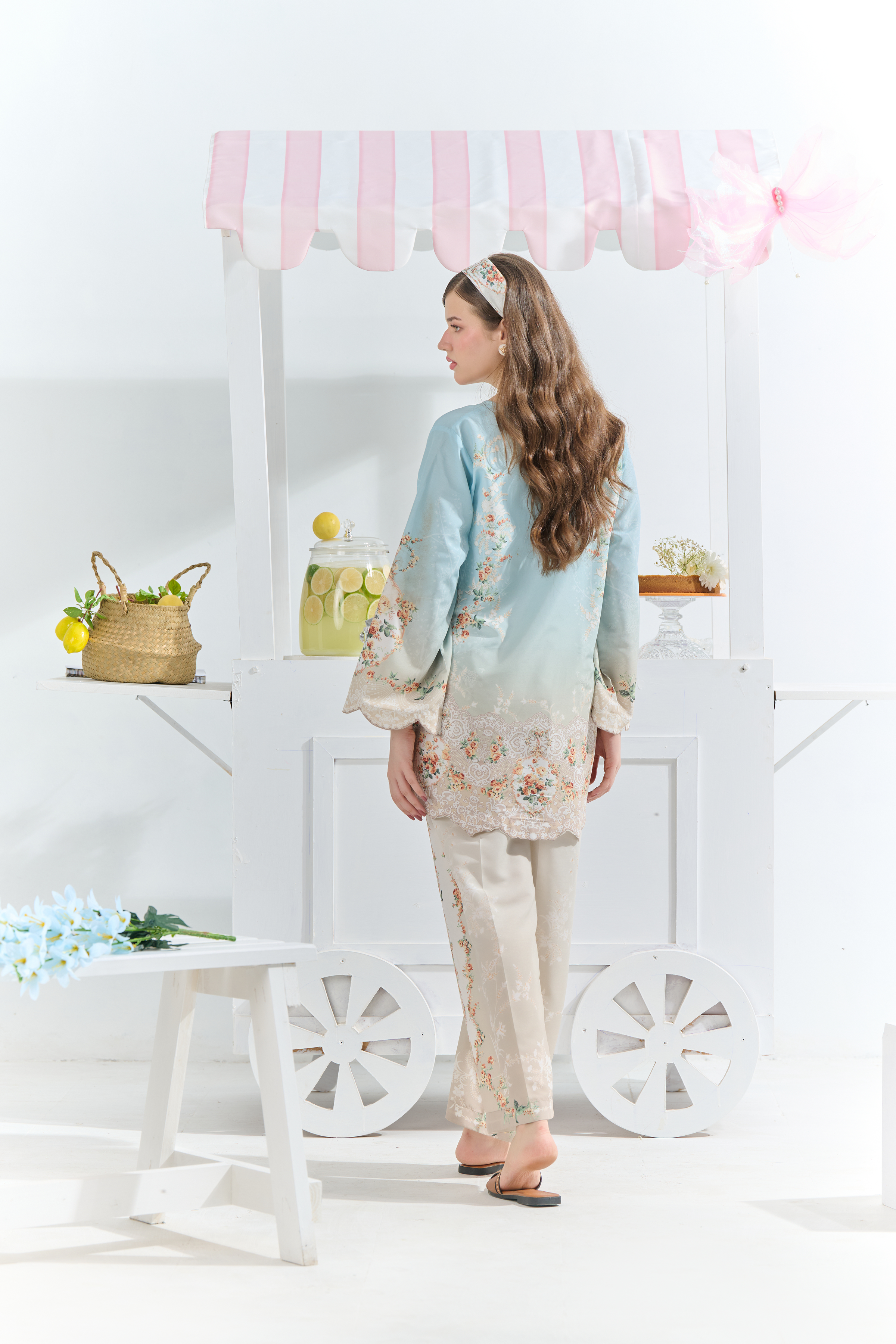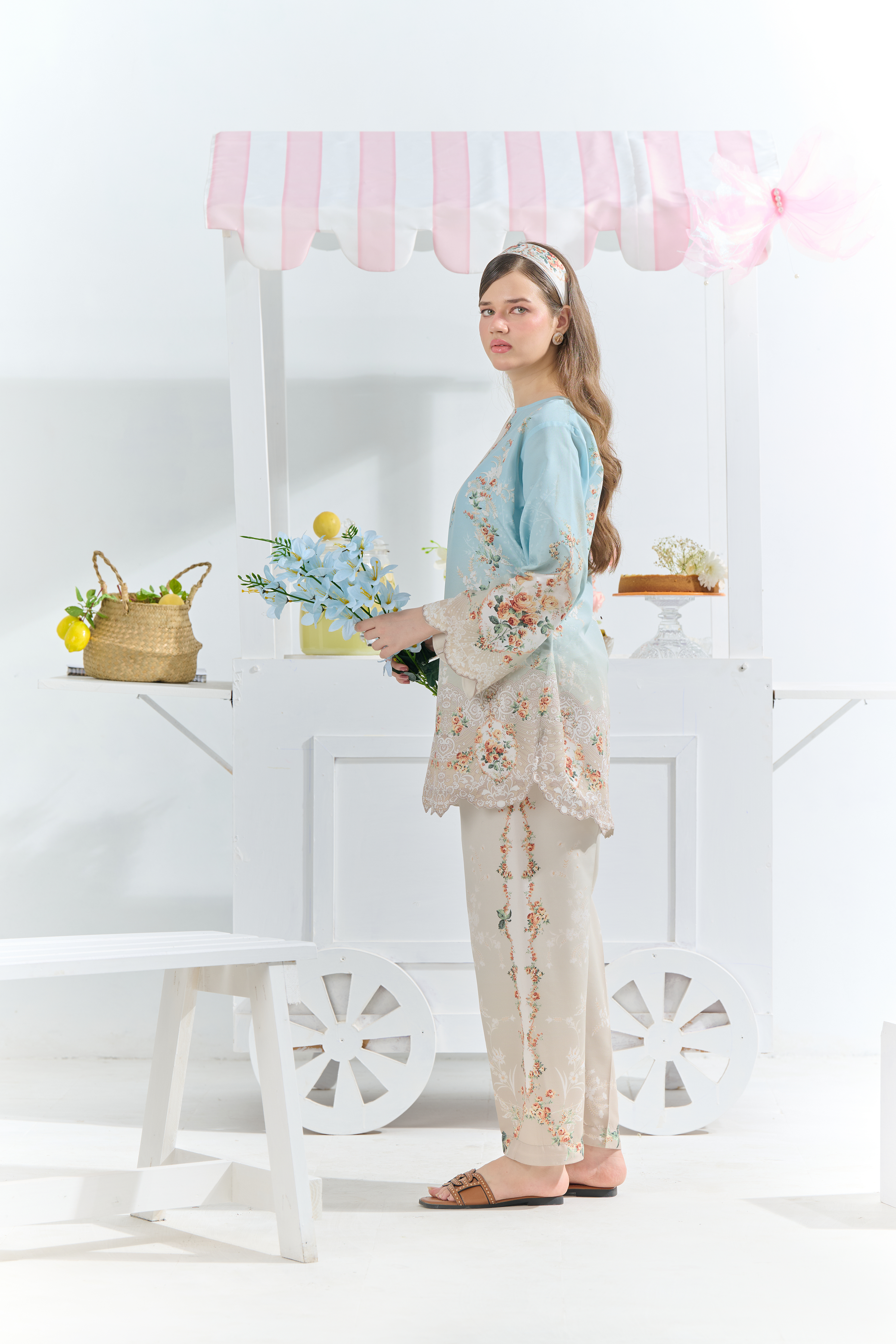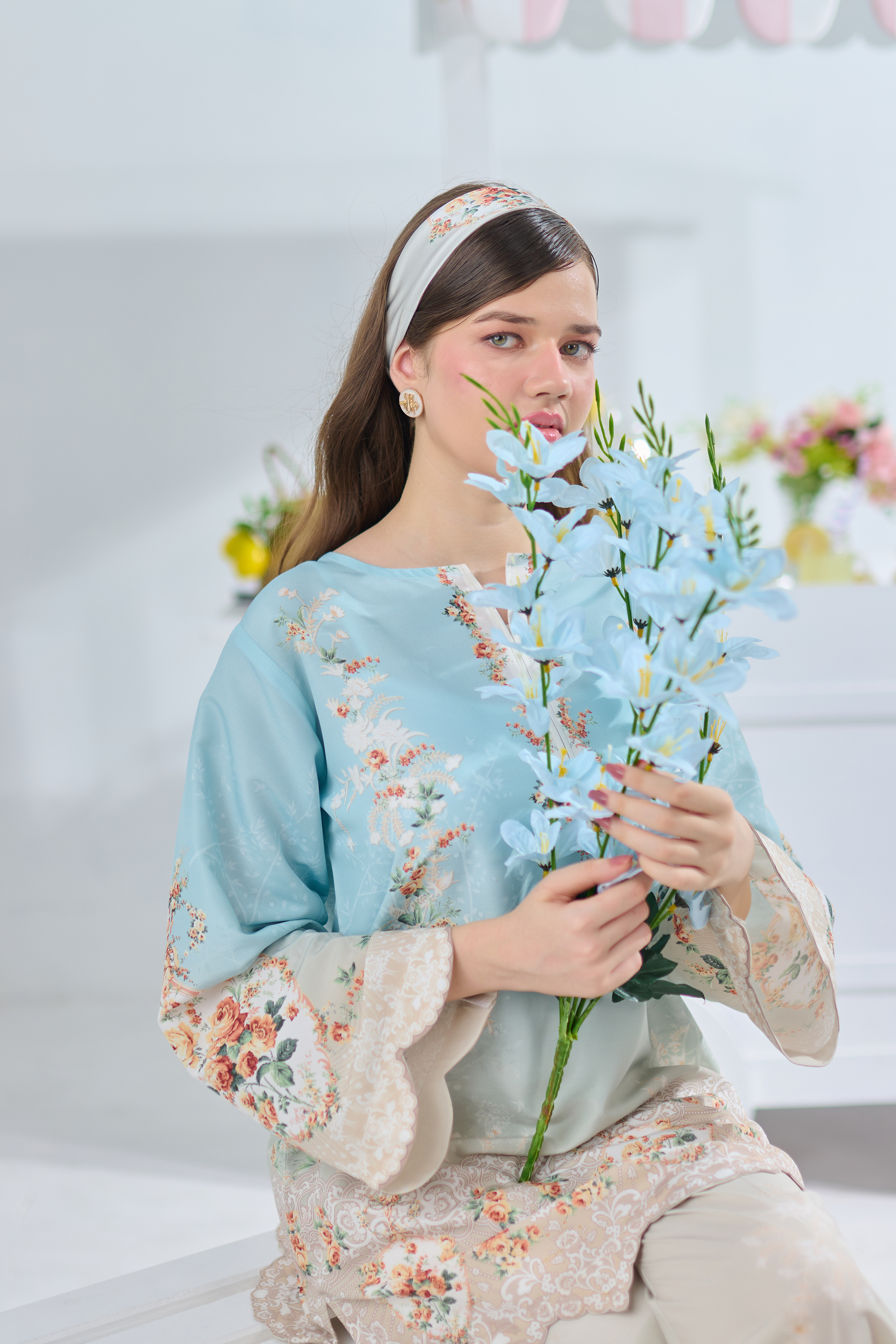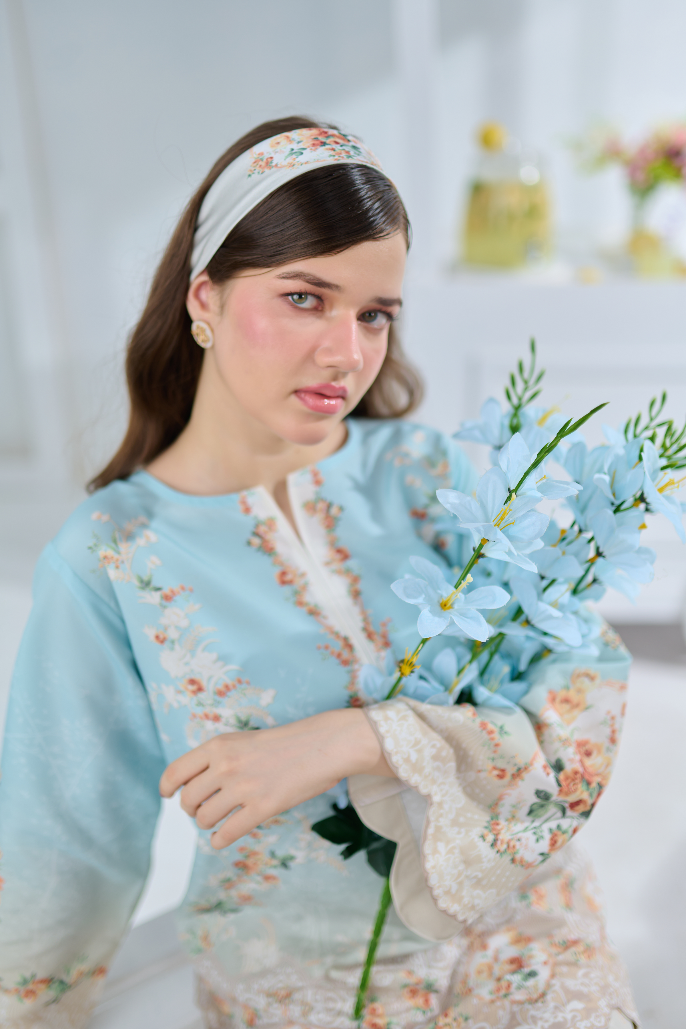 Color: A sky blue and ivory base beautifully highlights multi-colour vintage florals, creating a soft and timeless design.