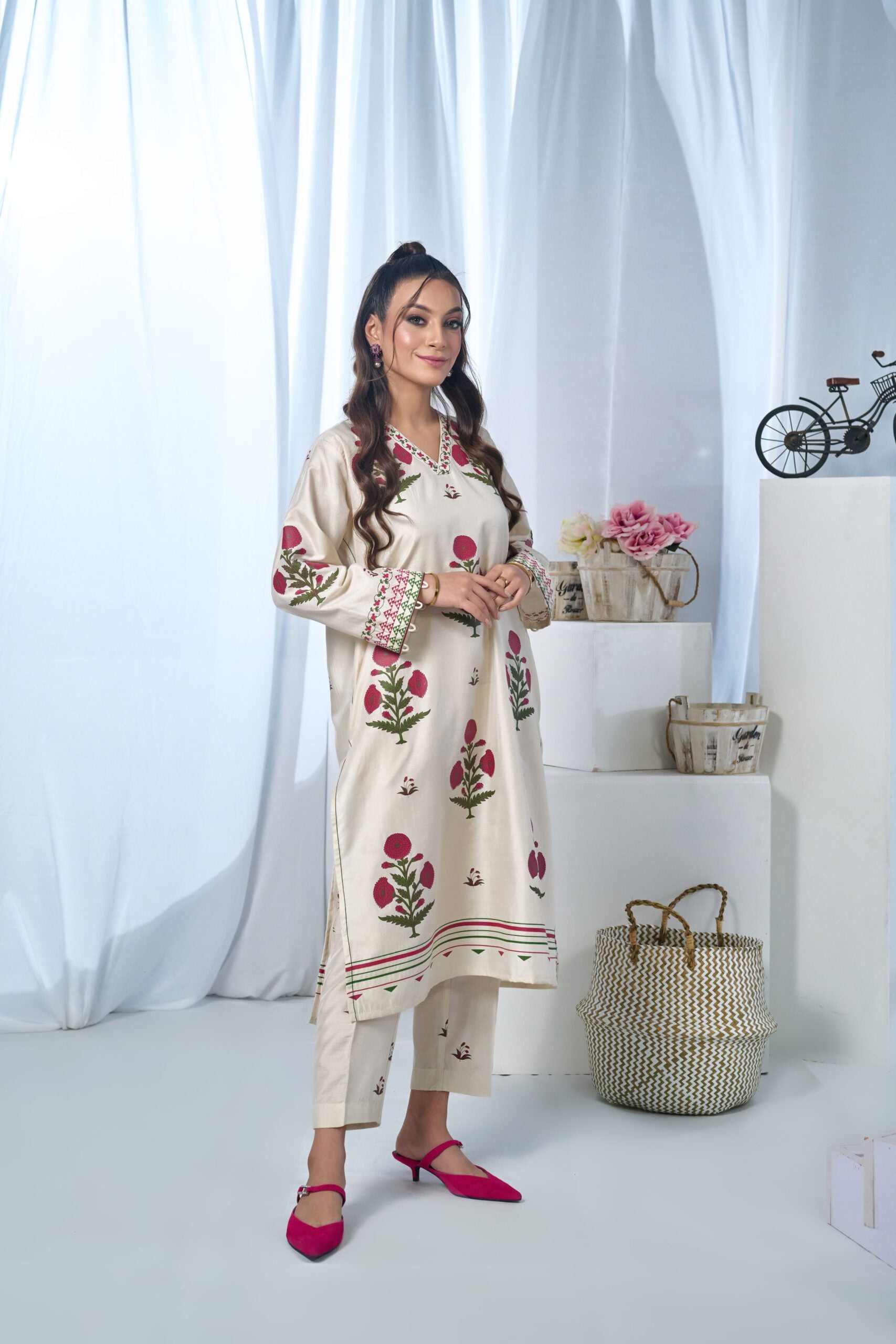 Pearl white shirt enhanced with soothing floral hand screen printed for classic look.