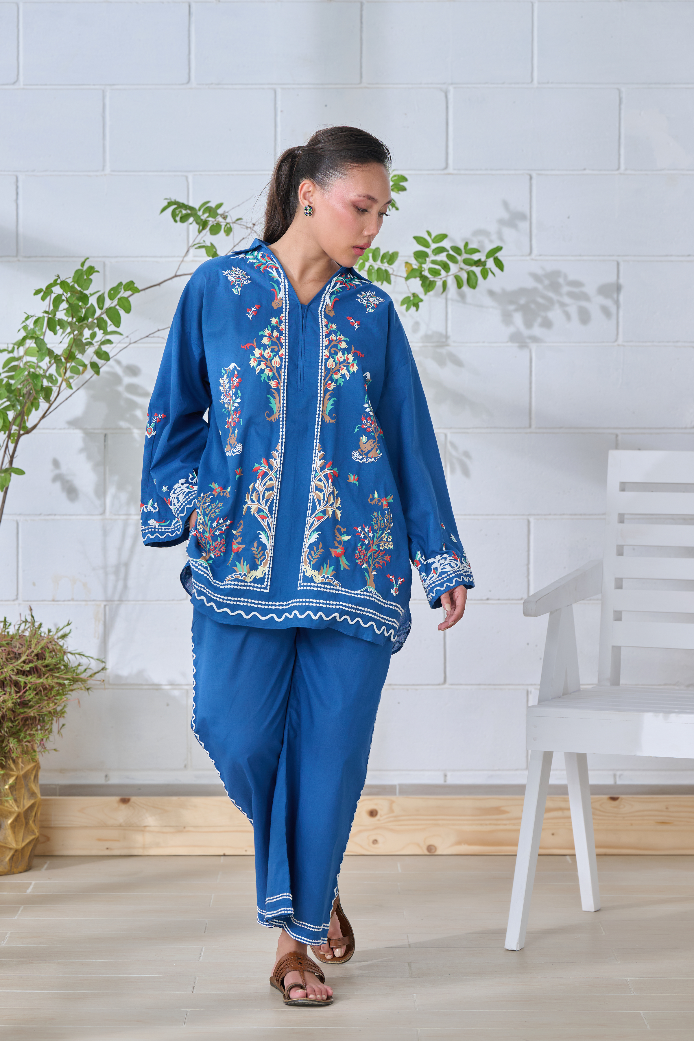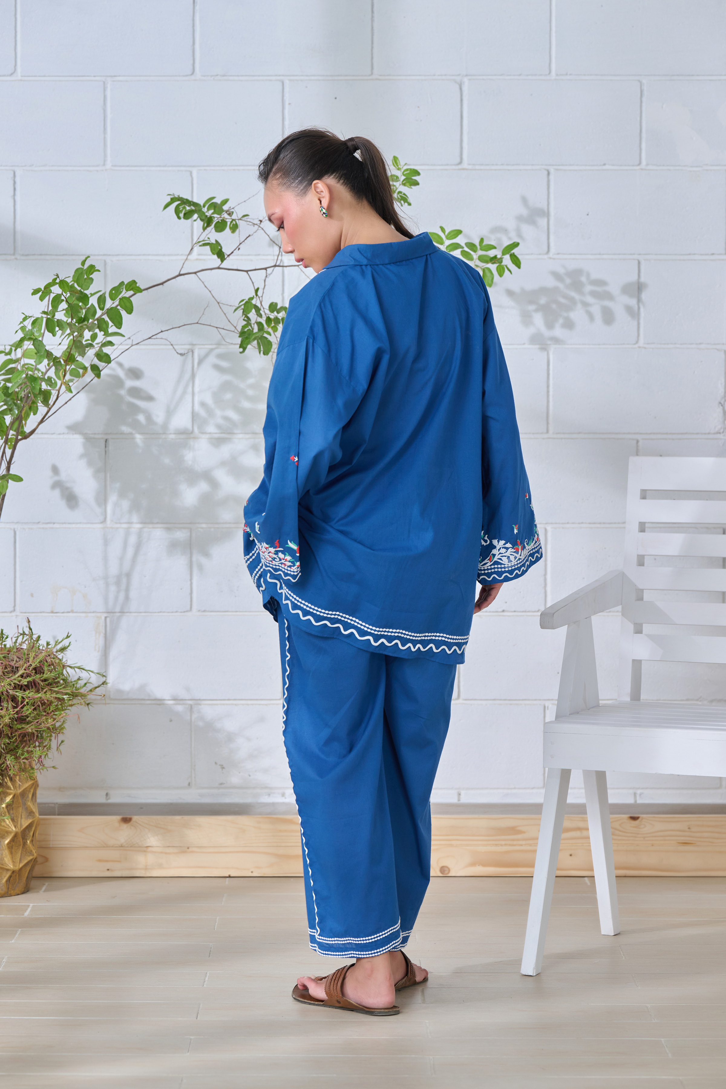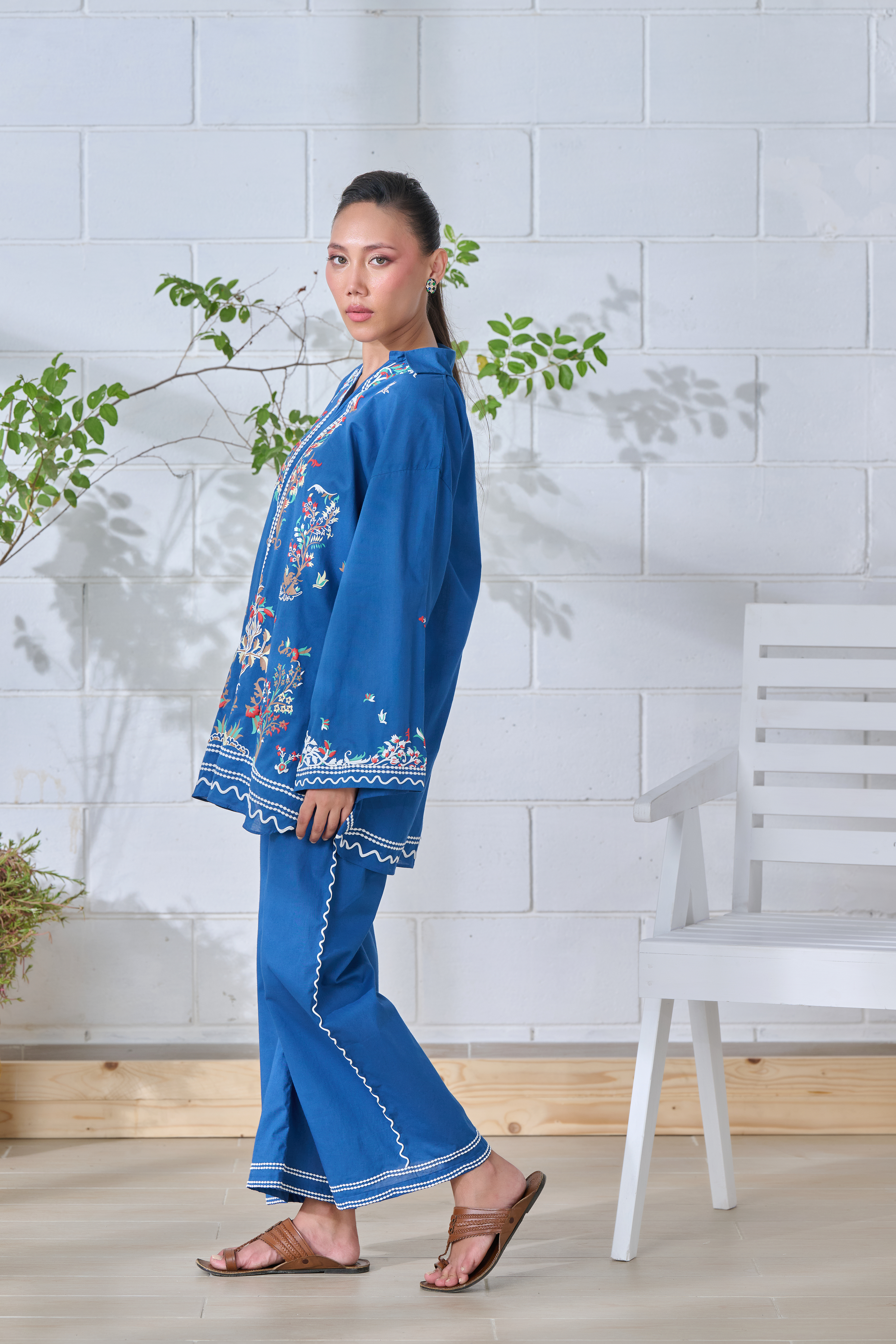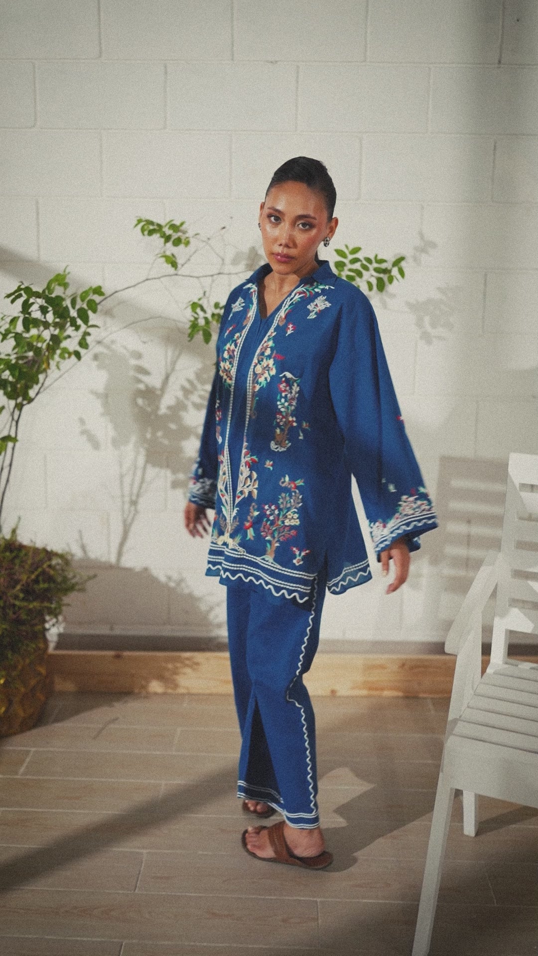 Description: Designed for the modern woman, this relaxed blue co-ord set transitions effortlessly from work to after-hours. The top features Persian-inspired motifs in a mix of flat and embossed screen prints, adding depth and elegance. Paired with minimalist straight trousers detailed with subtle zigzag pattern, this look blends comfort with cultural charm—perfect for everyday sophistication.