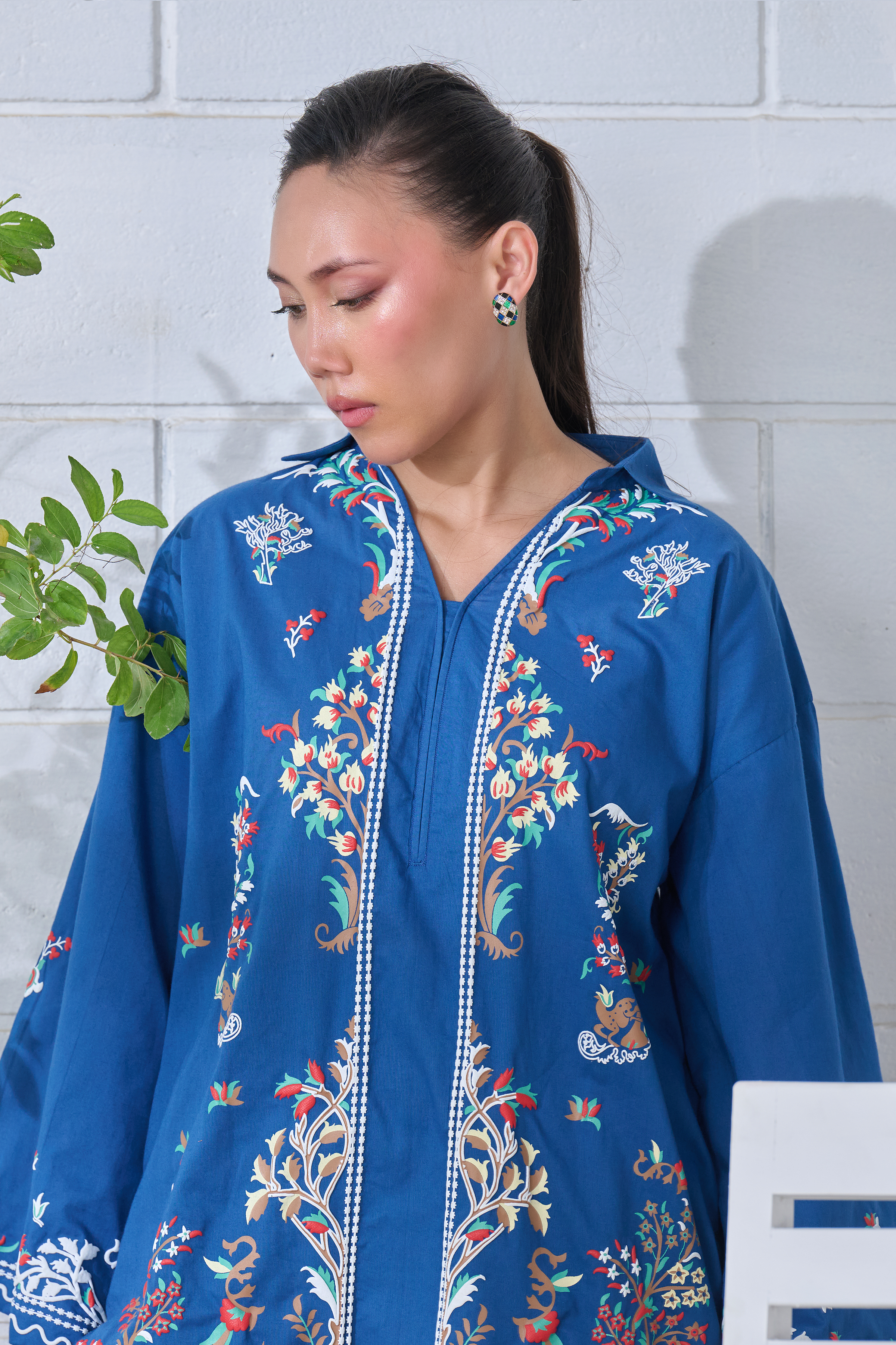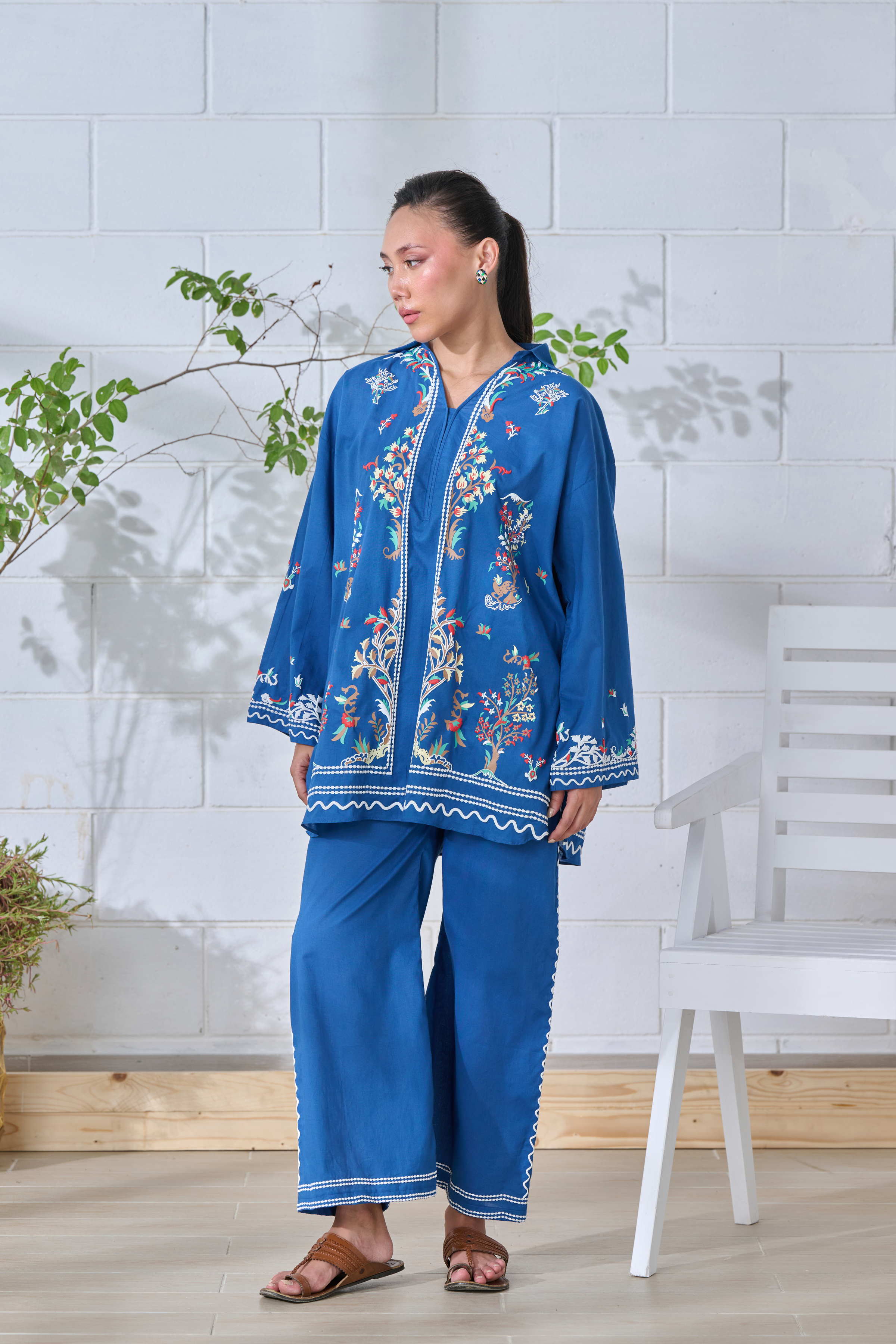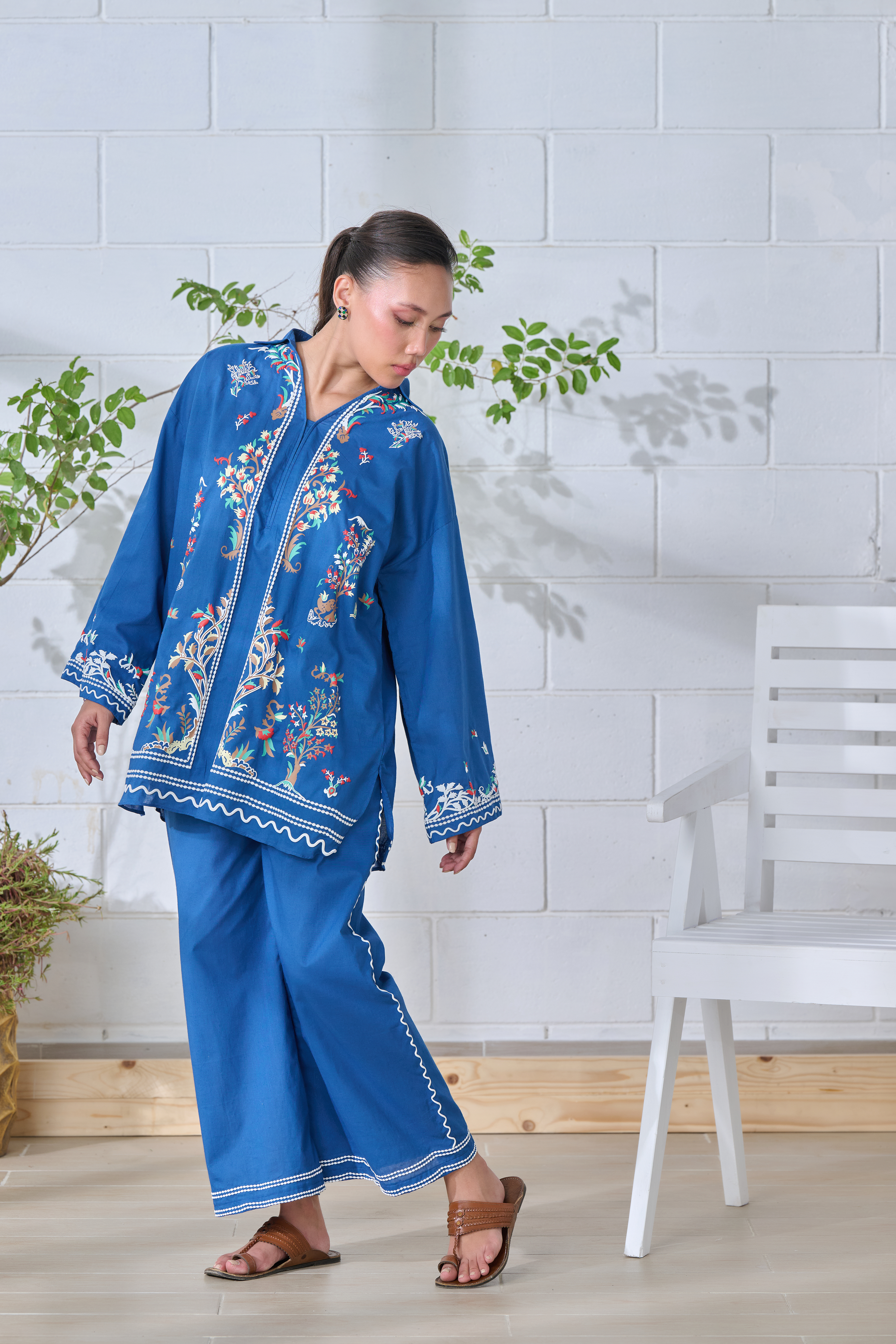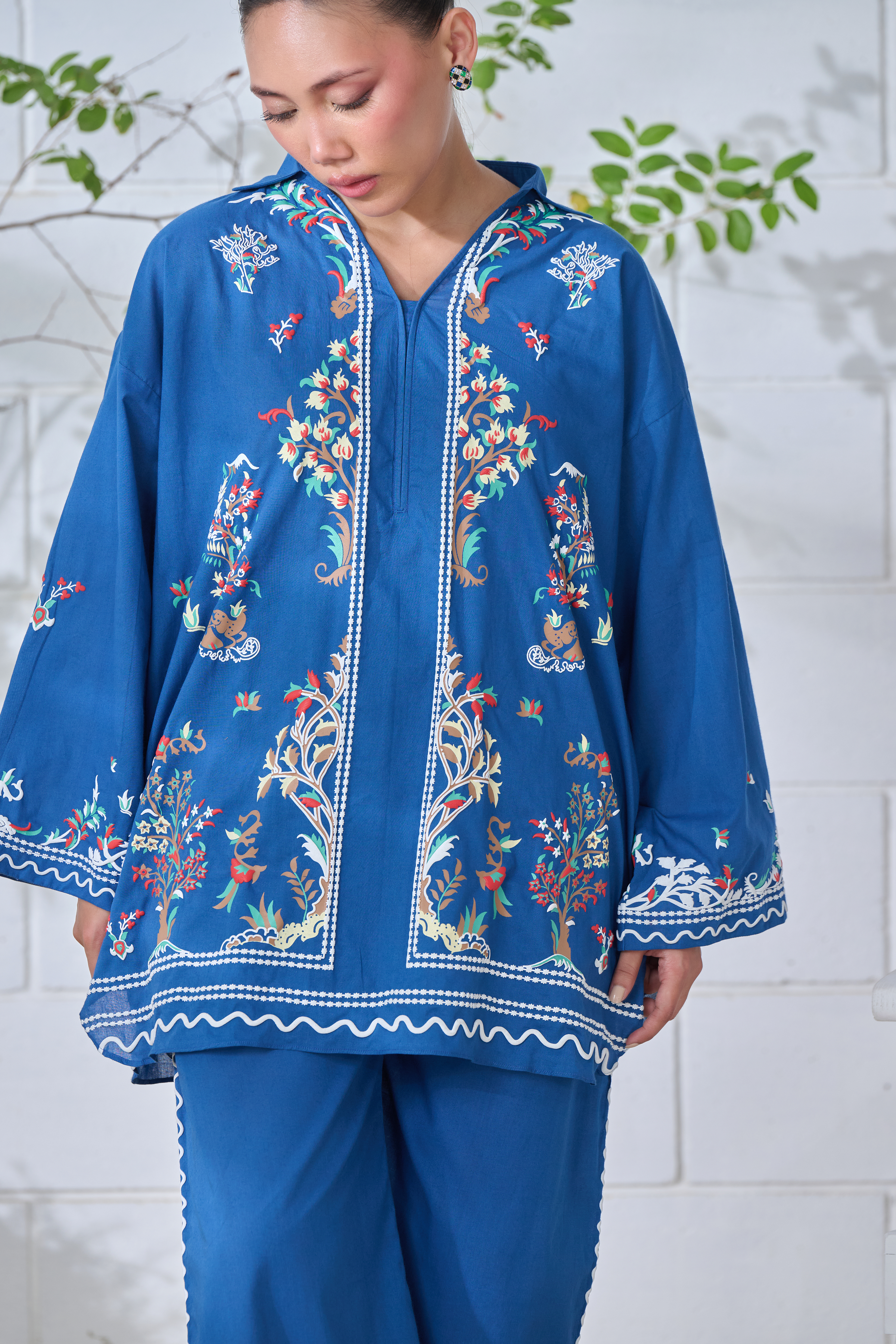 Description: Designed for the modern woman, this relaxed blue co-ord set transitions effortlessly from work to after-hours. The top features Persian-inspired motifs in a mix of flat and embossed screen prints, adding depth and elegance. Paired with minimalist straight trousers detailed with subtle zigzag pattern, this look blends comfort with cultural charm—perfect for everyday sophistication.