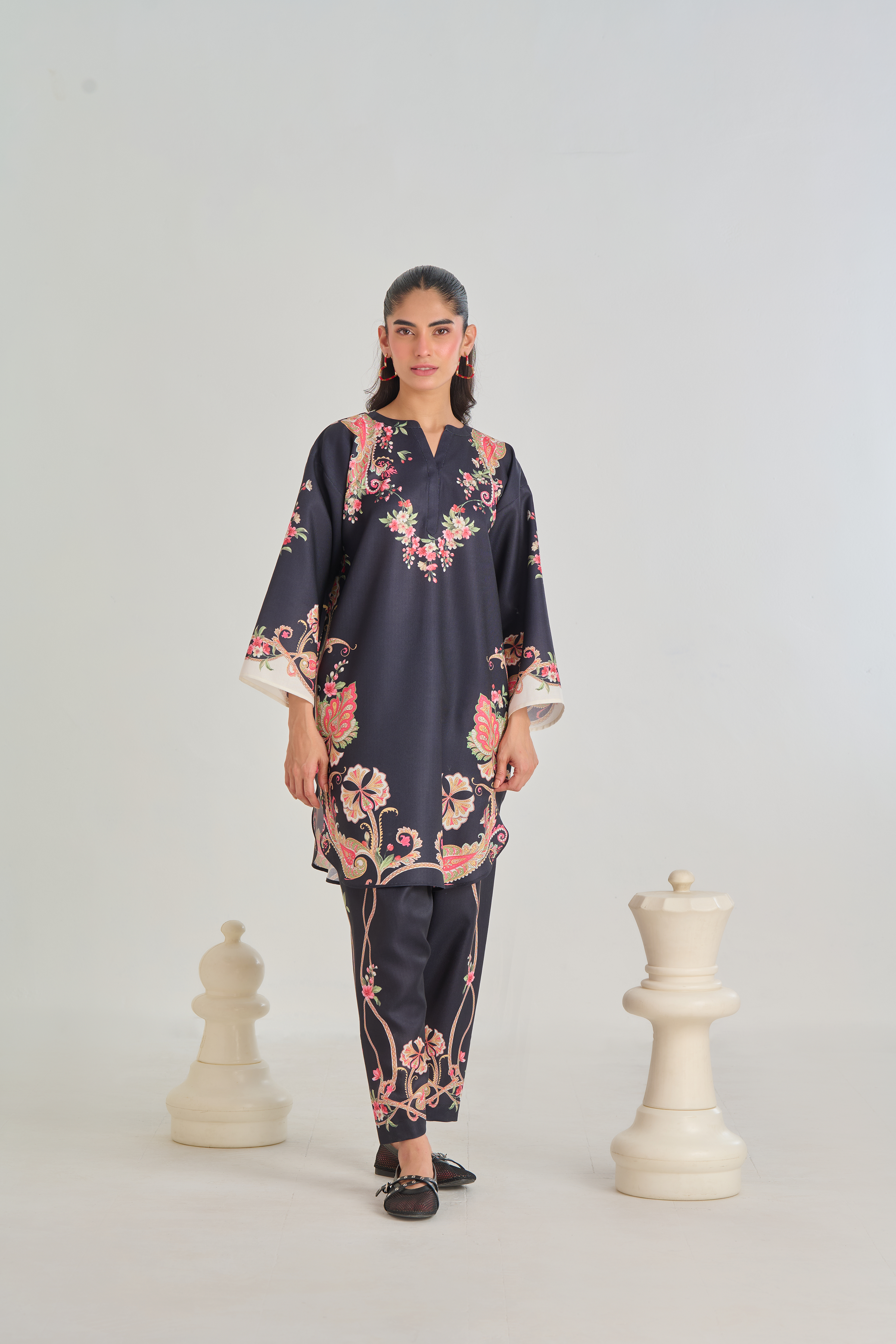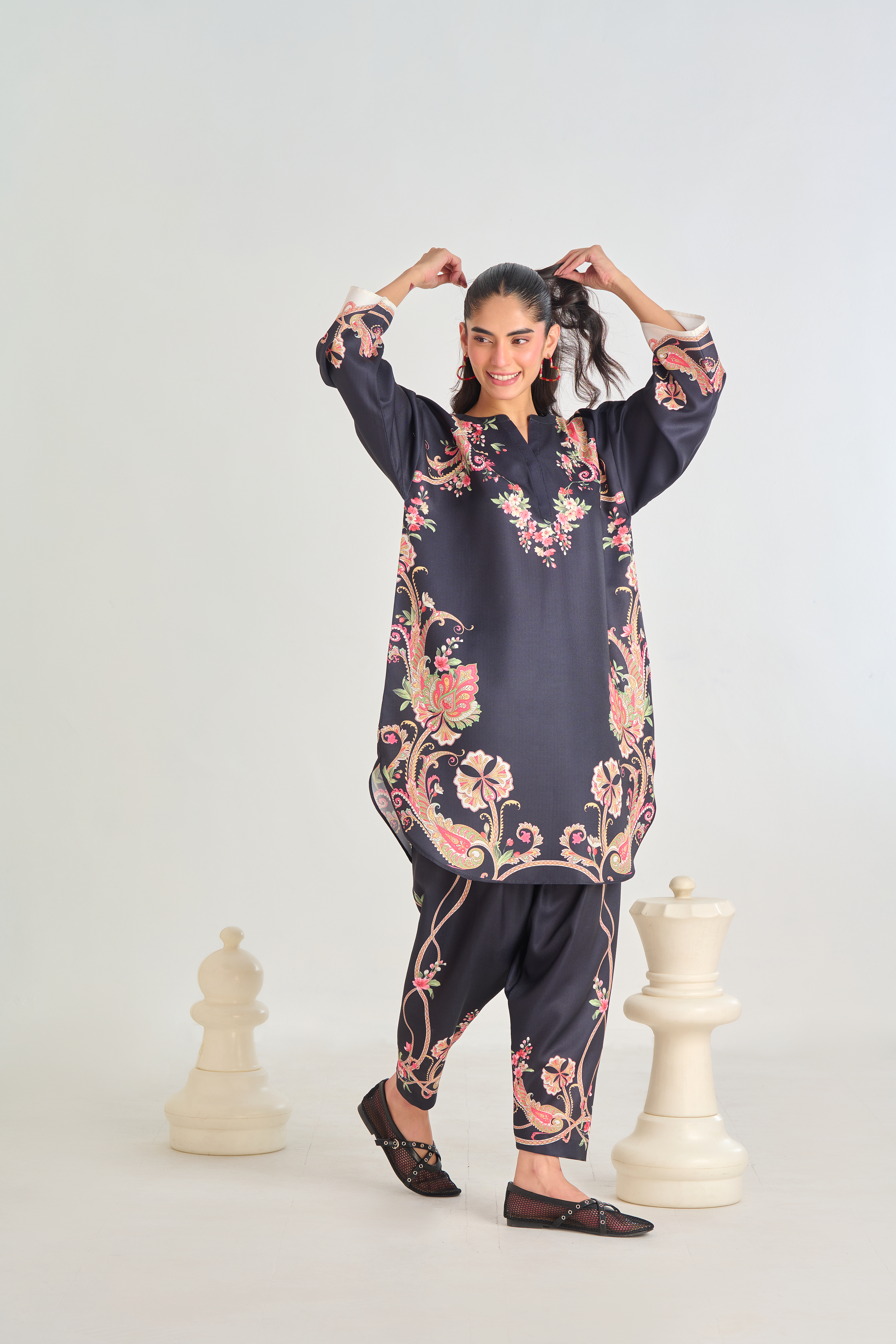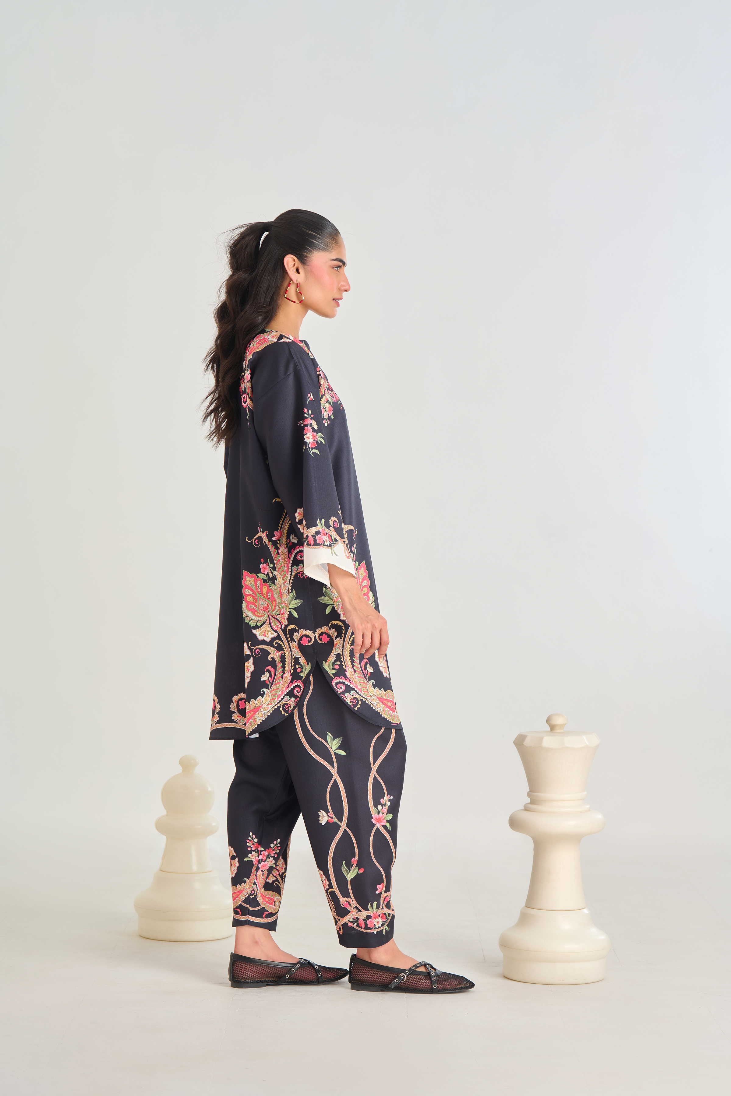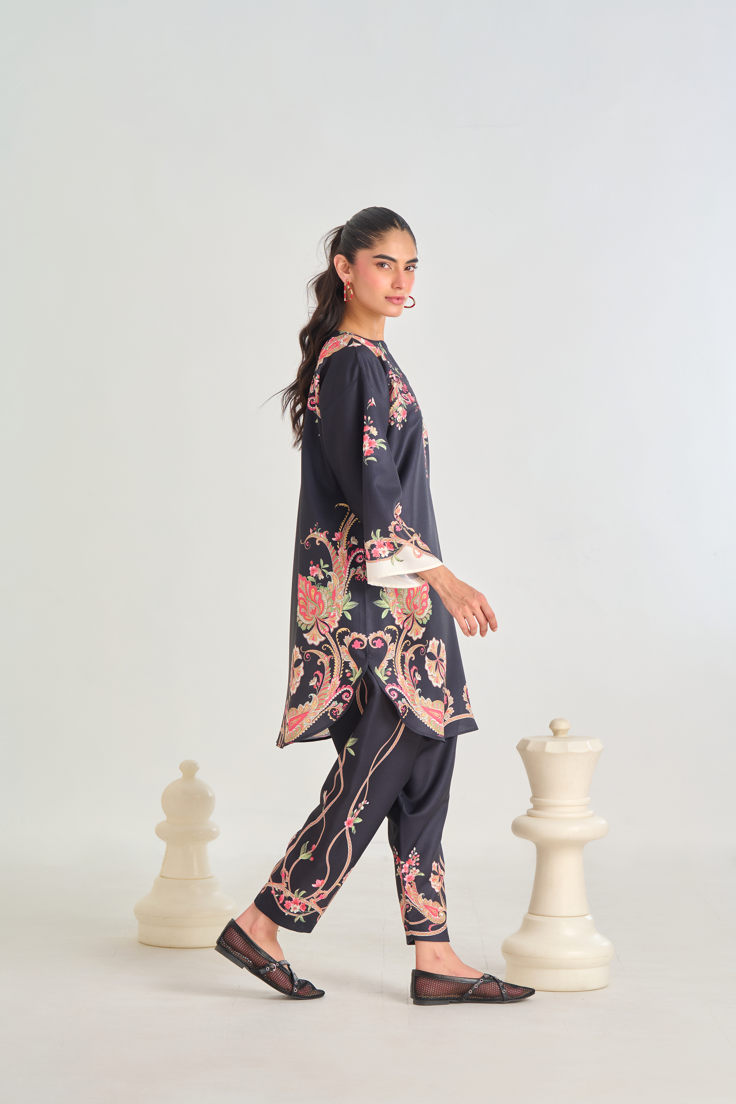 Description: Infuse classic charm with a modern twist in this black cord set, featuring a traditional paisley placement print in soft shades of pink, beige, and green. The intricate motifs bring a touch of heritage elegance, while the vibrant yet subtle colors add warmth and character. Crafted for both comfort and style.