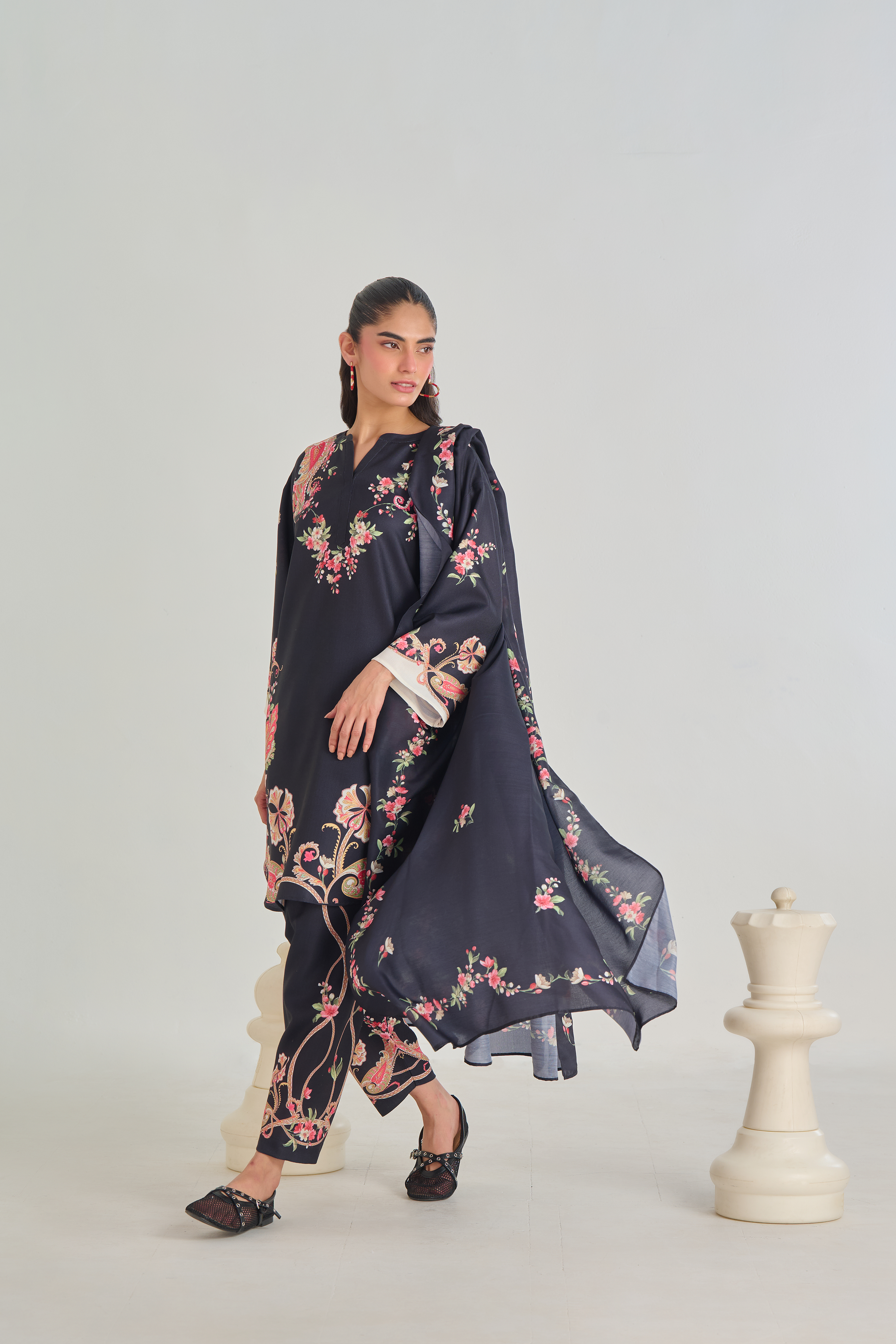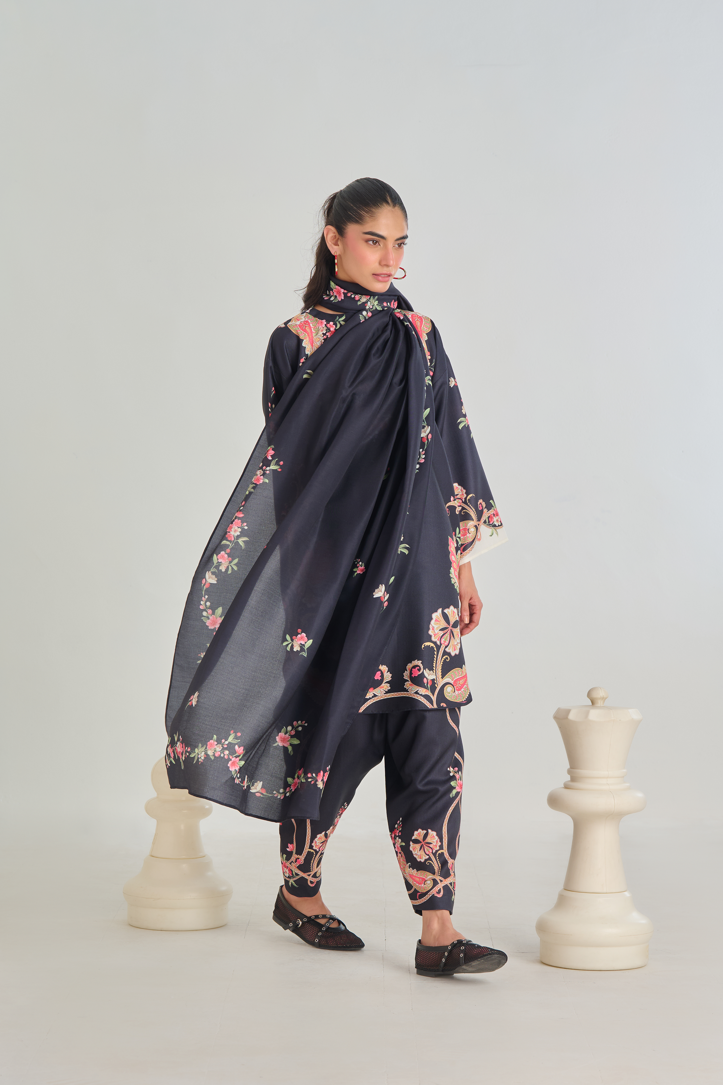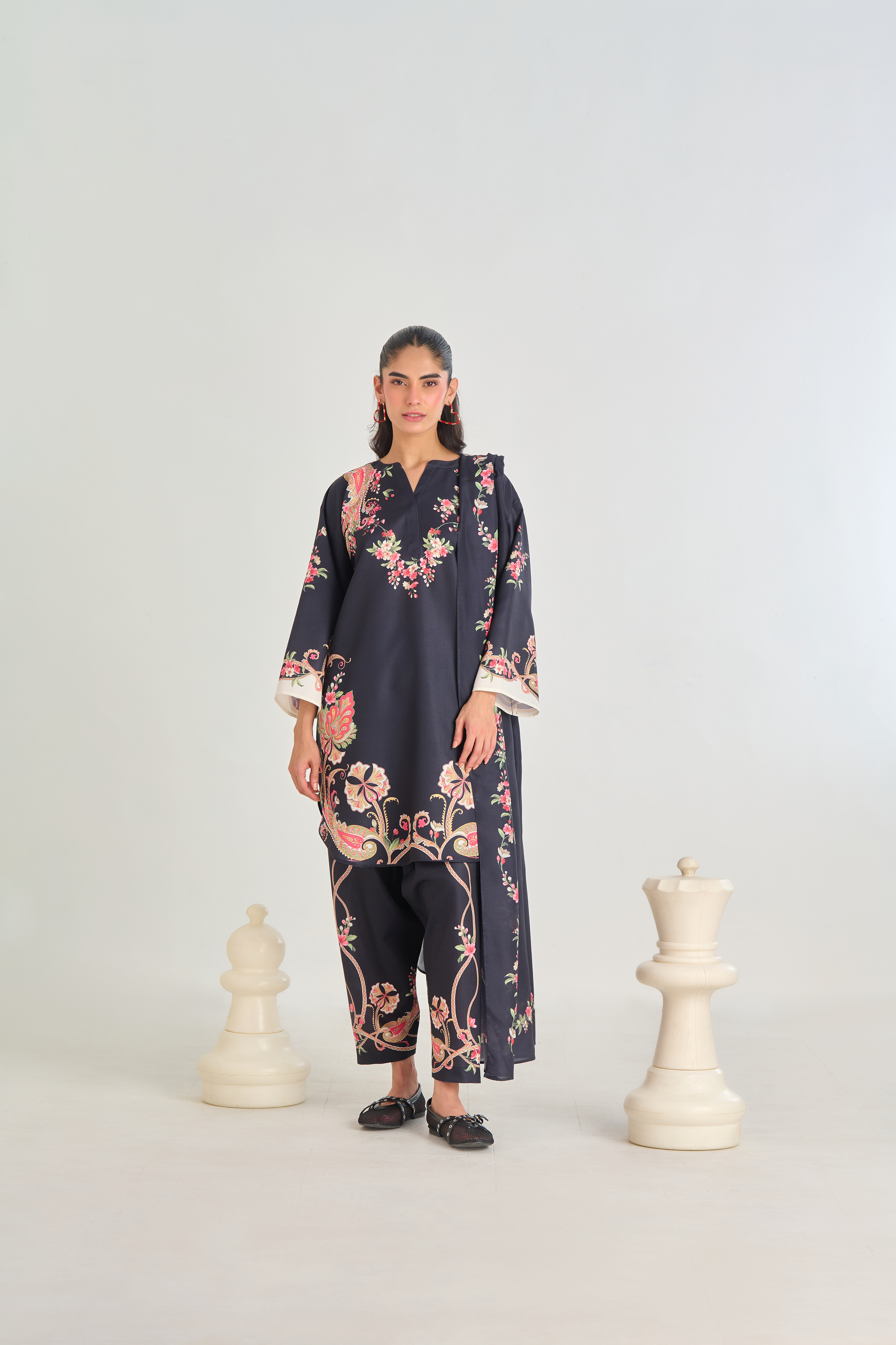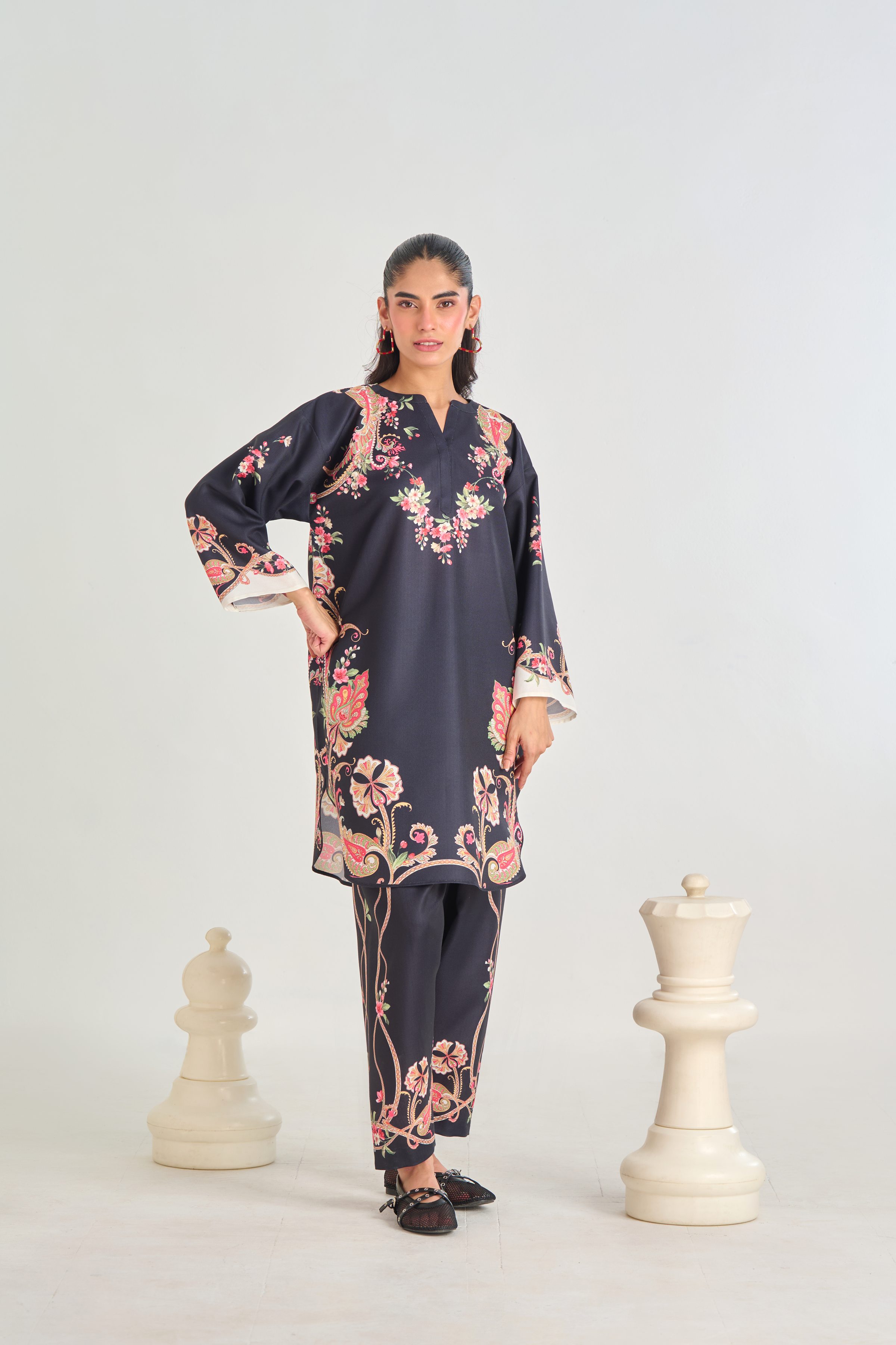 Description: Infuse classic charm with a modern twist in this black cord set, featuring a traditional paisley placement print in soft shades of pink, beige, and green. The intricate motifs bring a touch of heritage elegance, while the vibrant yet subtle colors add warmth and character. Crafted for both comfort and style.