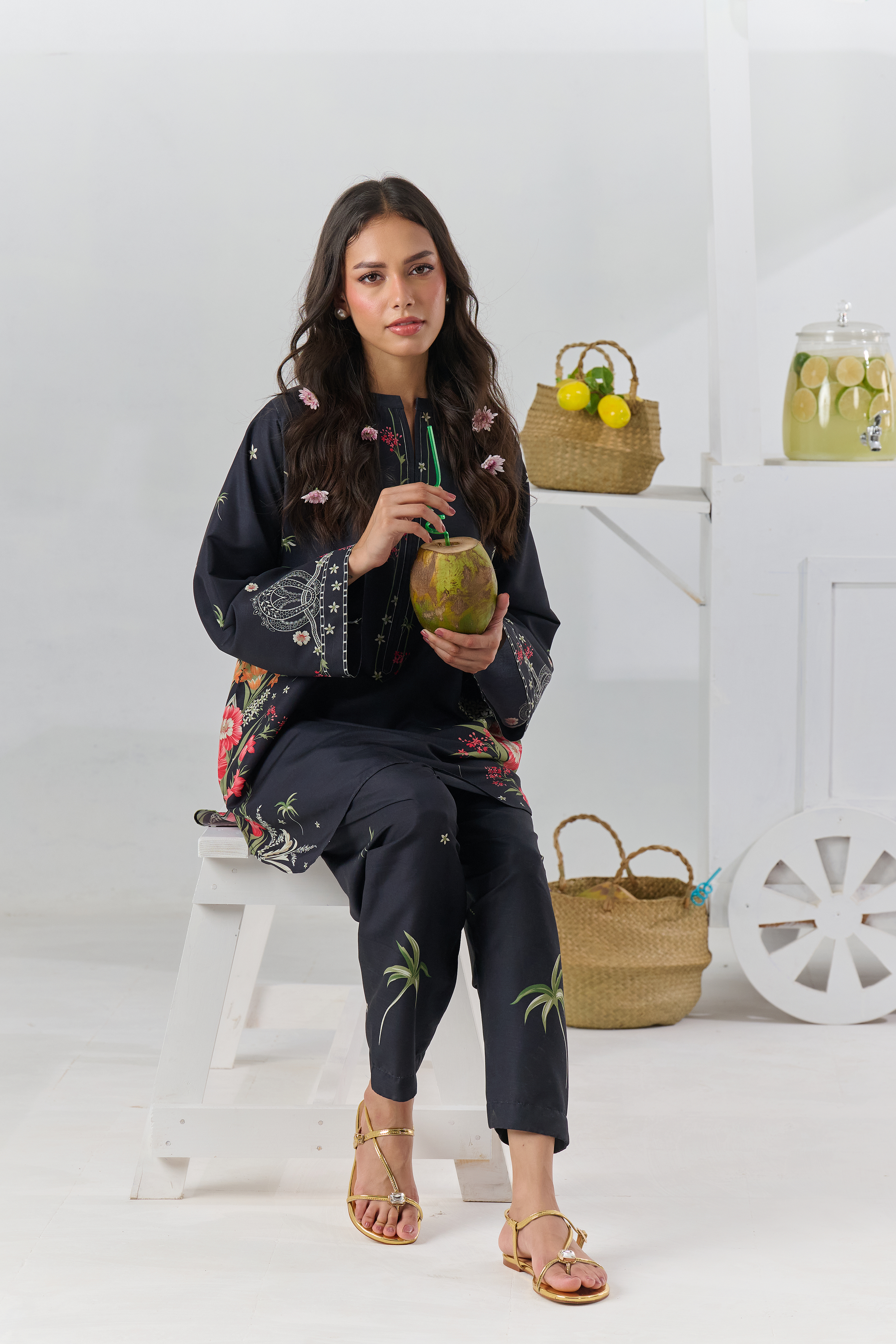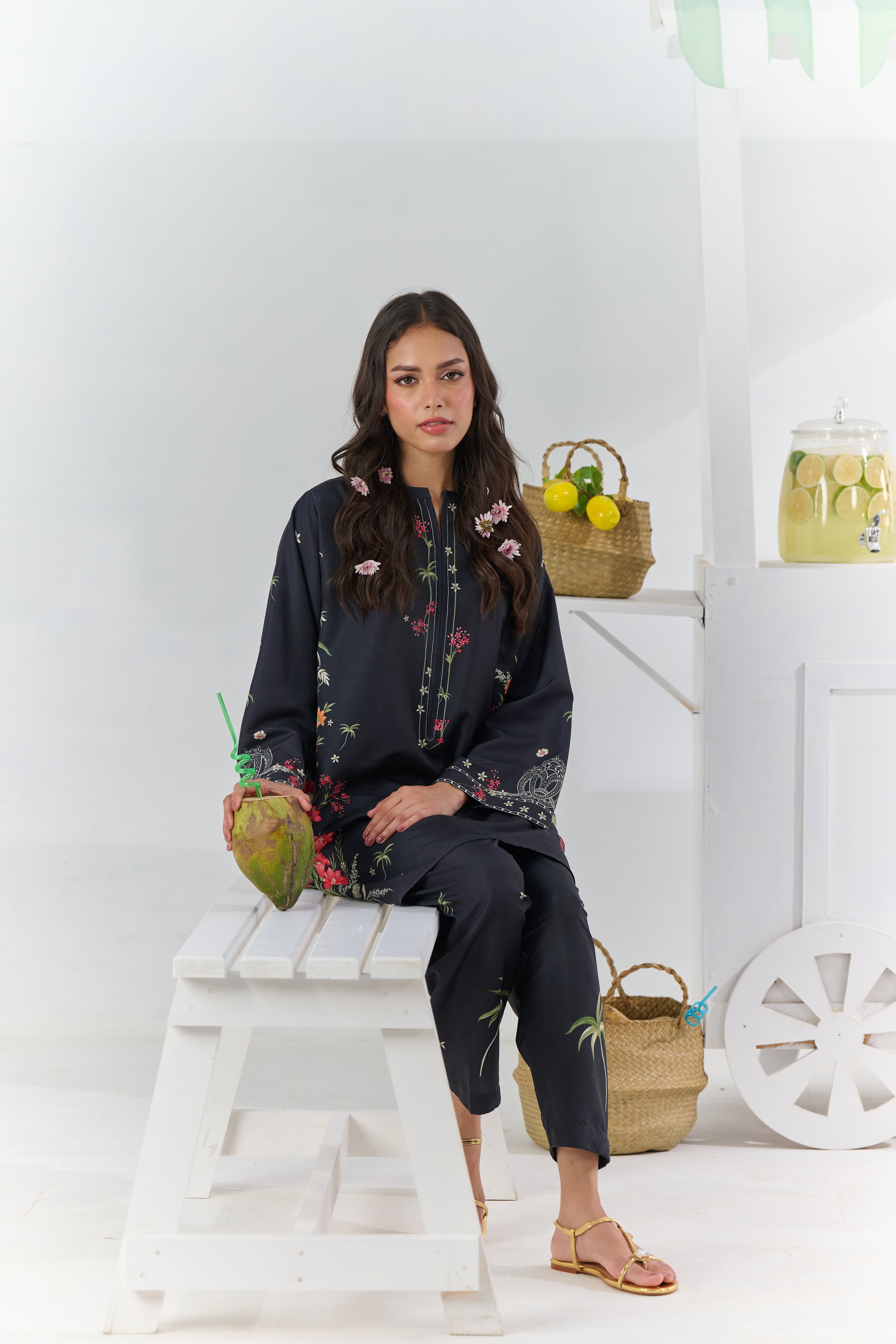 Color: A black set adorned with a vibrant multi-colour floral print is delicately highlighted by charming hints of daisies, adding a fresh and playful touch.