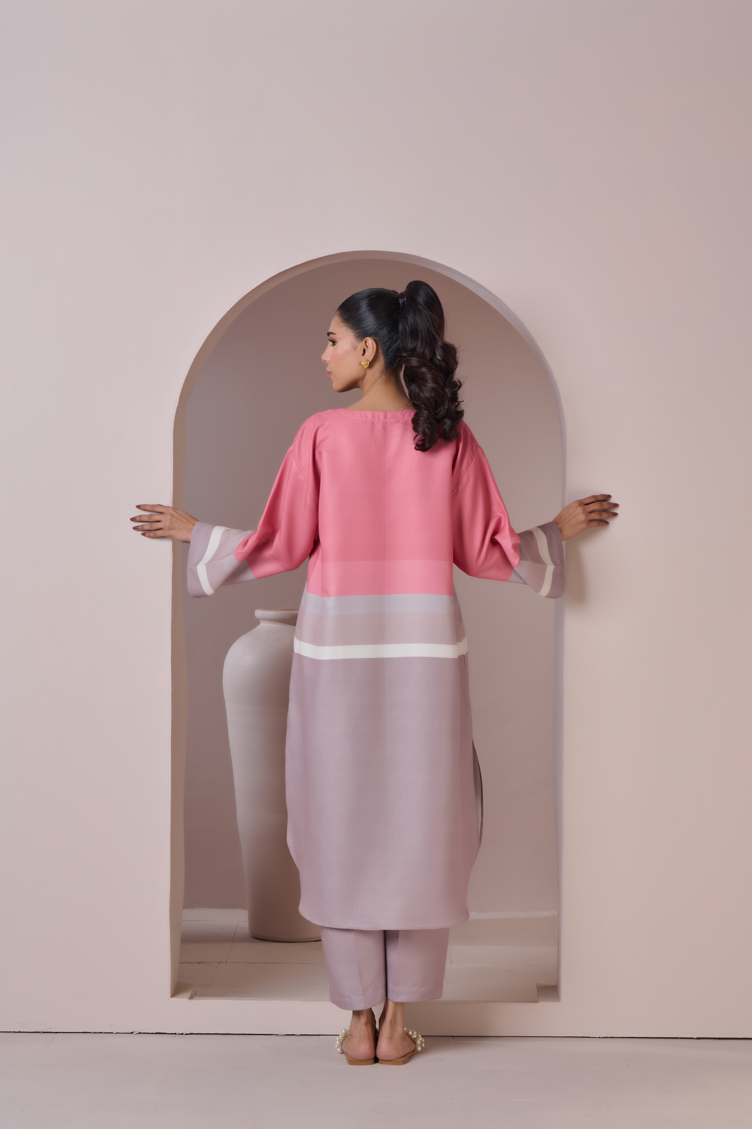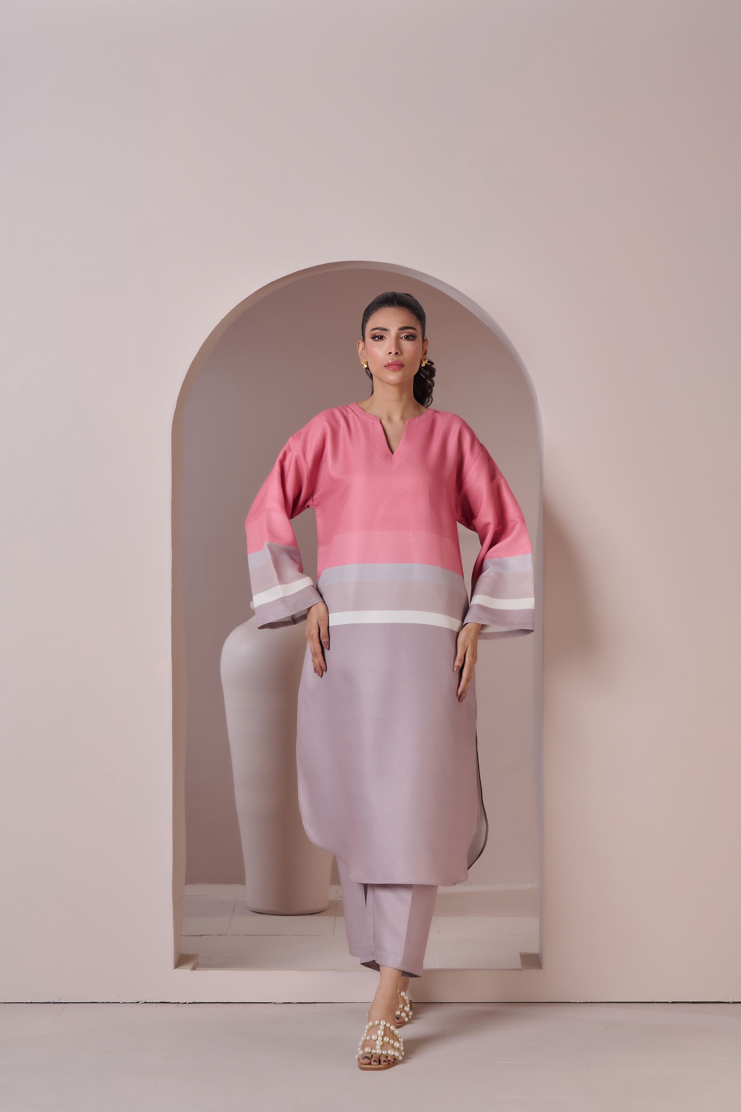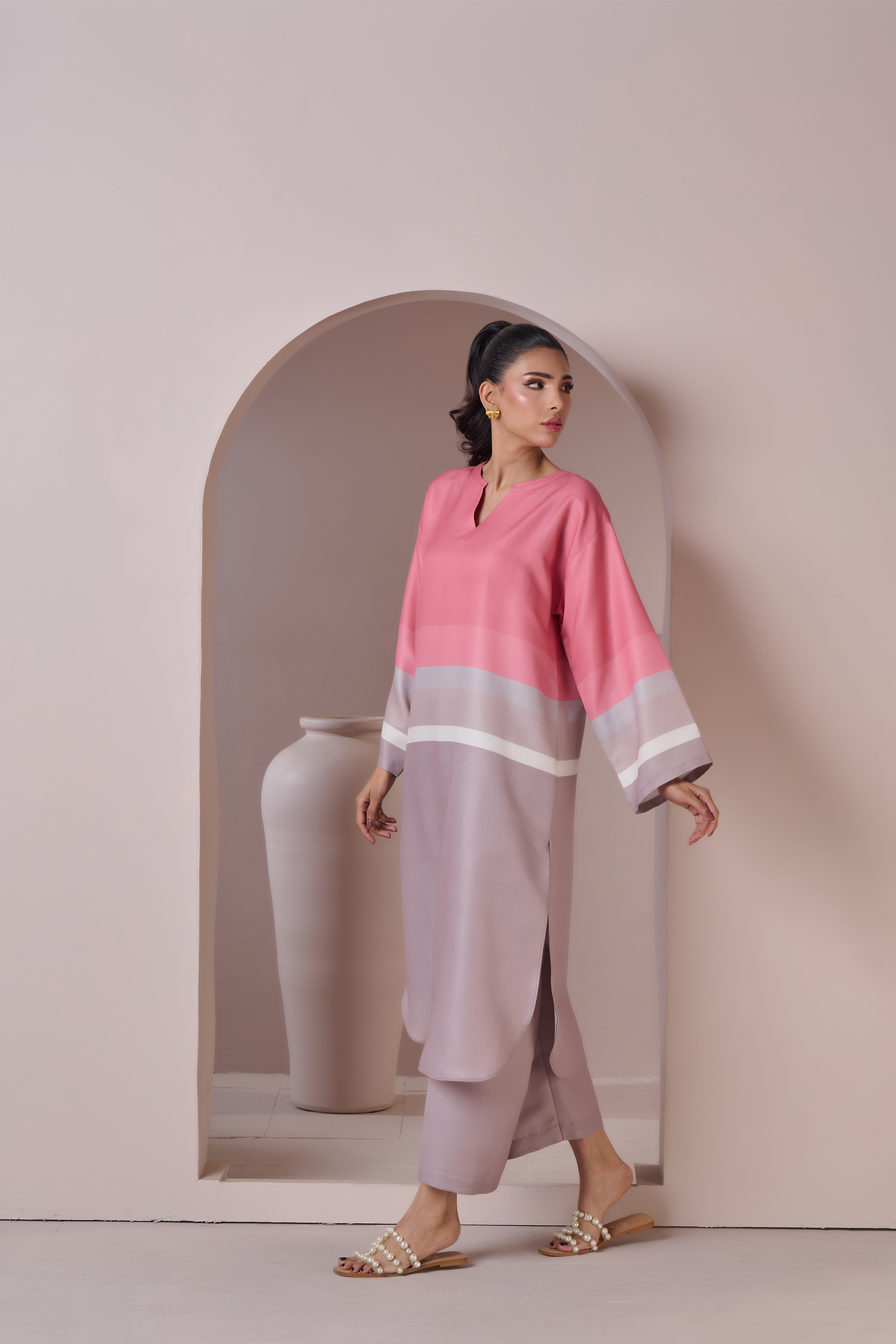 Description: Drape yourself in Salmon Pink and Beige set– a classic outfit that speaks volumes in style