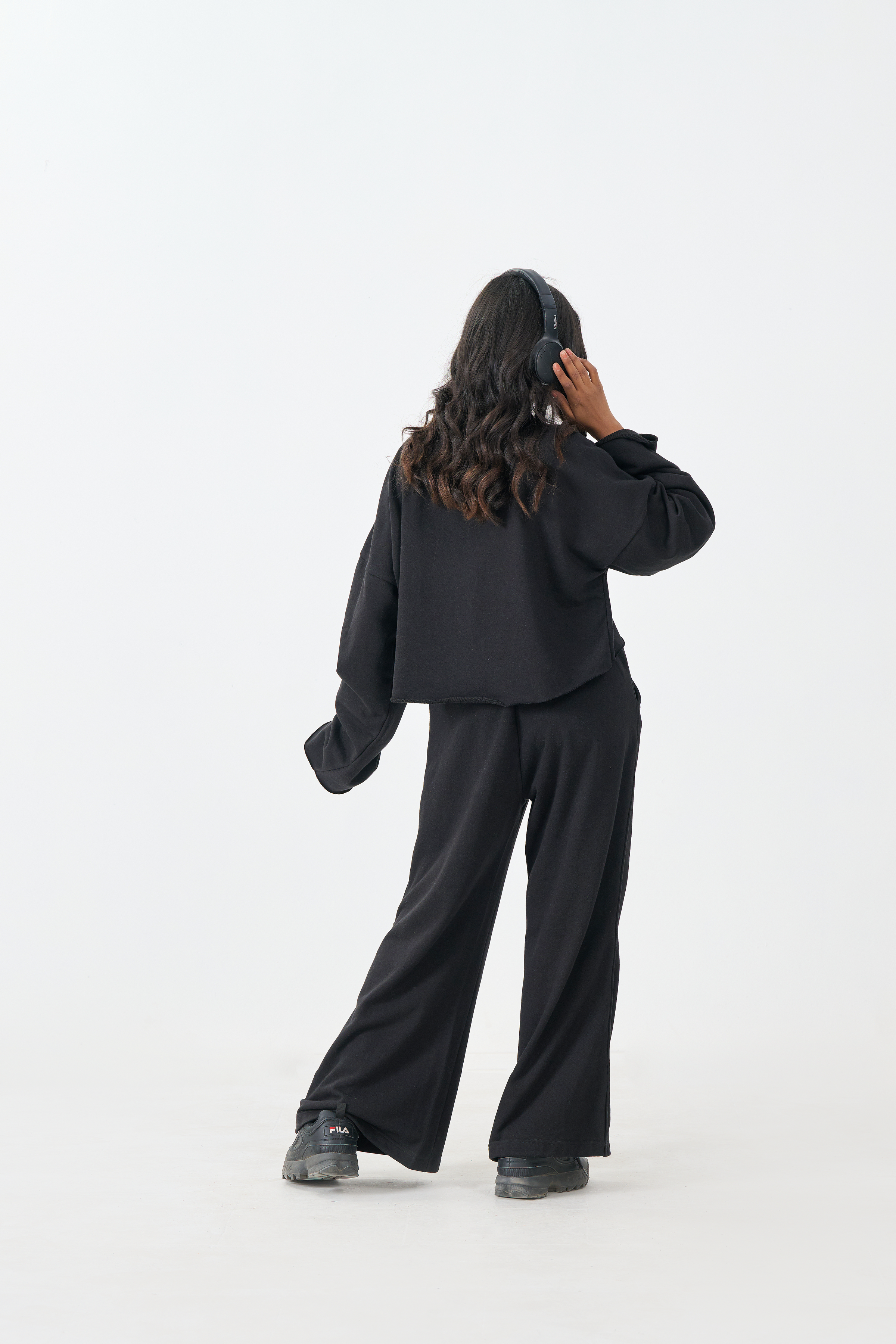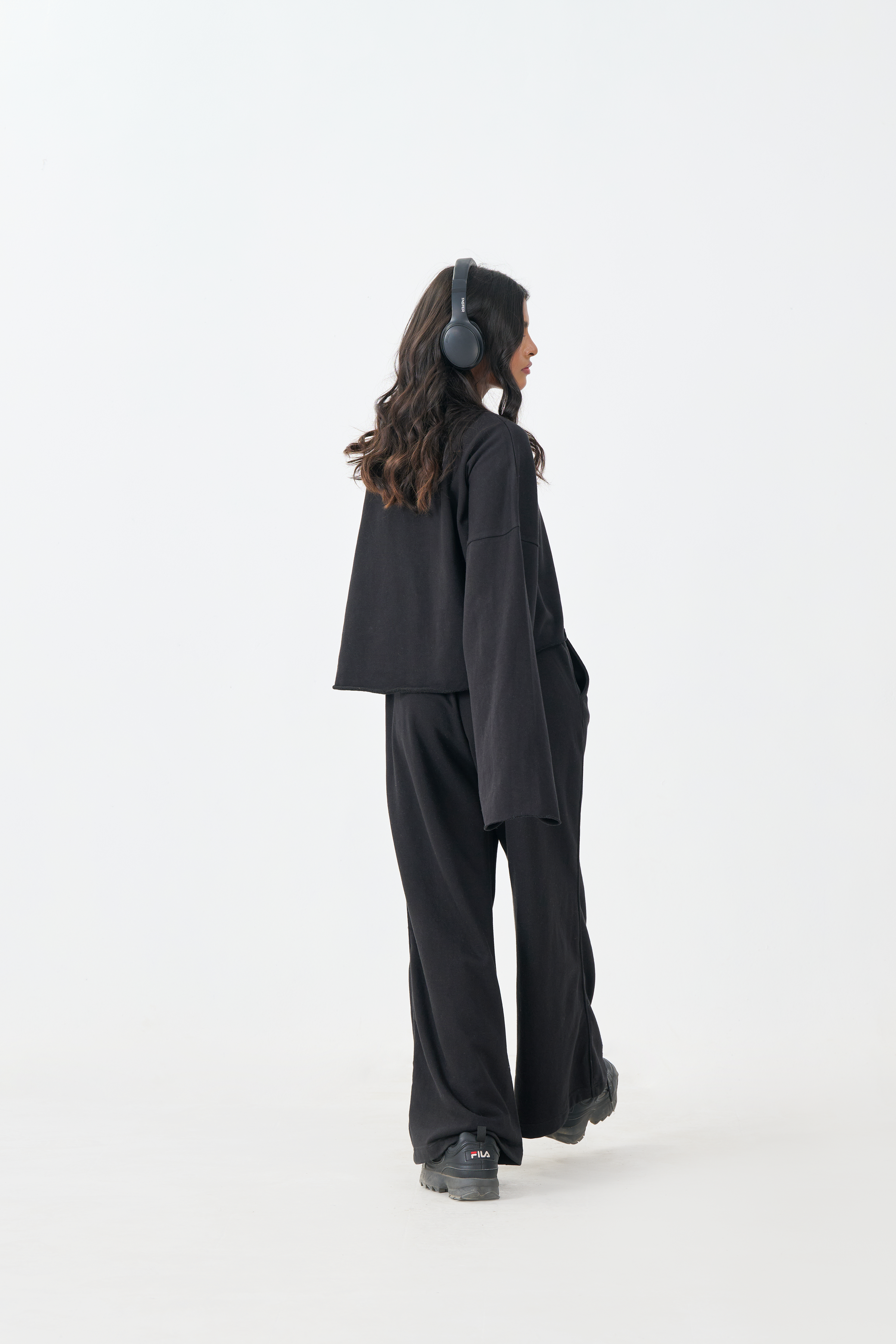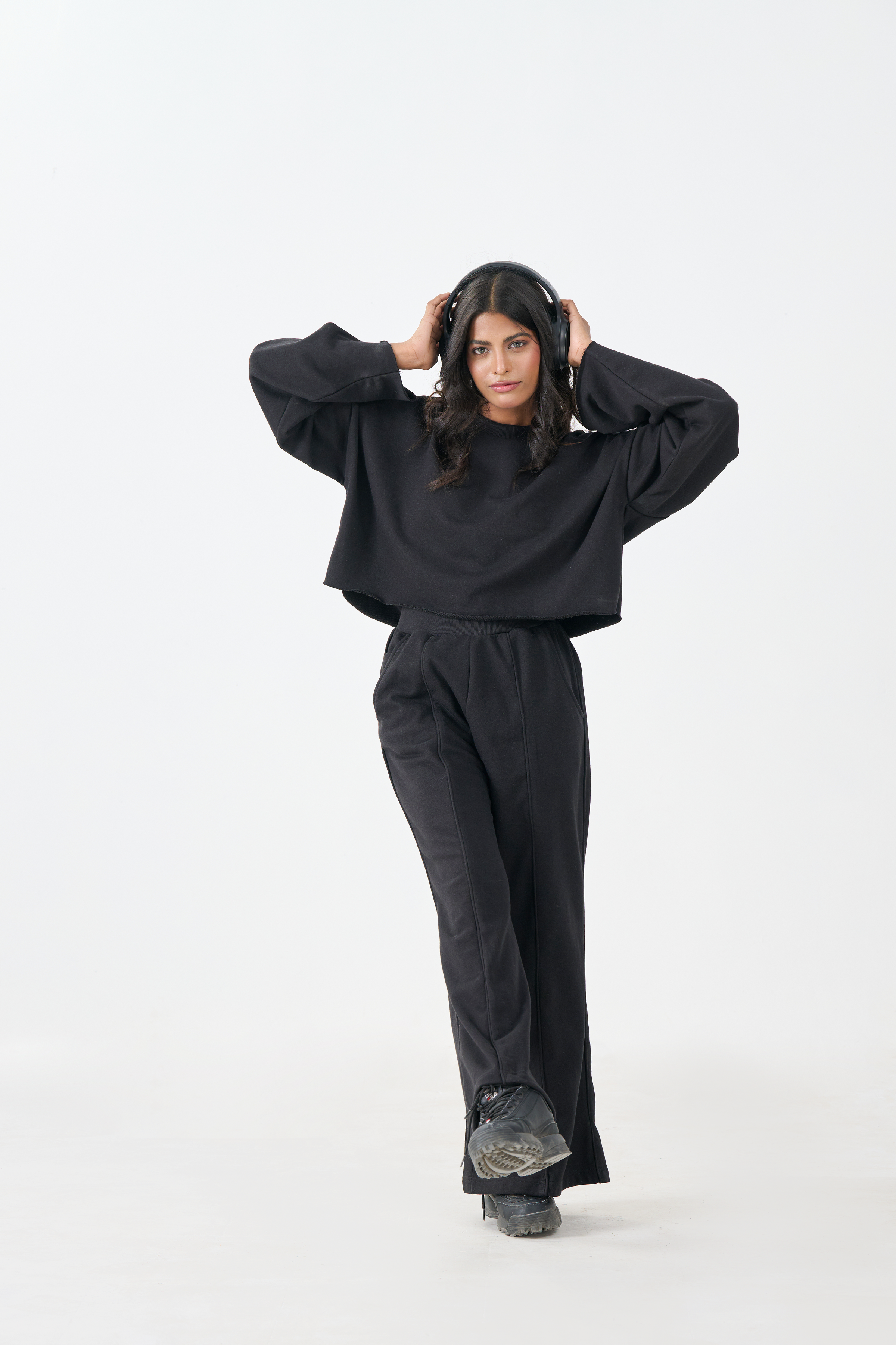 This essential Black Crop Top offers an effortless blend of comfort and modern style. Crafted from soft and cozy French Terry fabric, this top provides comfortable warmth with a luxurious feel. The design features a classic crew neck and a boxy, cropped silhouette, balanced by dramatically long sleeves. This top is perfect for creating a clean, monochromatic aesthetic when paired with the matching French Terry wide-leg trousers, or for styling as a sophisticated separate.