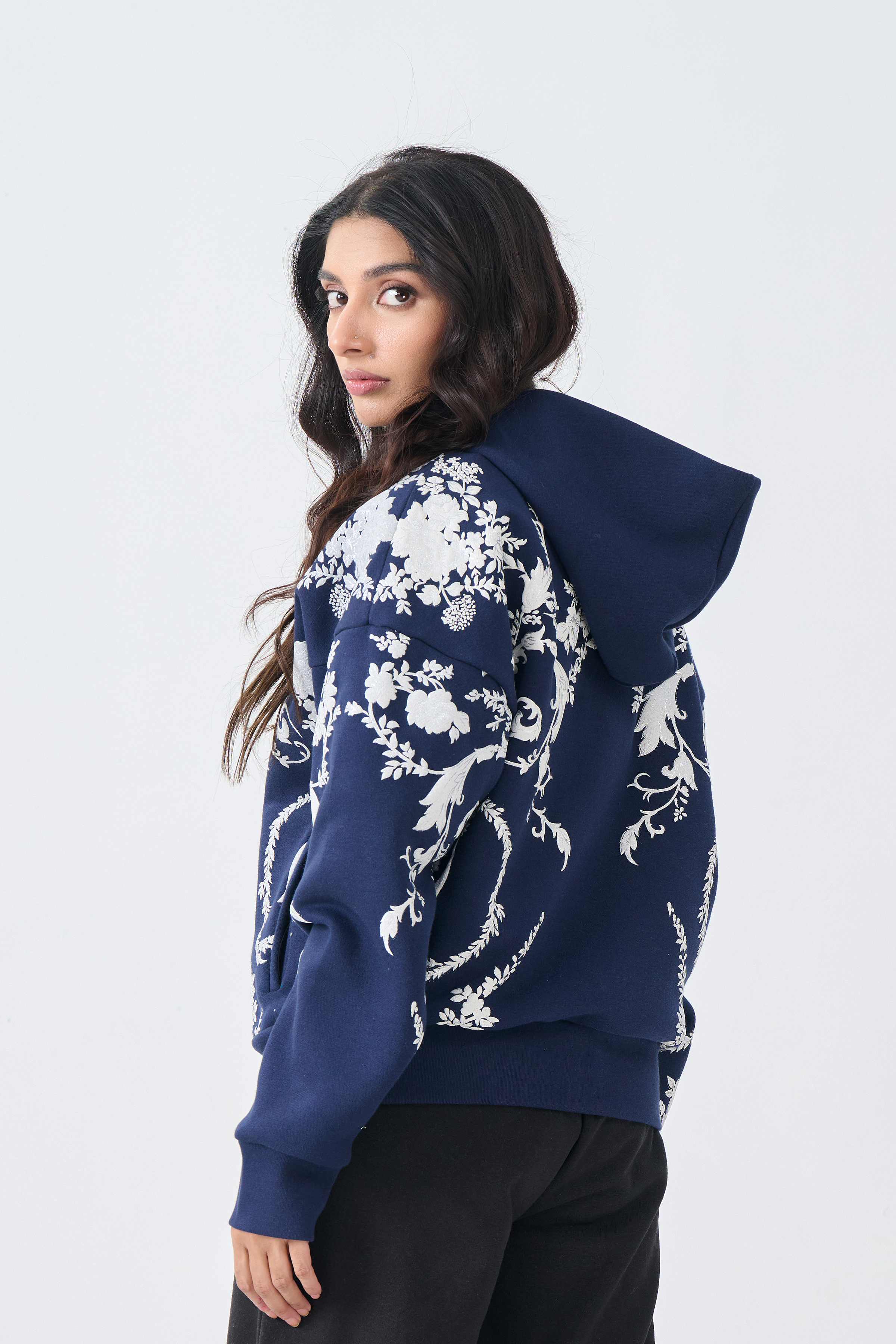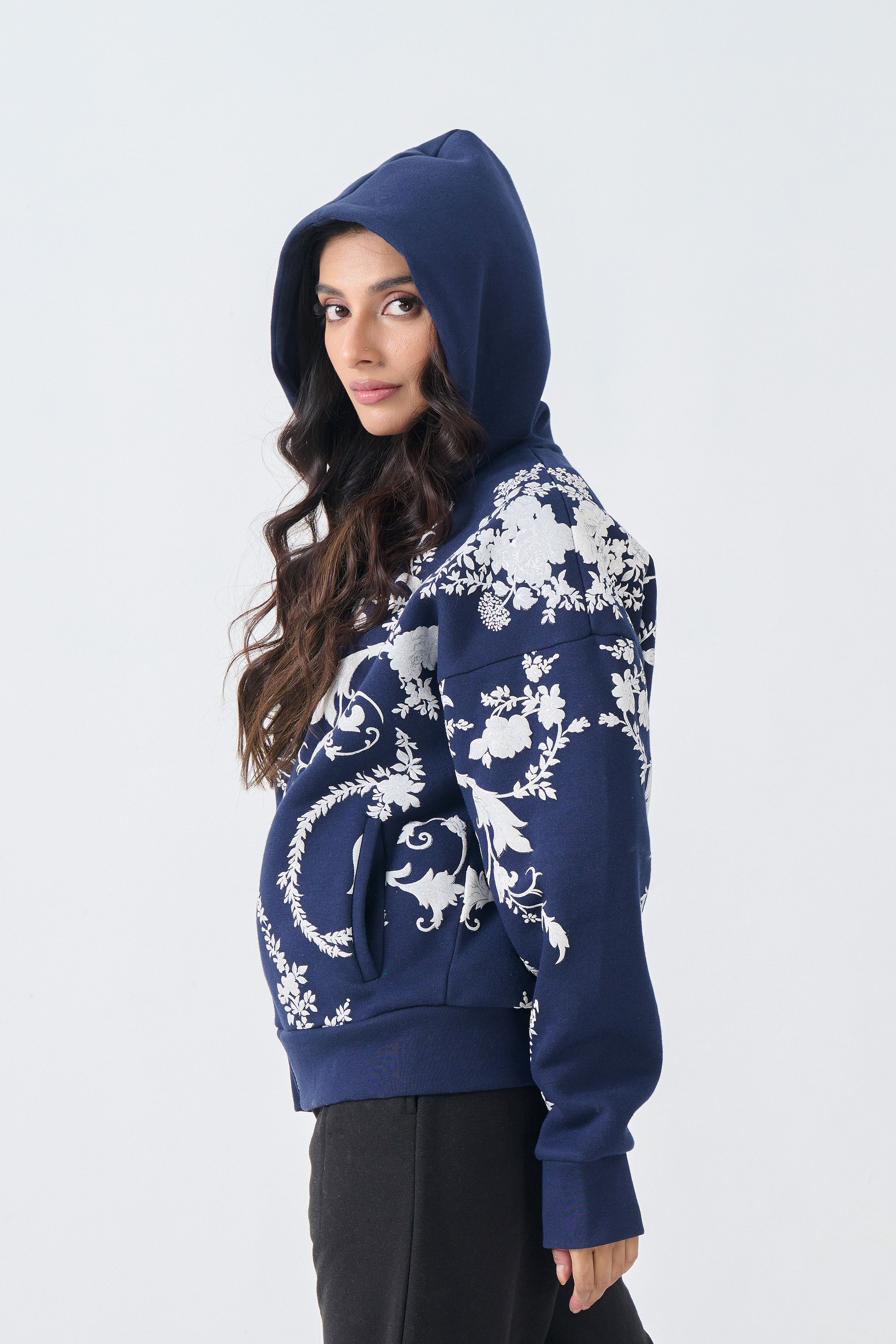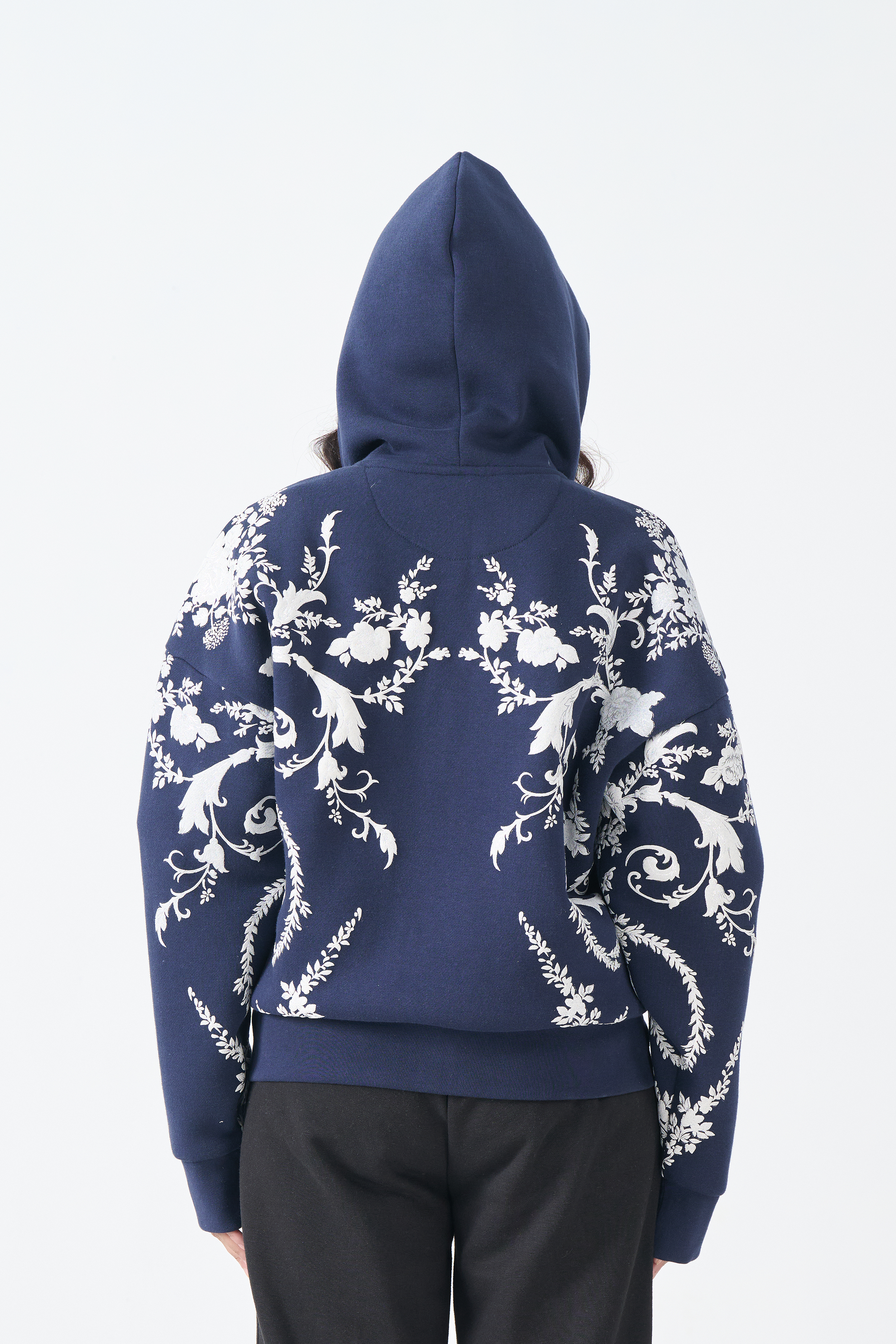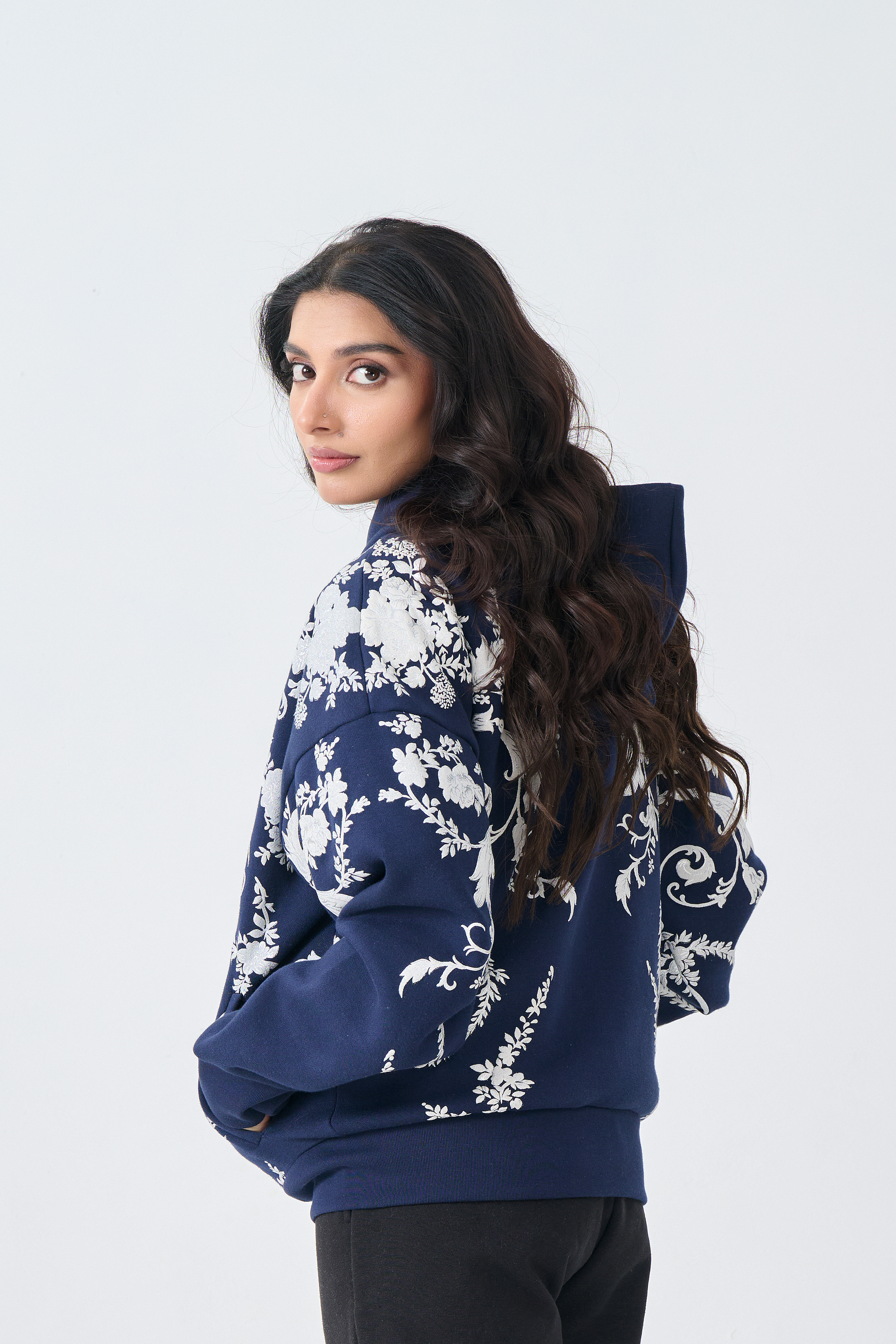 This stylish zip-up hoodie offers warmth and comfort in a rich navy hue, elevated by an intricate embossed print. The silhouette is an Oversized Loose Fit Zipper Hoodie, featuring a full front zipper, dropped shoulders, and a generous hood. It is crafted from a soft Fleece fabric finished with rib-knit cuffs and hem. The color is defined by a deep Navy Blue base which is beautifully embellished with an Emboss Print of foliate scroll motifs in a combination of Off-White and Silver print colors for a striking, textured effect.