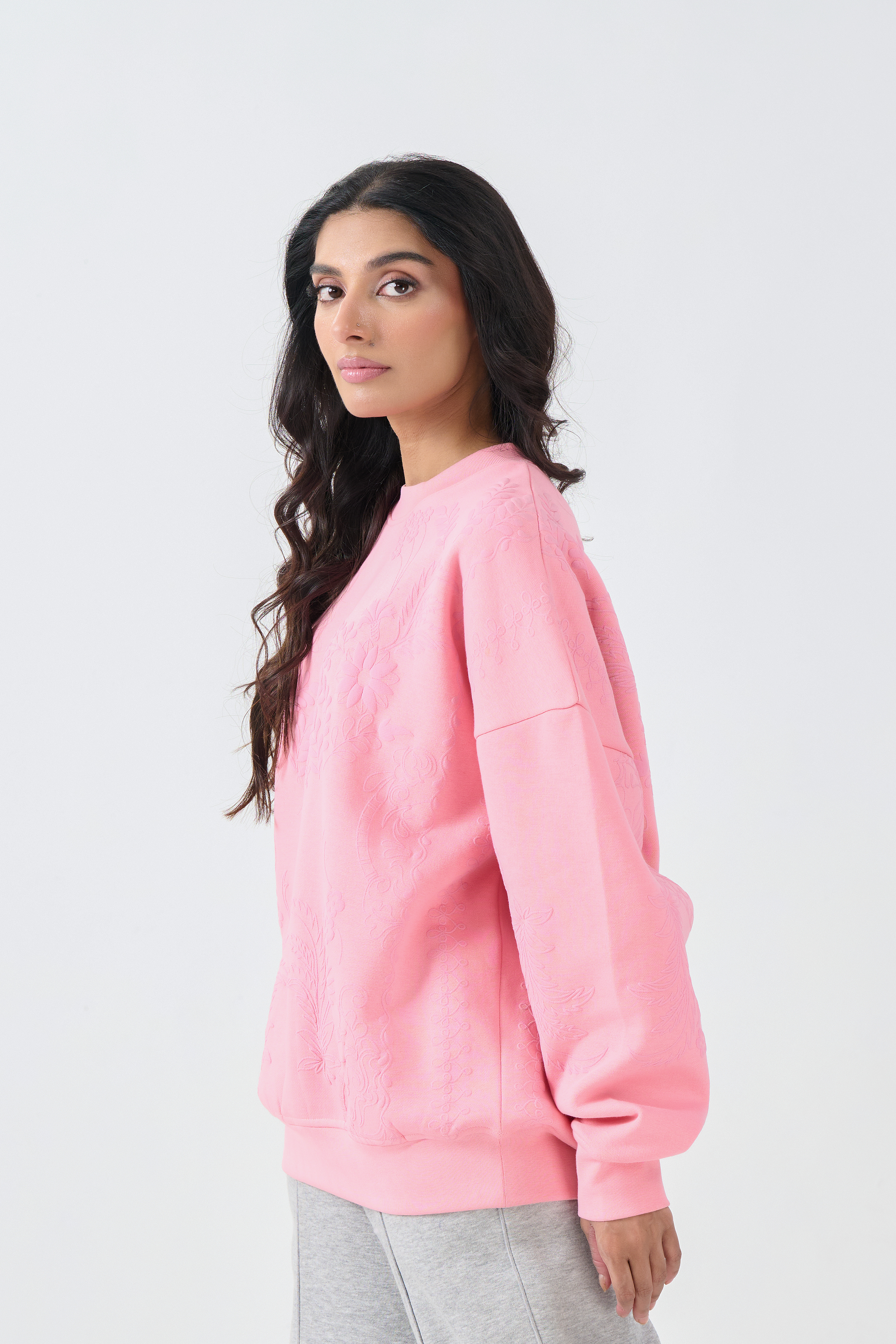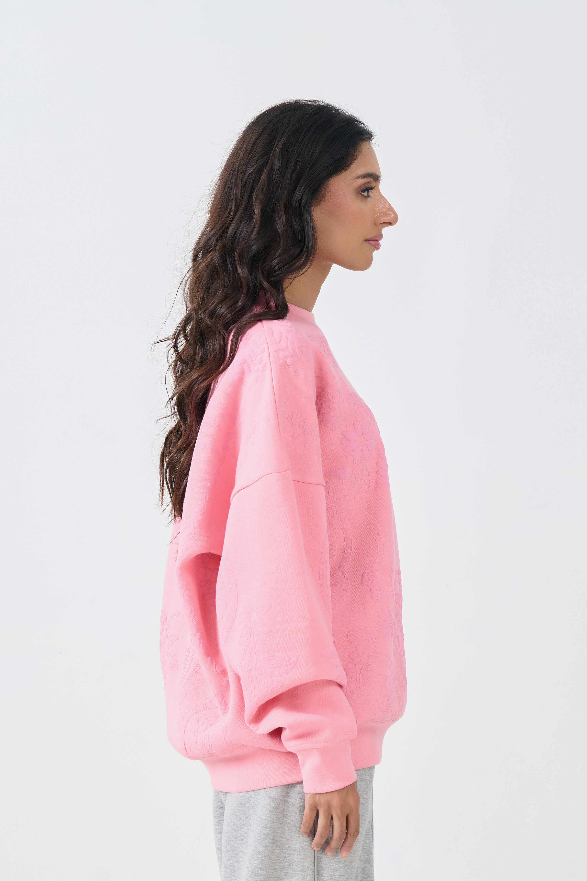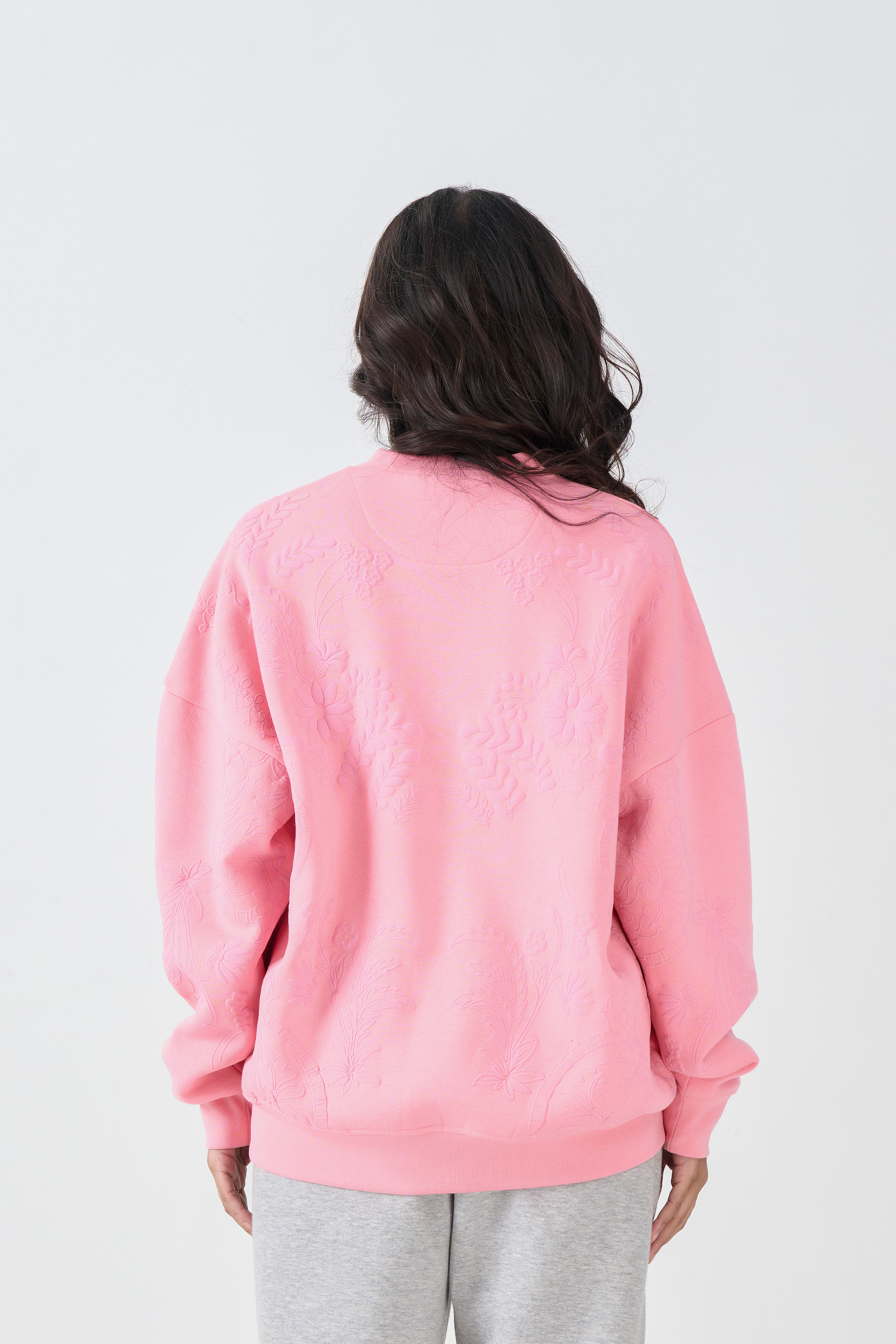 This cozy sweatshirt offers supreme comfort in a soft hue, accented with subtle tone-on-tone texture. The silhouette is a trendy Oversized Loose Fit with dropped shoulders and long sleeves, ensuring maximum comfort and coverage. It is crafted from a soft Fleece fabric finished with rib-knit cuffs and hem. The color is defined by a gentle Pink base which is beautifully embellished with a detailed Emboss Print of floral or botanical motifs, utilizing the self print color for a sophisticated, textured effect.