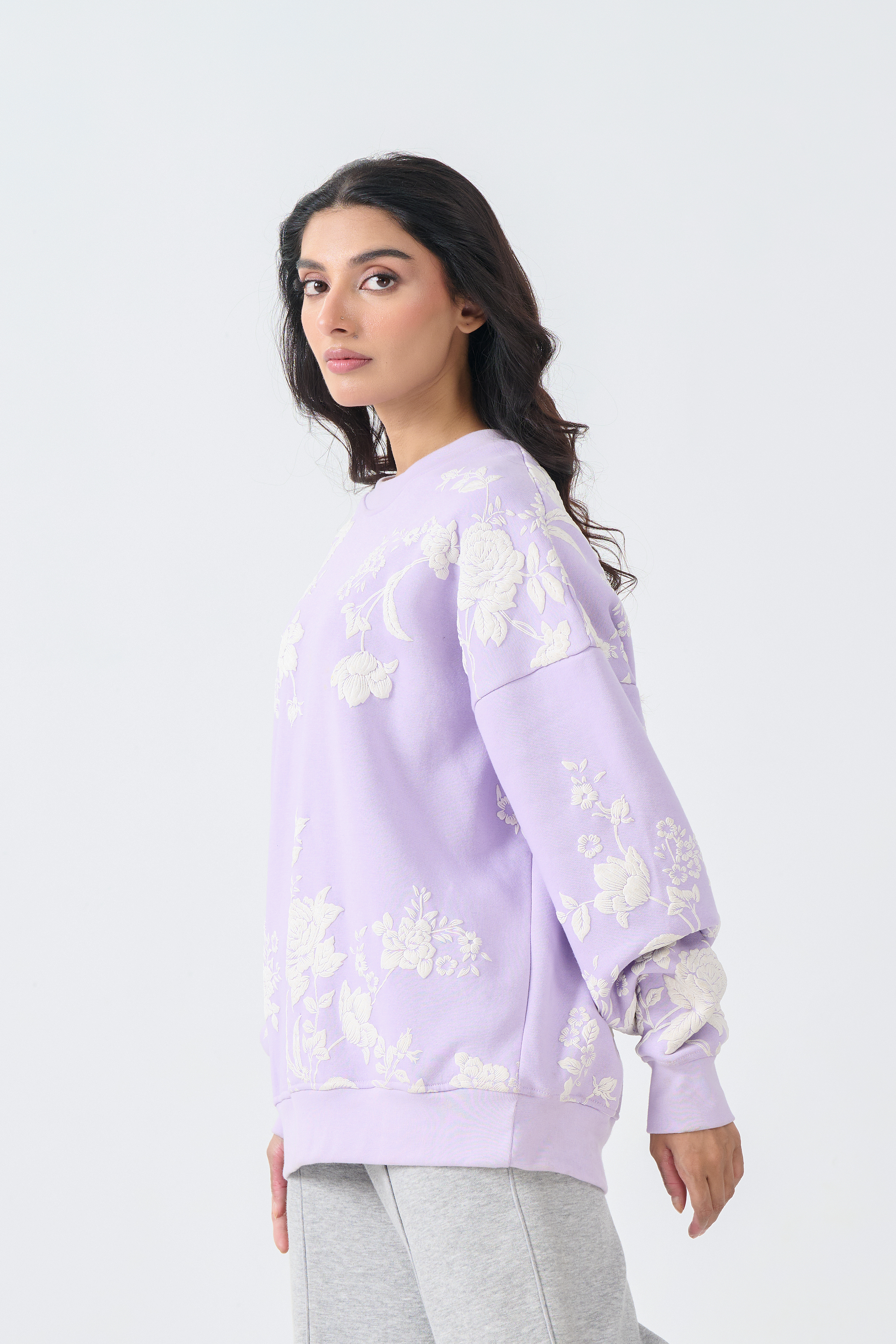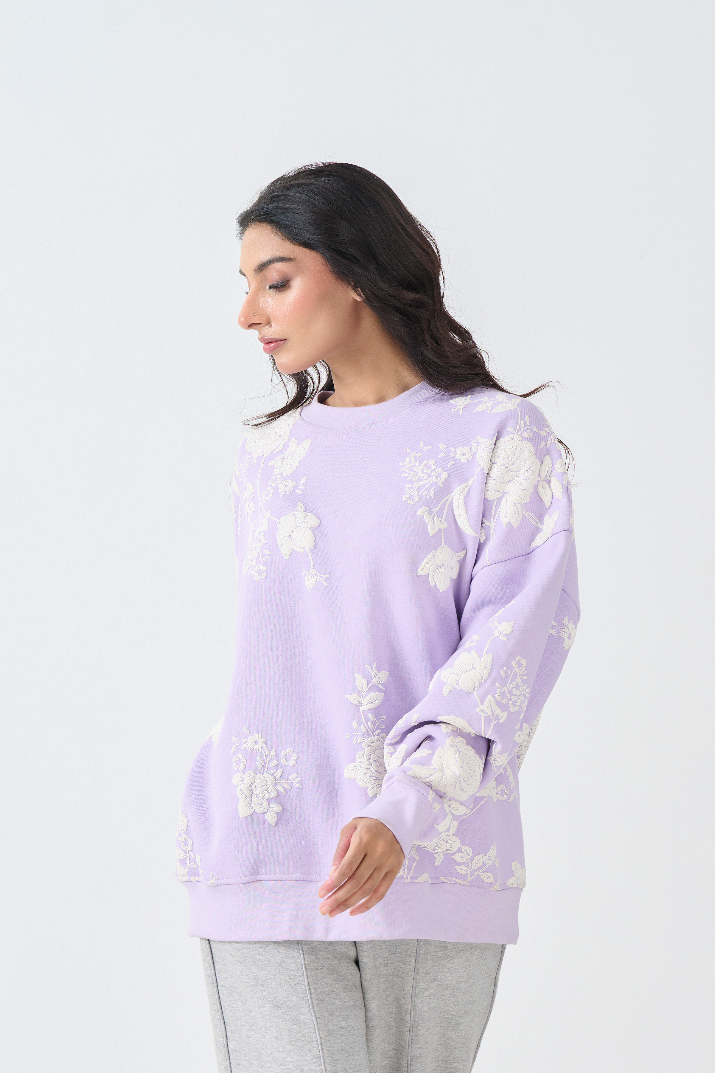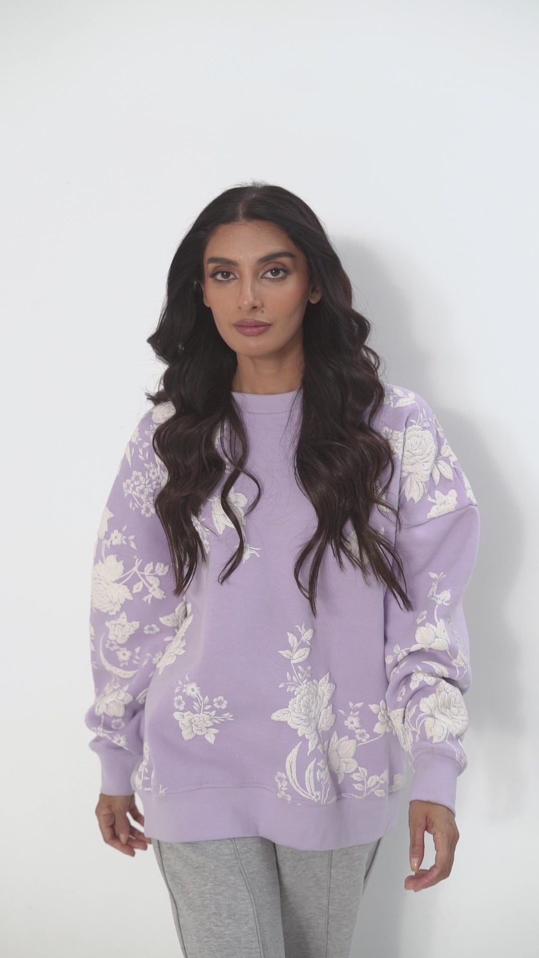 This cozy sweatshirt offers supreme comfort in a soft hue, accented with subtle texture. The silhouette is a trendy Oversized Loose Fit with dropped shoulders and long sleeves, ensuring maximum comfort and coverage. It is crafted from a soft Fleece fabric finished with rib-knit cuffs and hem. The color is defined by a gentle Lilac base which is beautifully embellished with a detailed Emboss Print of white floral or botanical motifs throughout.