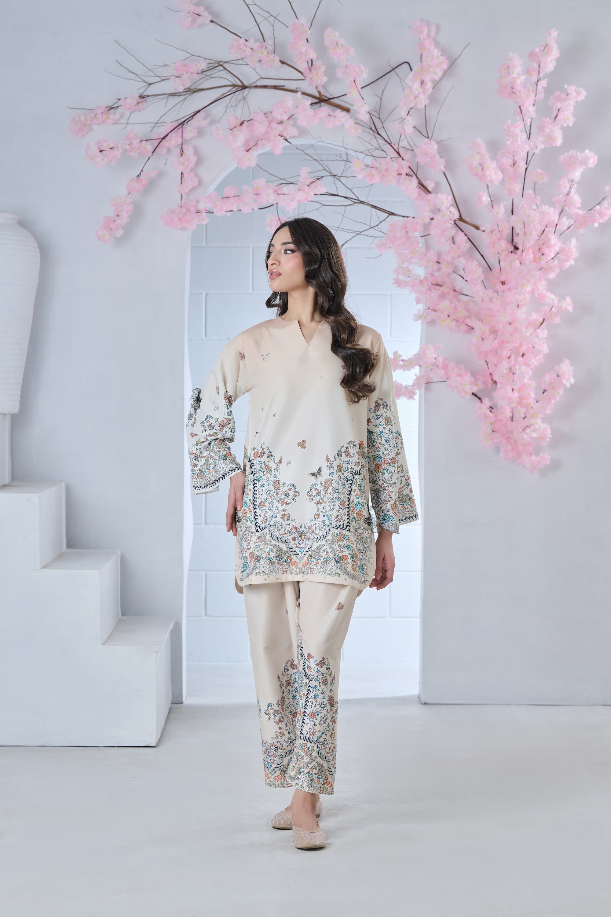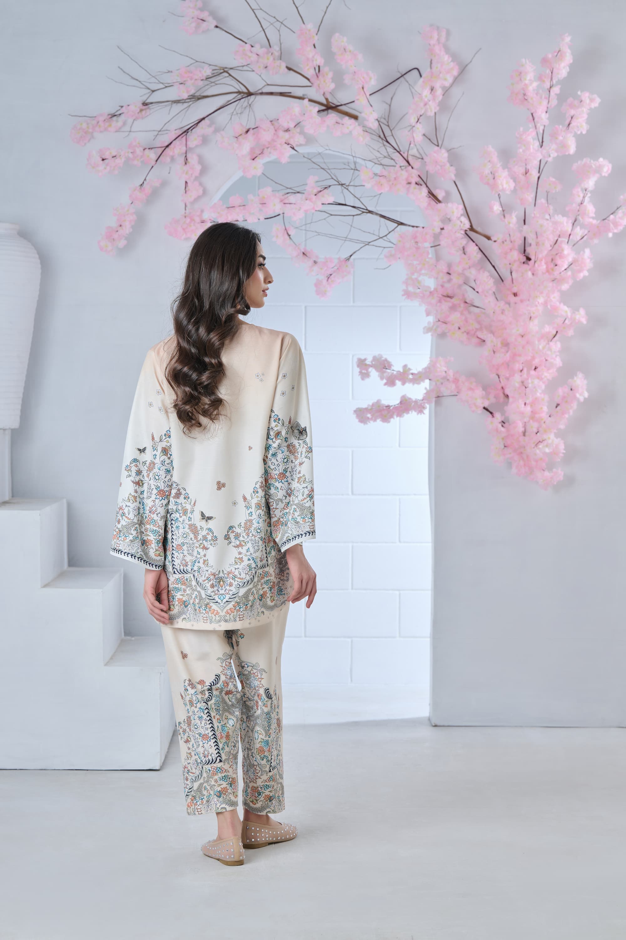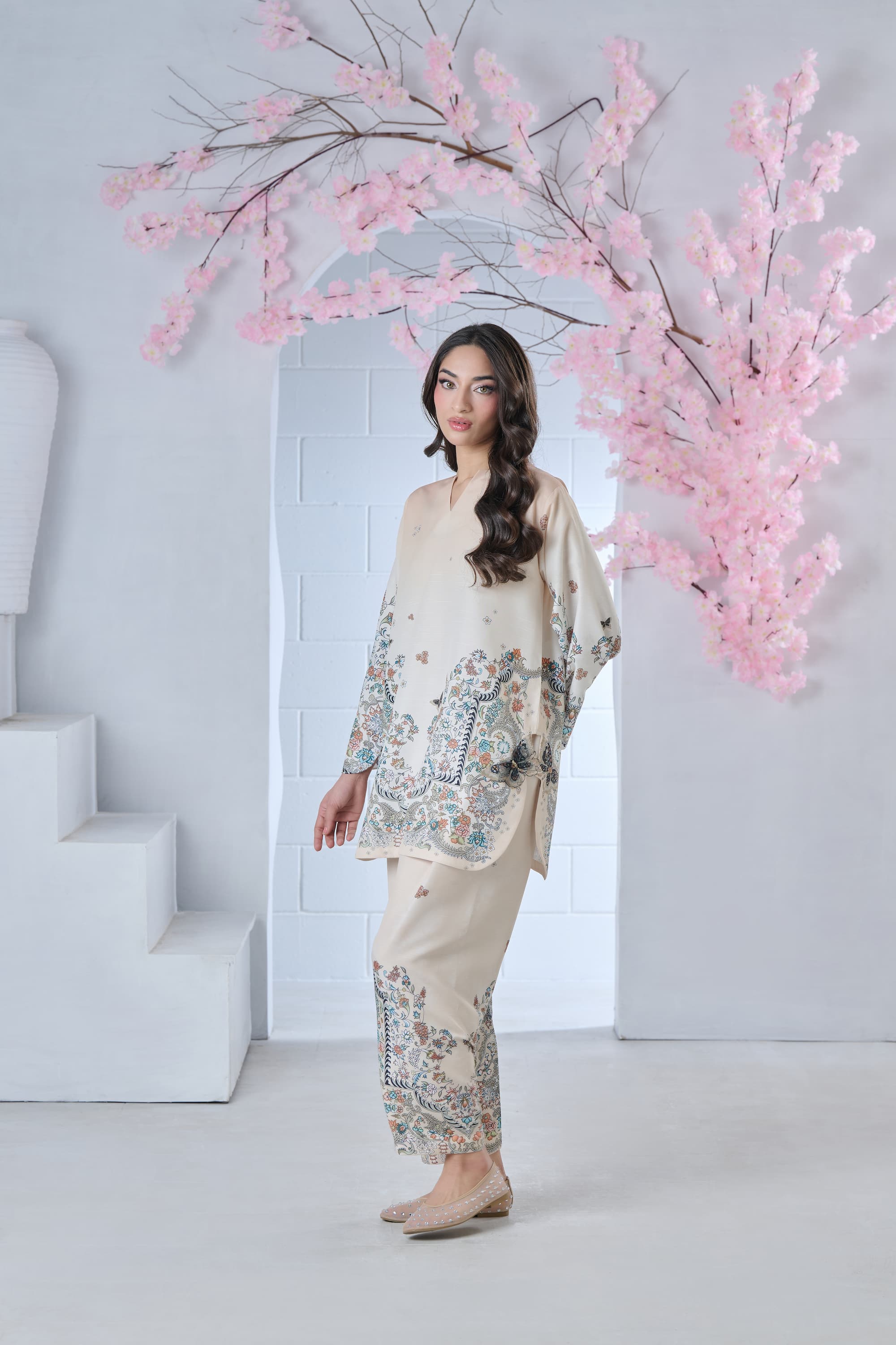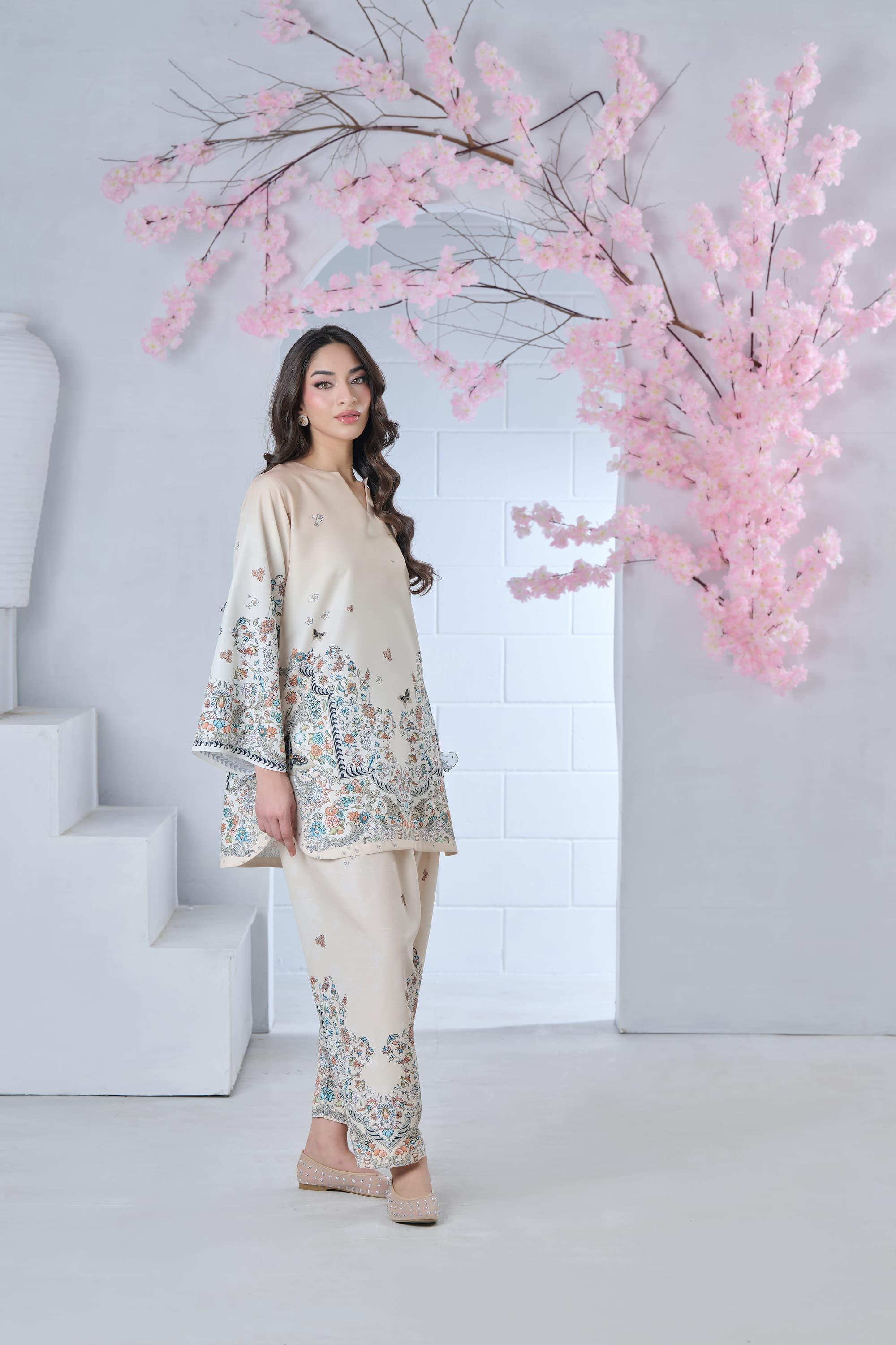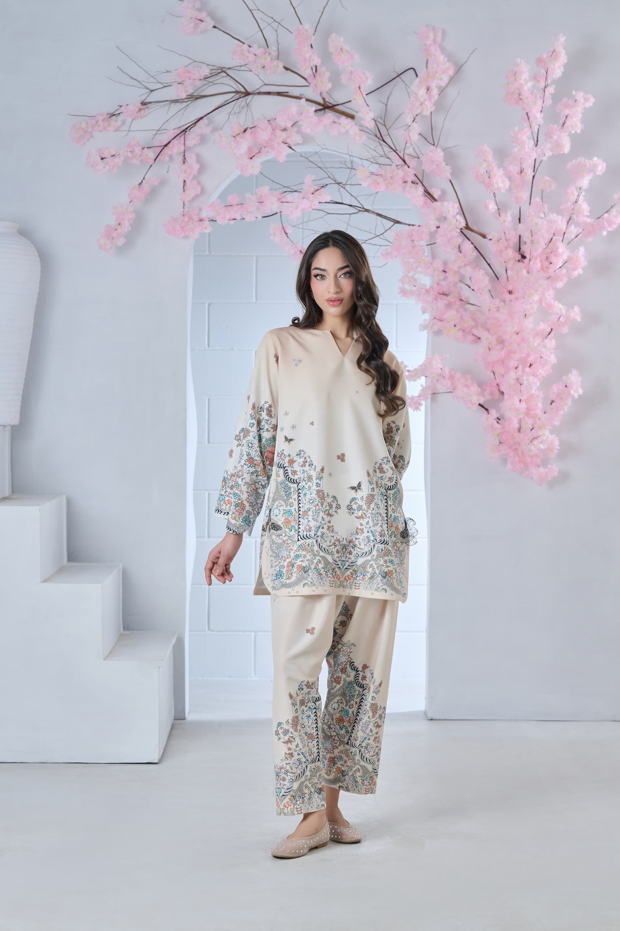 A refined blend of tradition and elegance, this almond-to-cream ombre set is inspired by classic carpet motifs, reimagined with delicate florals and butterflies. 3D embroidered organza butterflies add beautiful dimension, while intricate cutwork on the side slits brings a modern, graceful finish.