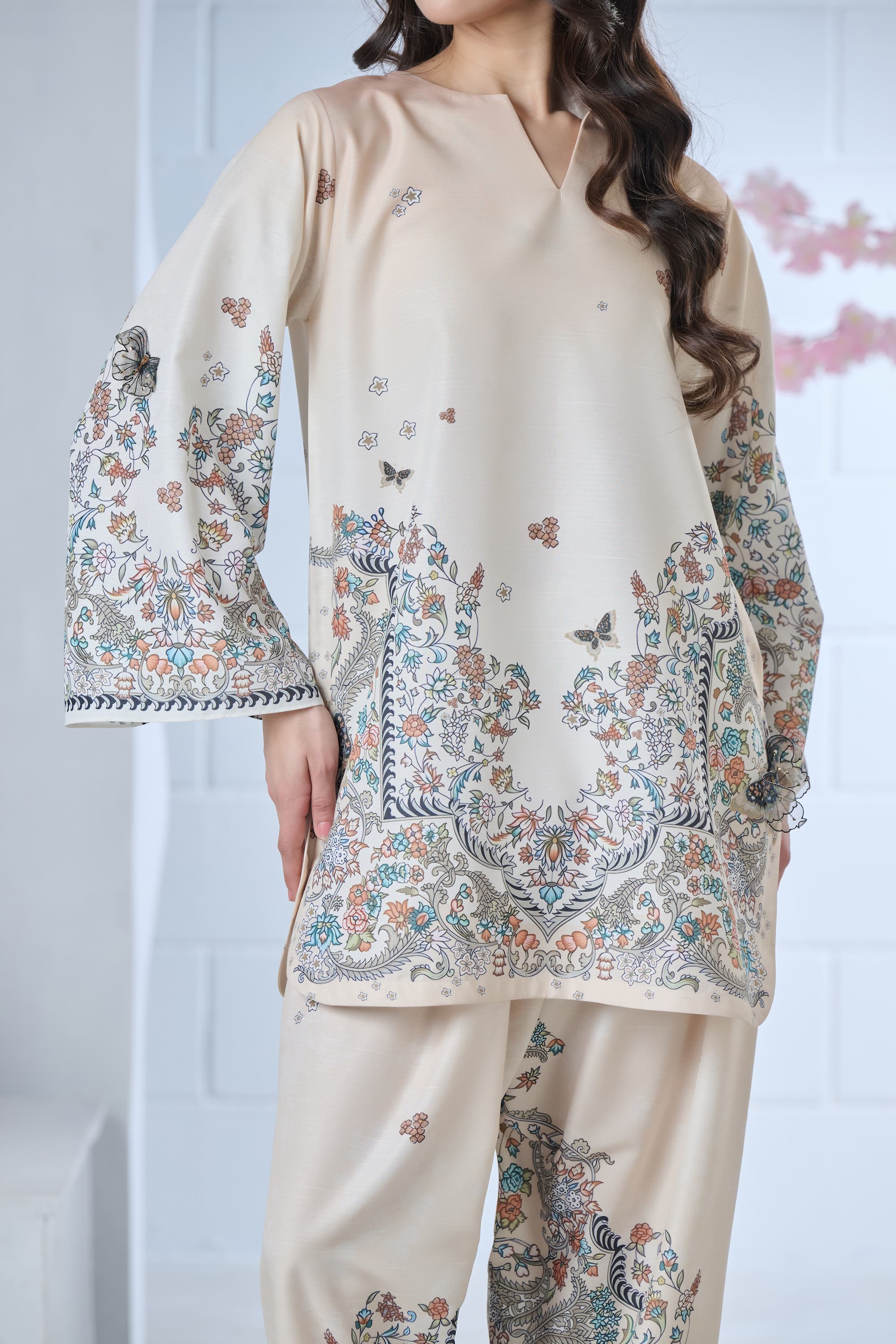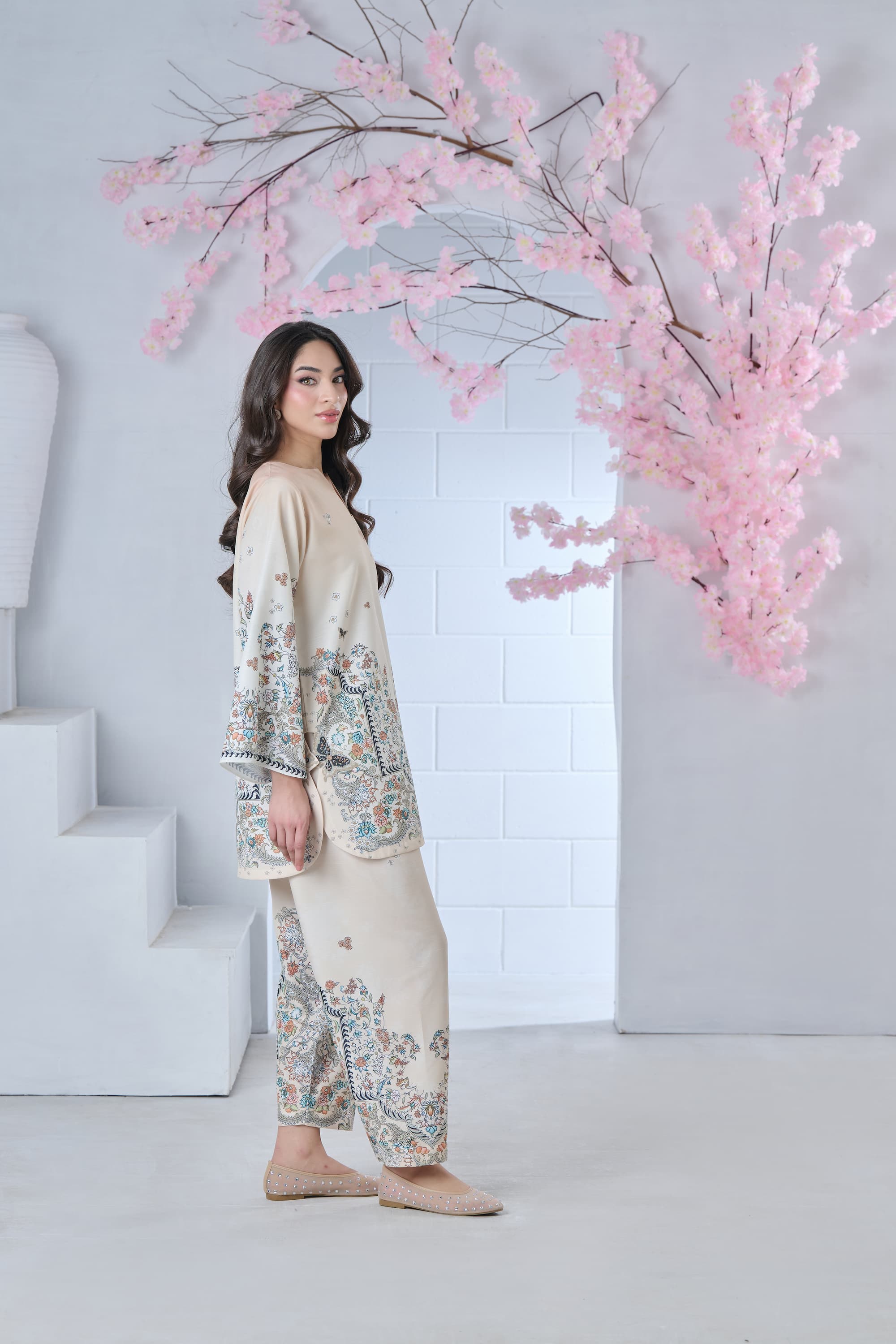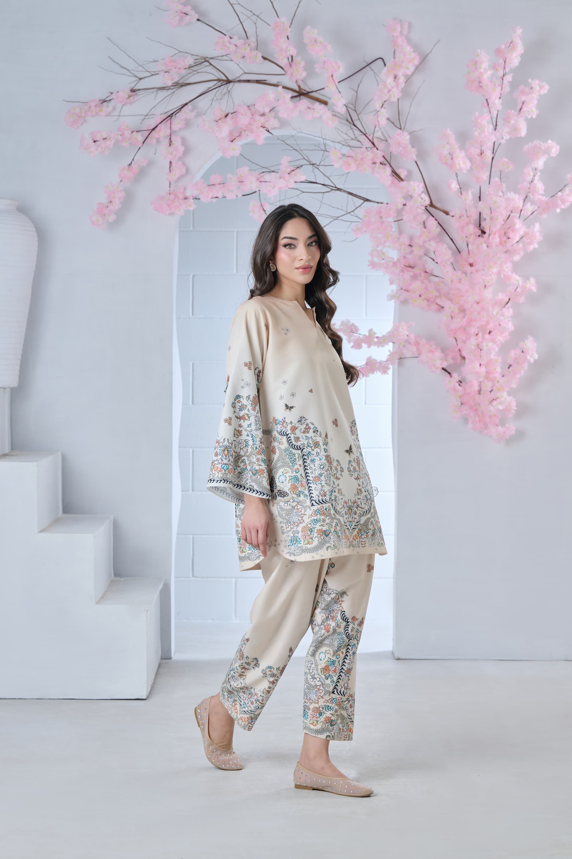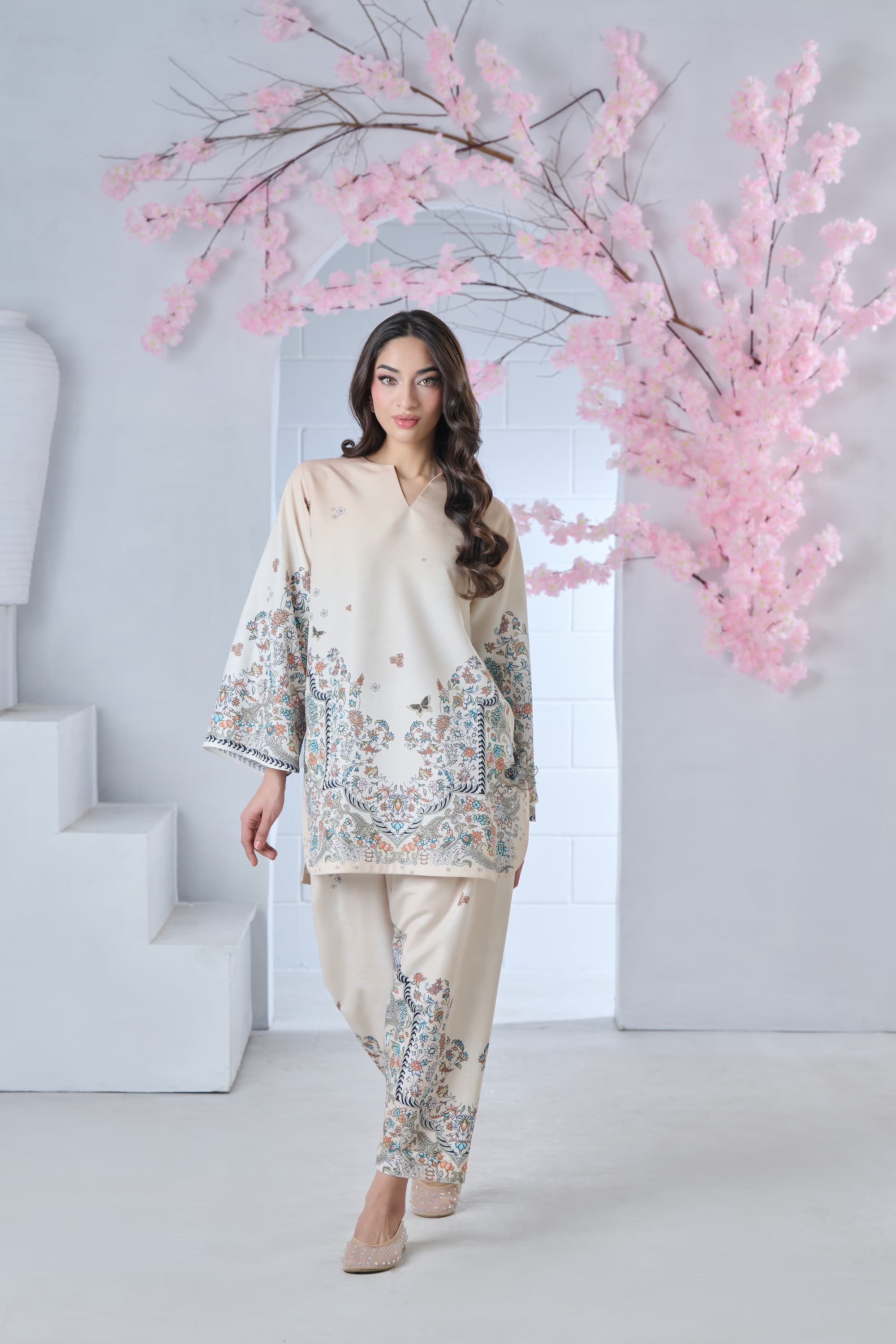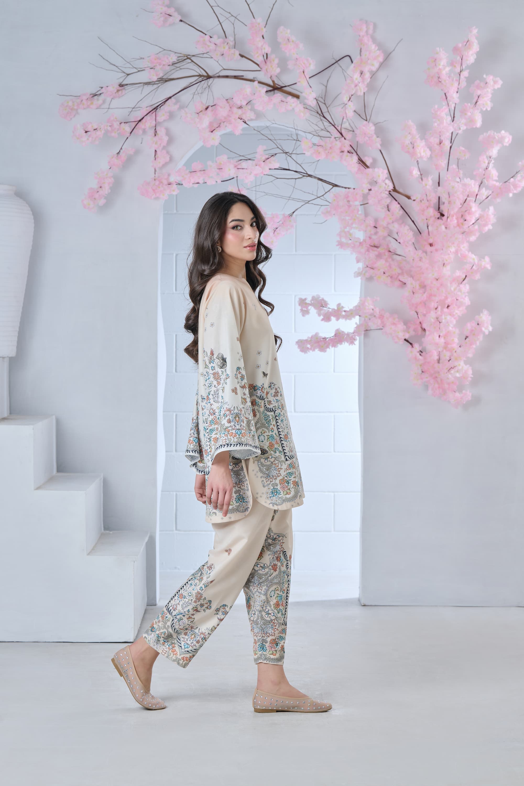 A refined blend of tradition and elegance, this almond-to-cream ombre set is inspired by classic carpet motifs, reimagined with delicate florals and butterflies. 3D embroidered organza butterflies add beautiful dimension, while intricate cutwork on the side slits brings a modern, graceful finish.