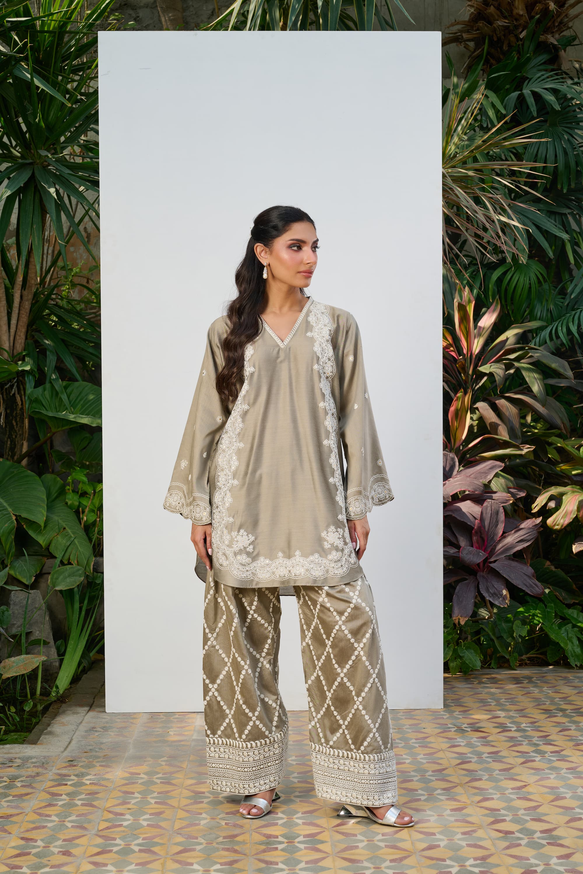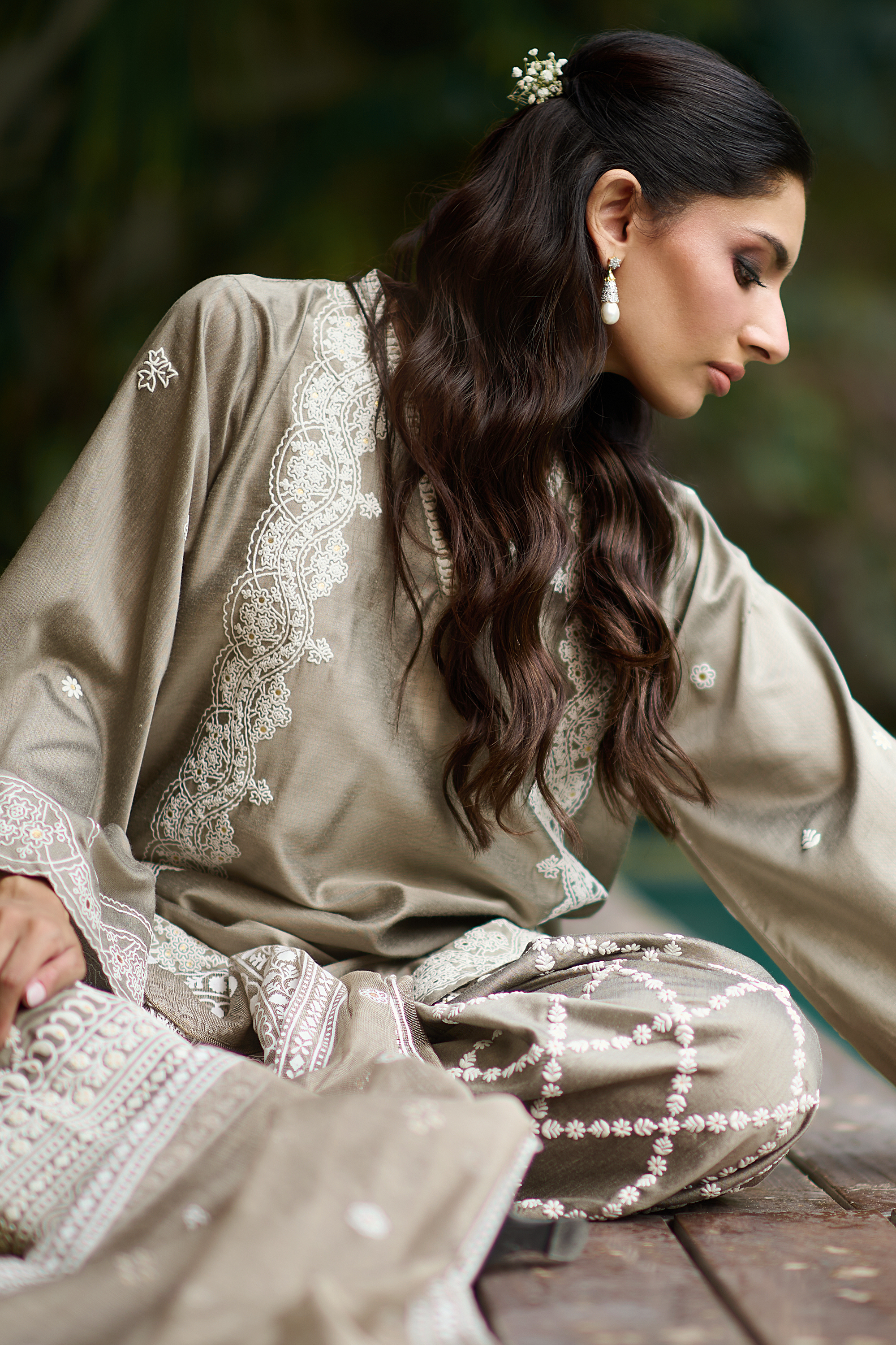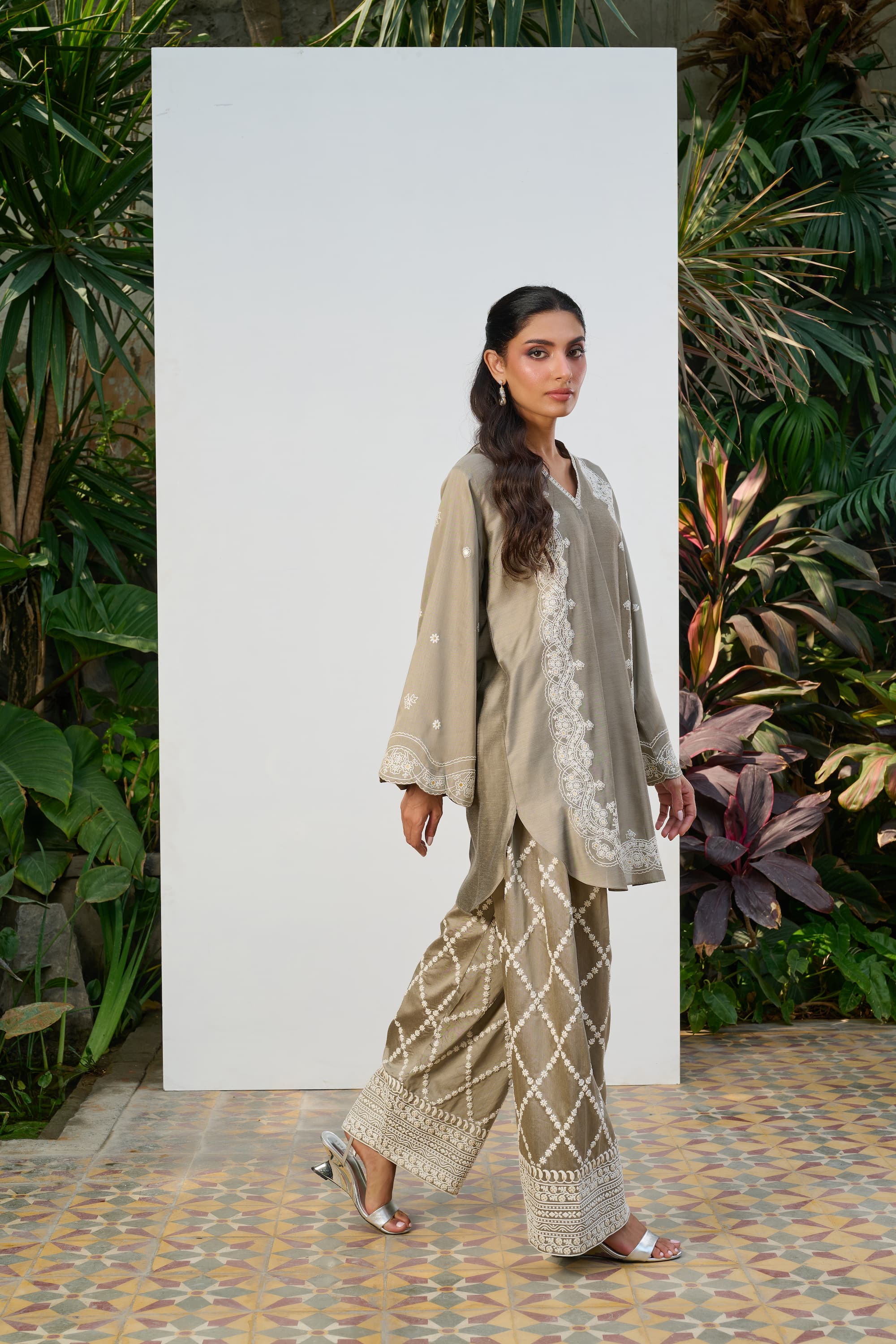 The shirt is beautifully detailed with intricate patterns and soft tonal artistry, creating a graceful flow across the fabric. Thoughtfully finished hems and sleeves add depth and sophistication, making it perfect for intimate festivities and celebratory gatherings. Paired with coordinated bottoms that echo the design language of the shirt, the look feels cohesive and polished. A matching cotton net dupatta, adorned with complementary screen print detailing, completes the ensemble—adding lightness, texture, and a refined festive finish.