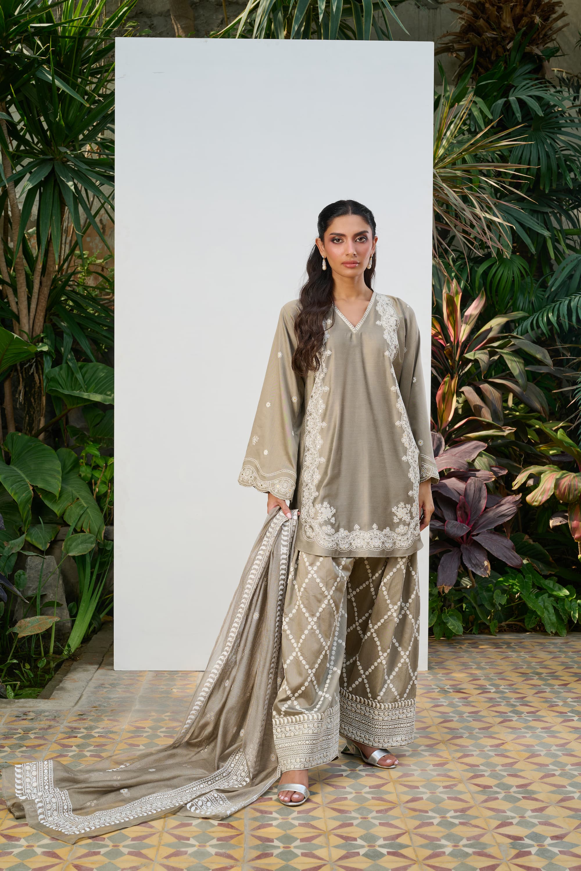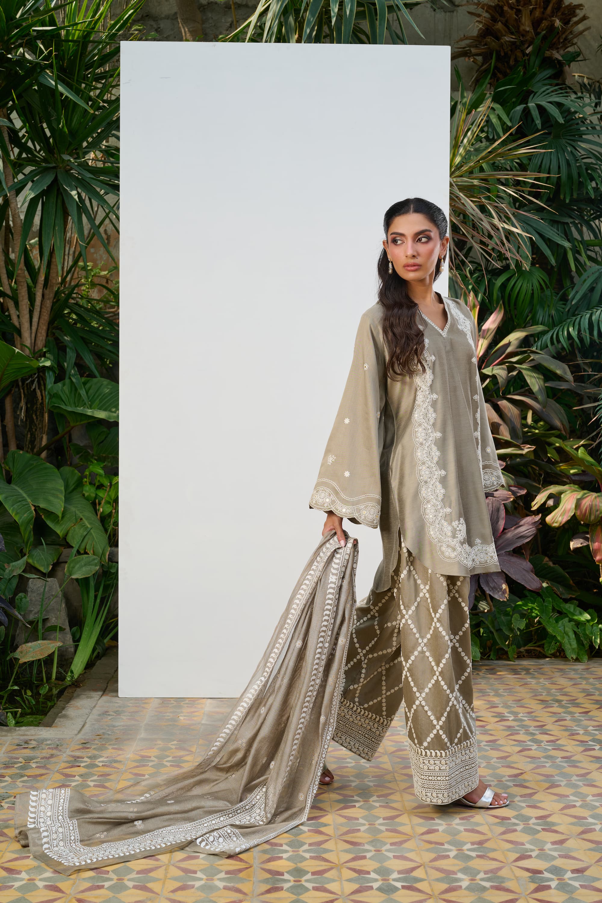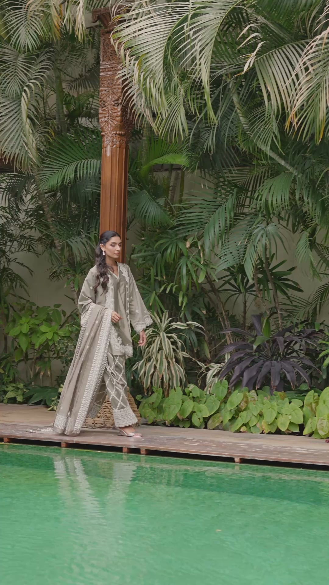 The shirt is beautifully detailed with intricate patterns and soft tonal artistry, creating a graceful flow across the fabric. Thoughtfully finished hems and sleeves add depth and sophistication, making it perfect for intimate festivities and celebratory gatherings. Paired with coordinated bottoms that echo the design language of the shirt, the look feels cohesive and polished. A matching cotton net dupatta, adorned with complementary screen print detailing, completes the ensemble—adding lightness, texture, and a refined festive finish.