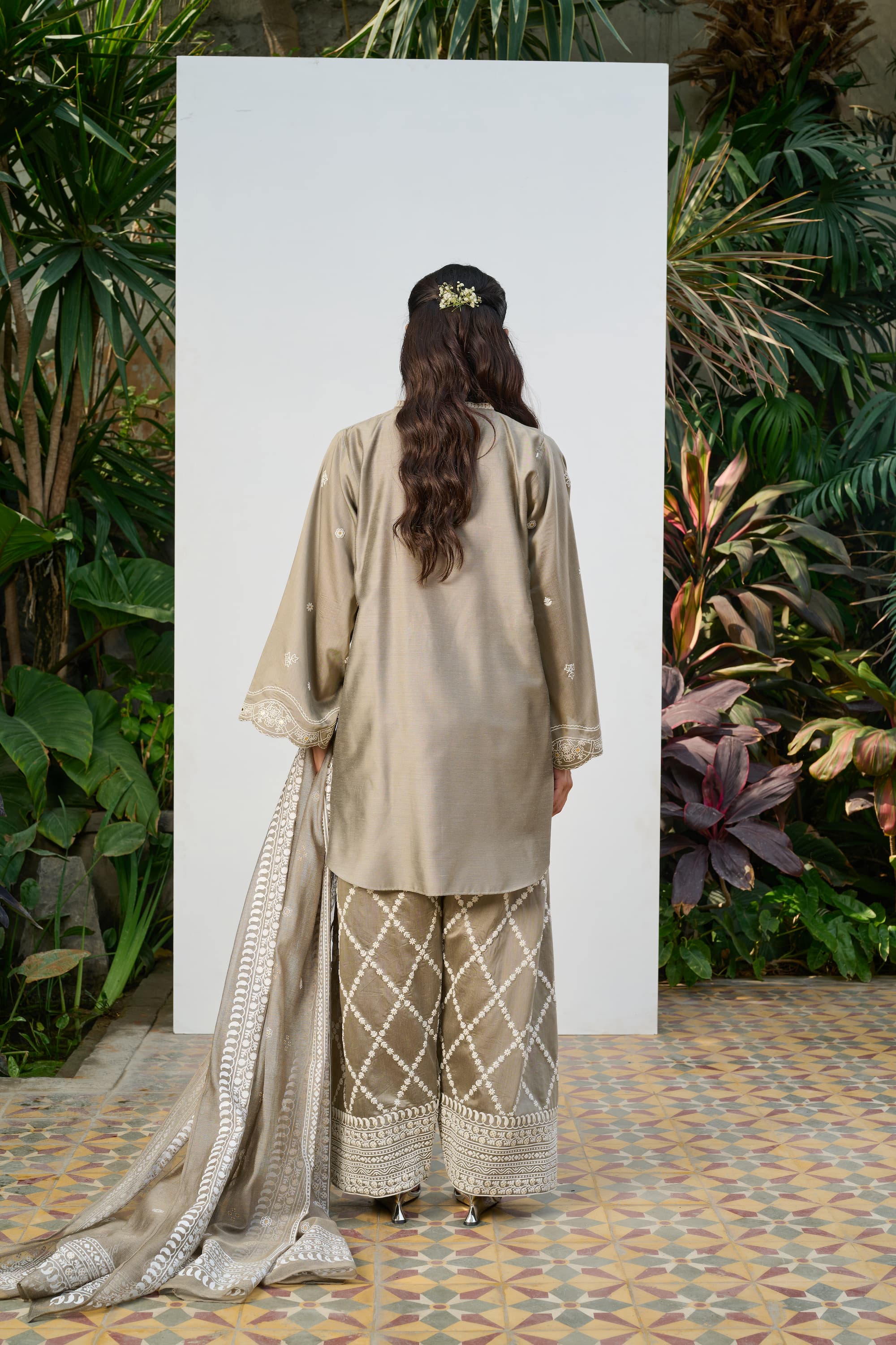 Refined and effortlessly festive, this grey hand screen printed co-ord set is a statement in understated elegance. Designed with a harmonious balance of tradition and modernity, the ensemble features delicate off-white puff print that adds texture and contrast with gold paste highlights.