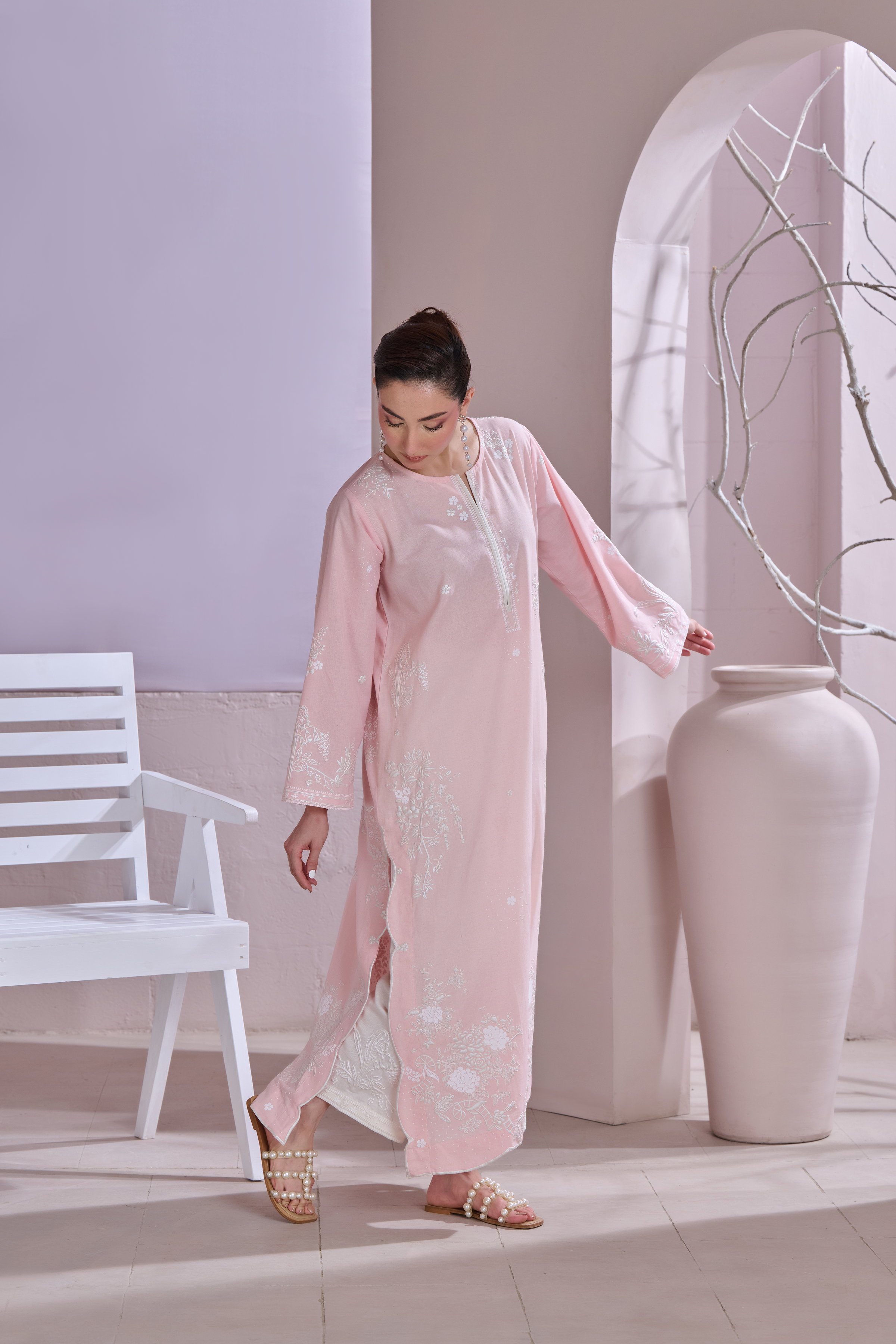 Description: This kaftan shirt features a soft blush pink base with relaxed, comfortable fit. It’s decorated with light Off White and pearl floral prints that add a delicate touch. The pearl detailing is embossed, giving the fabric a nice mix of smooth and raised textures for subtle contrast. Overall, it’s a stylish and easy-to-wear piece with gentle, elegant details on shirt and trousers.