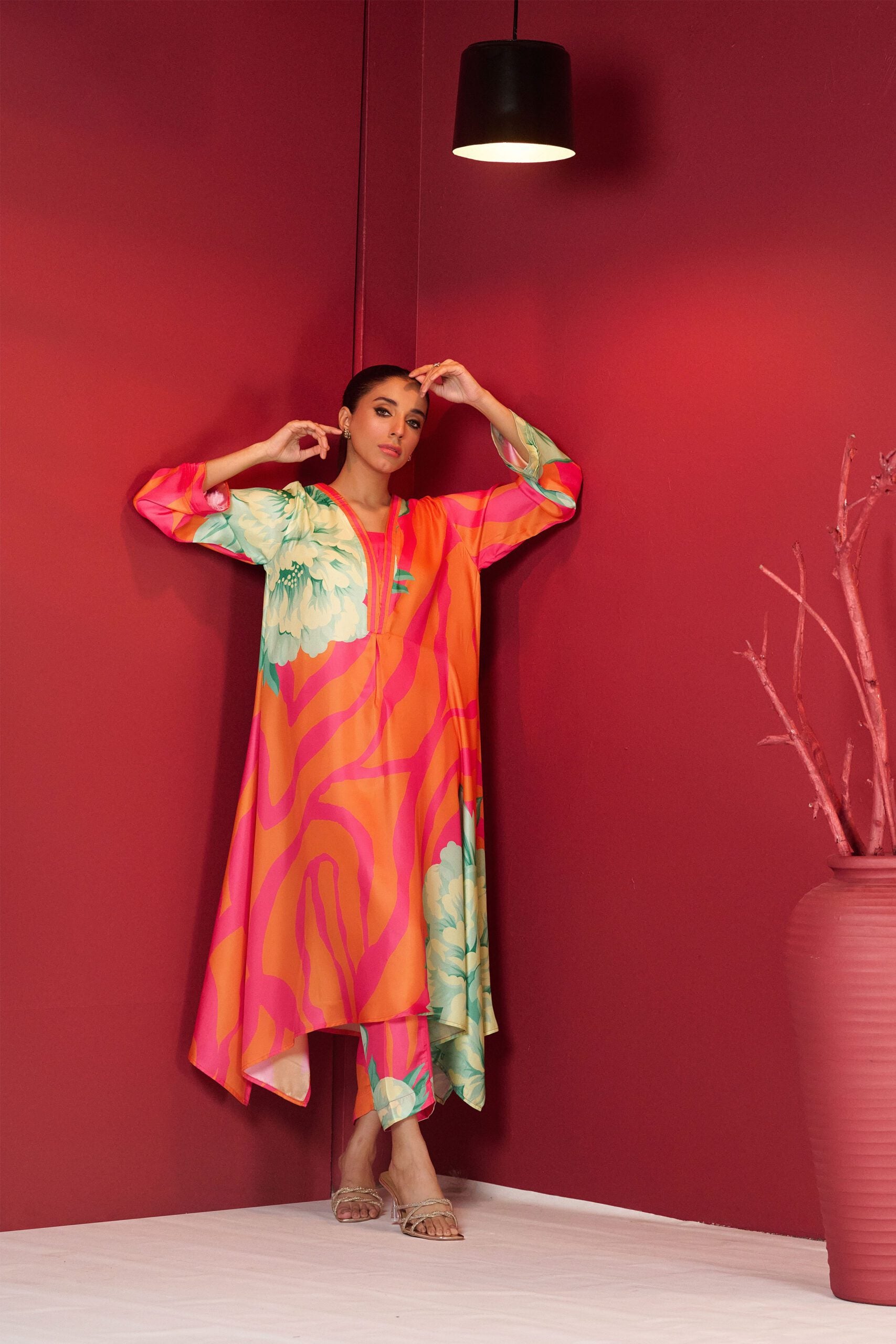 Drape yourself in pink and orange cord set – a classic outfit that speaks volumes in style.